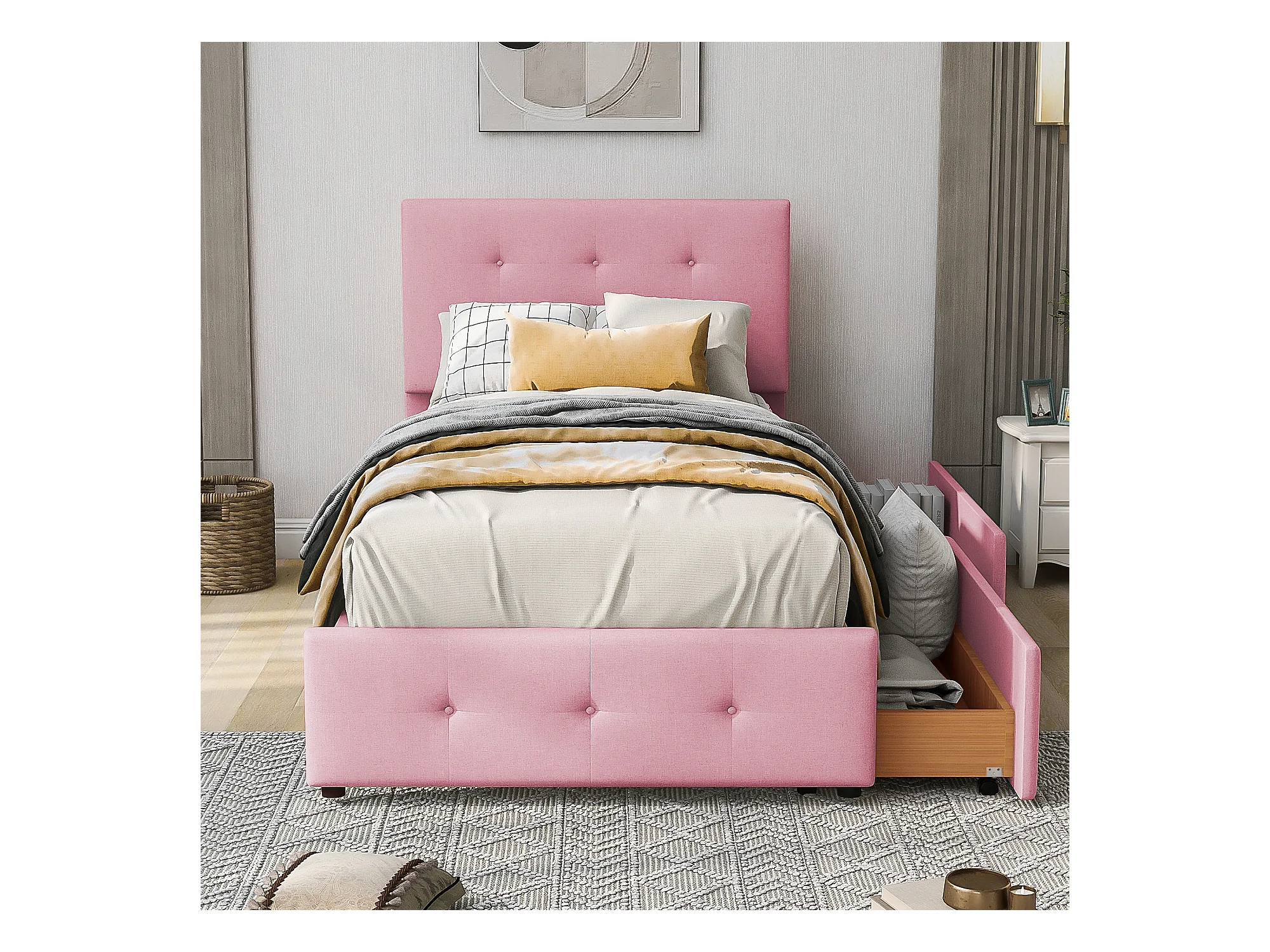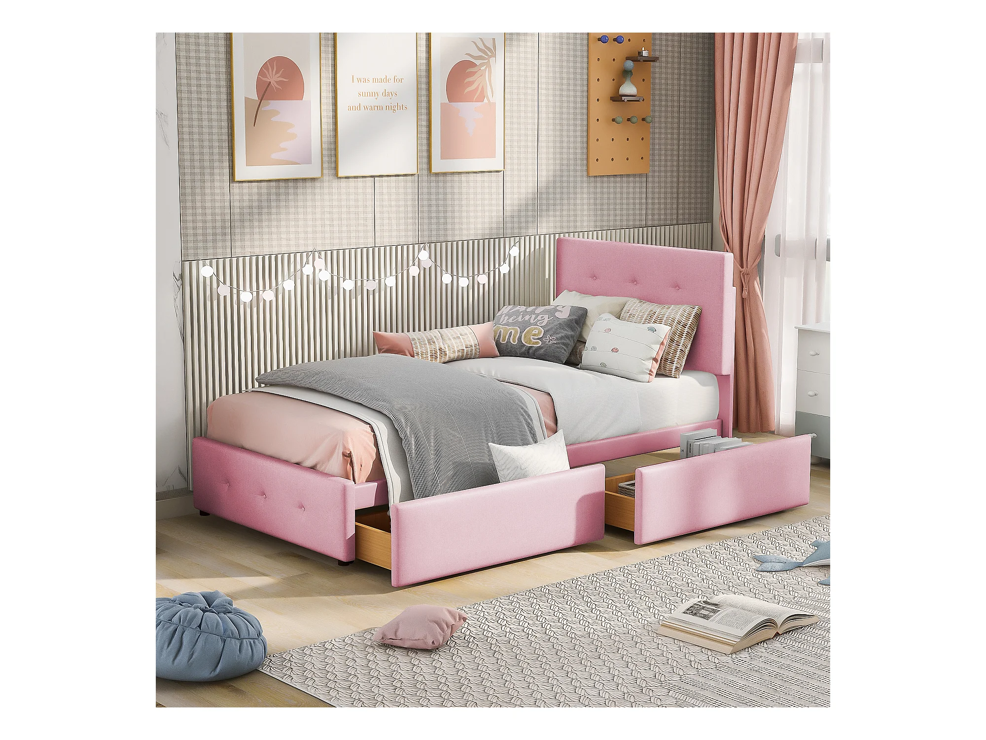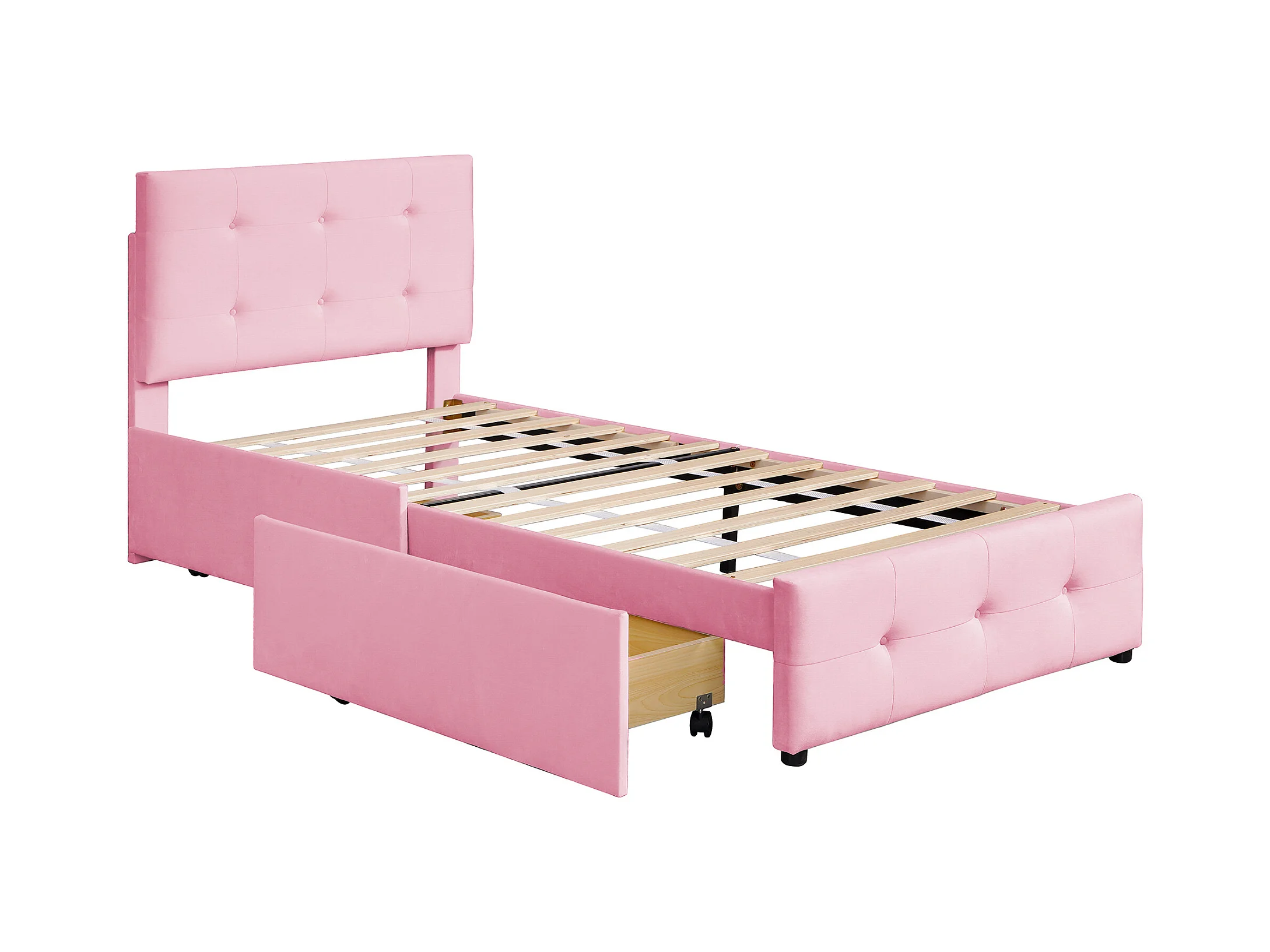 Lit enfant 90 x 200 cm - Lit ado avec 2 tiroirs et dossier - velours rose - sans matelas
