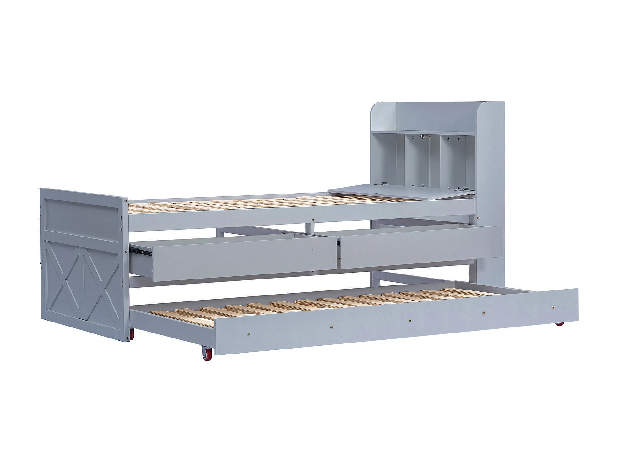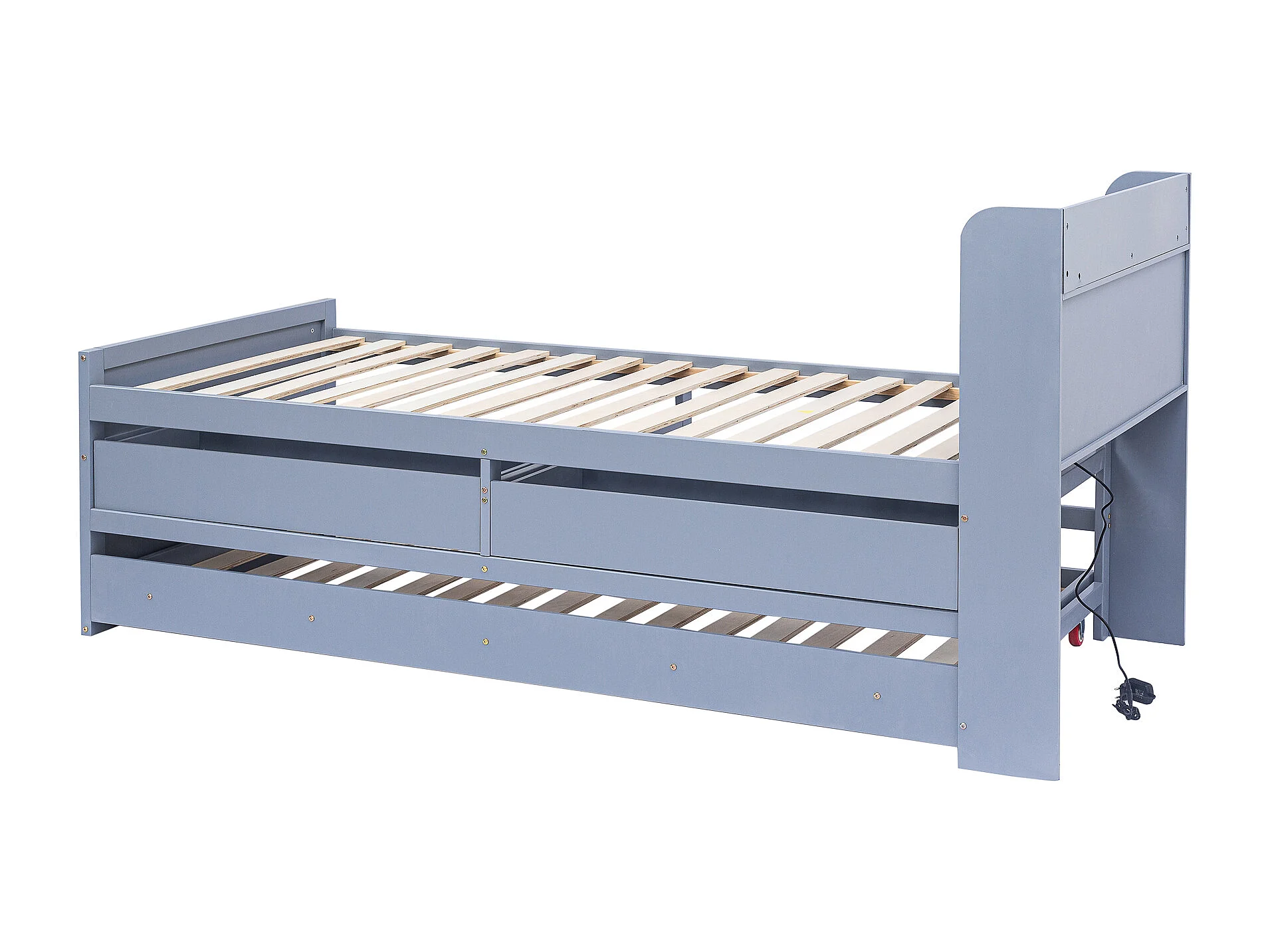 Lit enfant 90x190 cm en bois avec USB, avec lit gigogne et tiroirs, tête de lit de rangement, gris, sans matelas