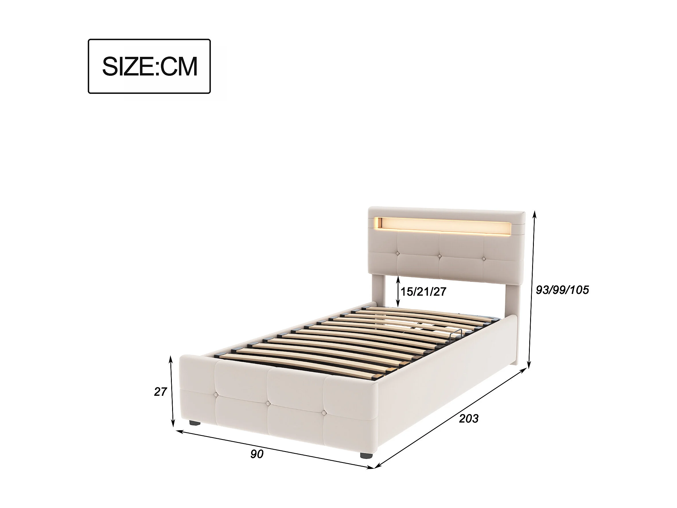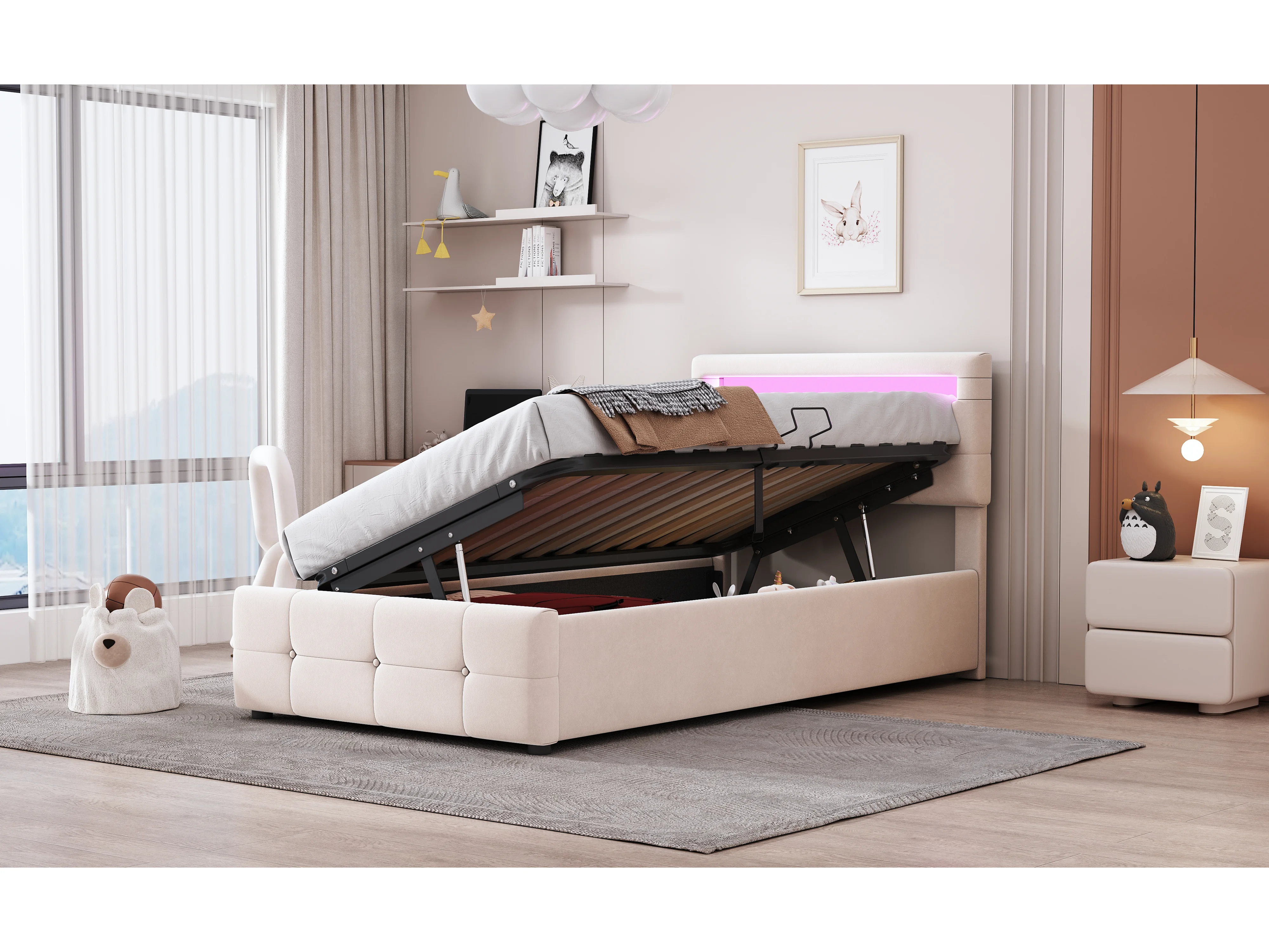 Lit enfant 90x200 cm avec éclairage LED, lit de rangement hydraulique, tête de lit réglable, velours beige