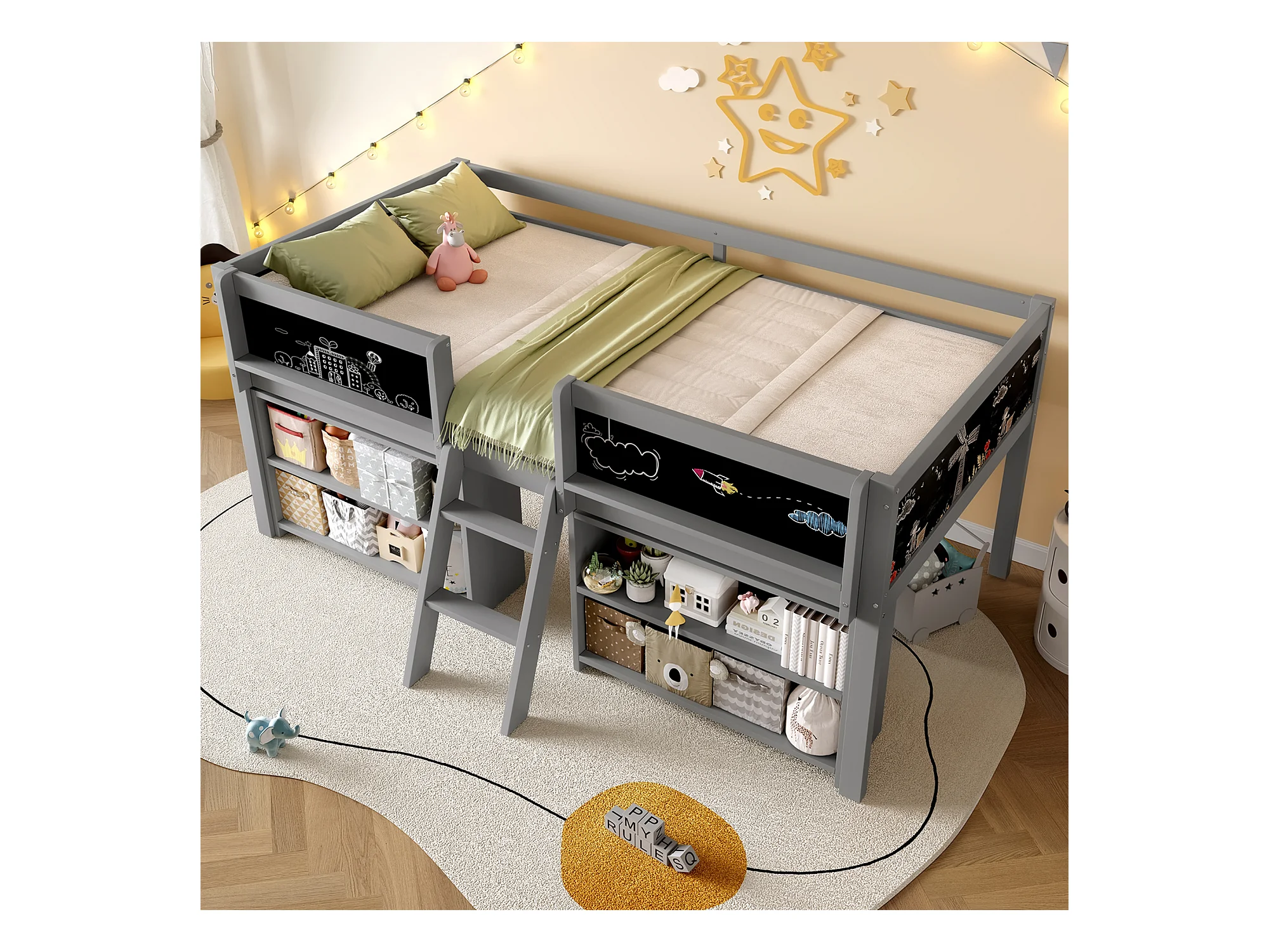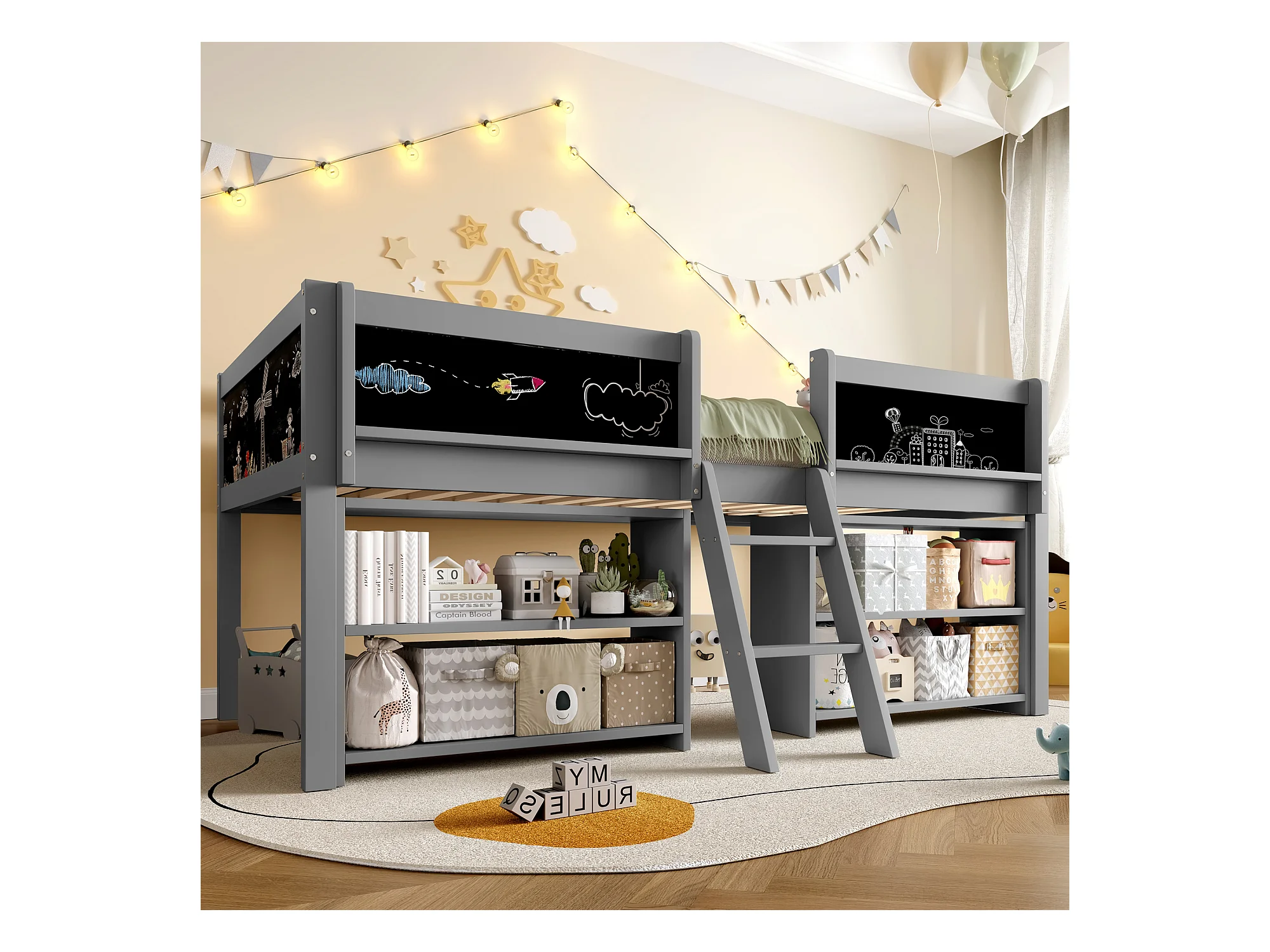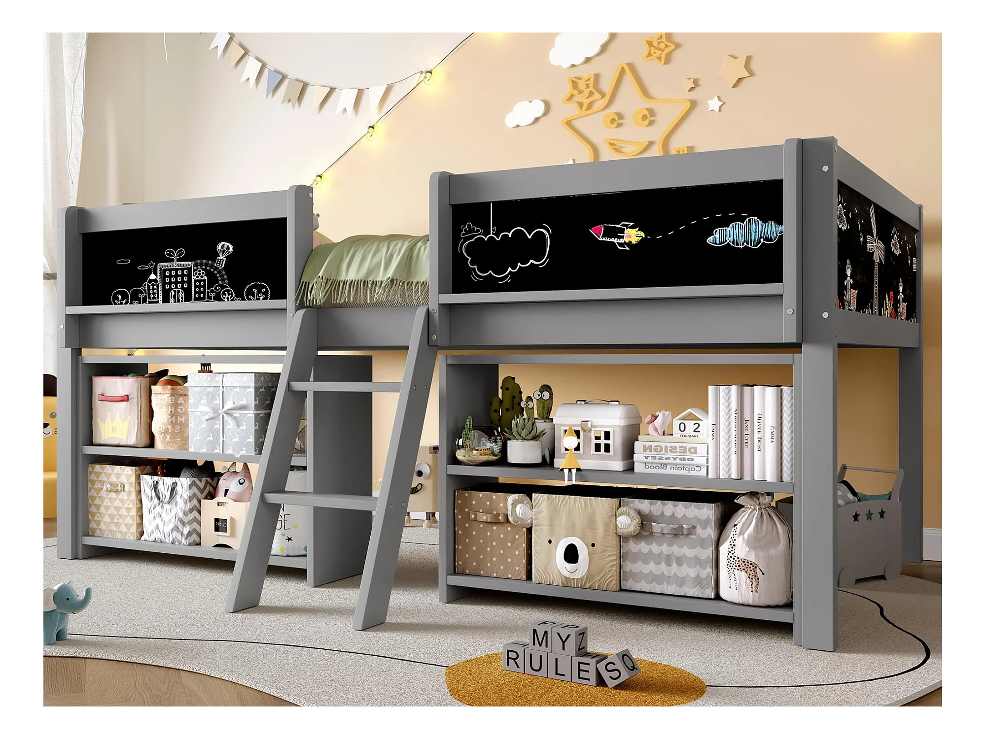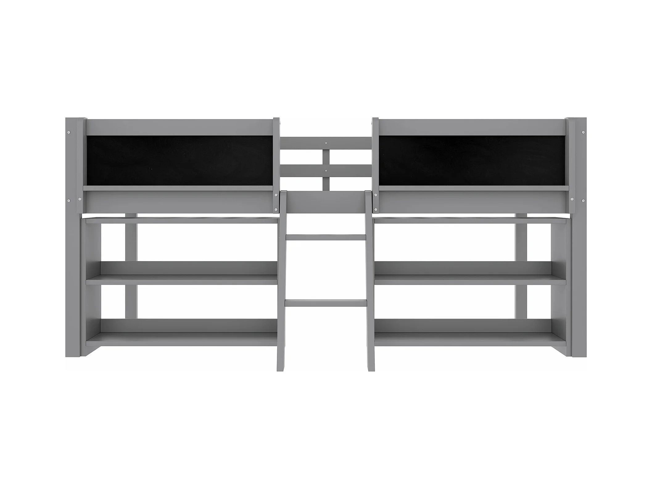 Lit enfant 90x200 cm - avec étagère de rangement - avec barrières + échelle - gris (matelas non inclus)