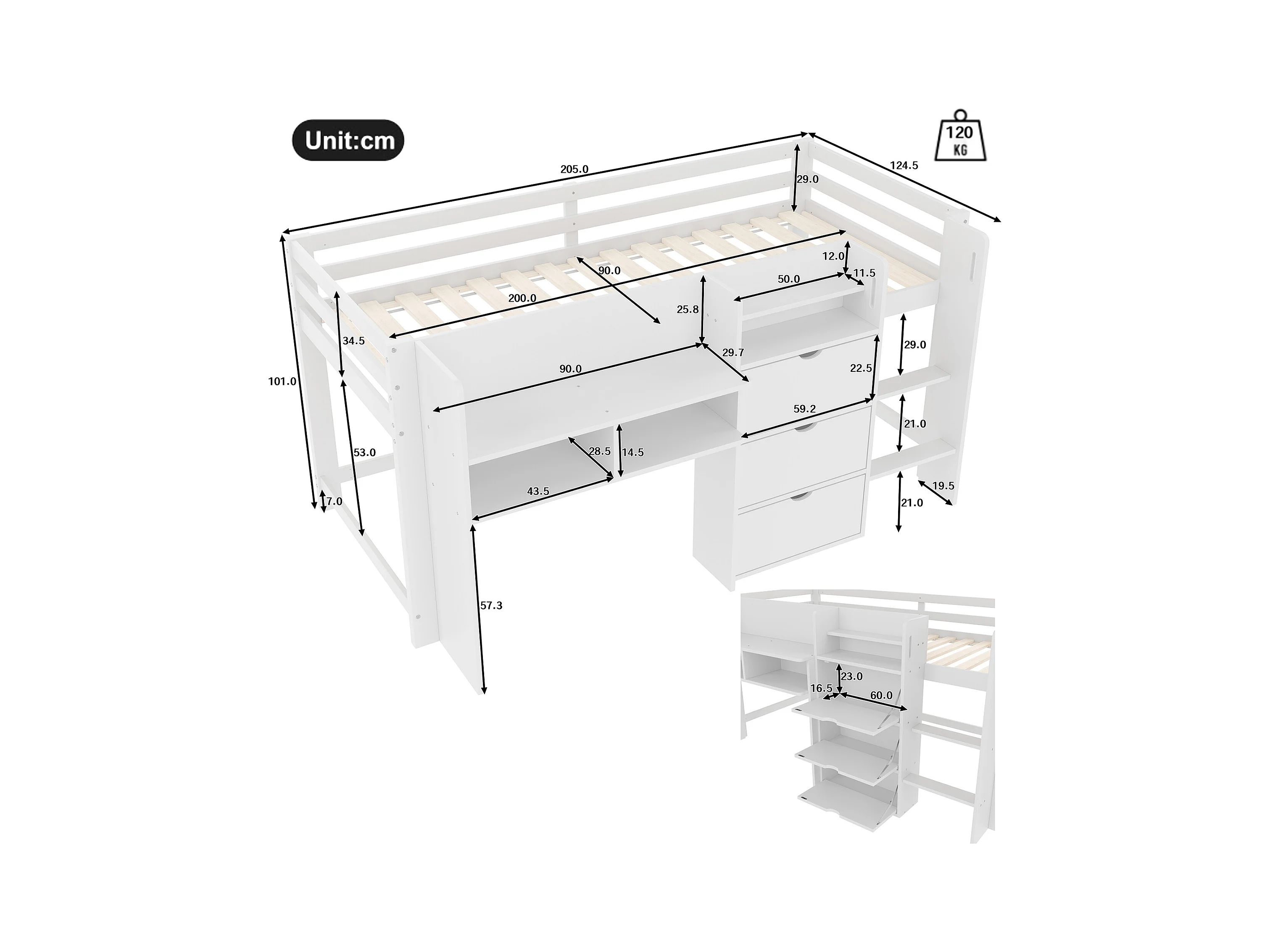 Lit enfant 90x200 cm - avec rangements - avec petite échelle - blanc (matelas non inclus)