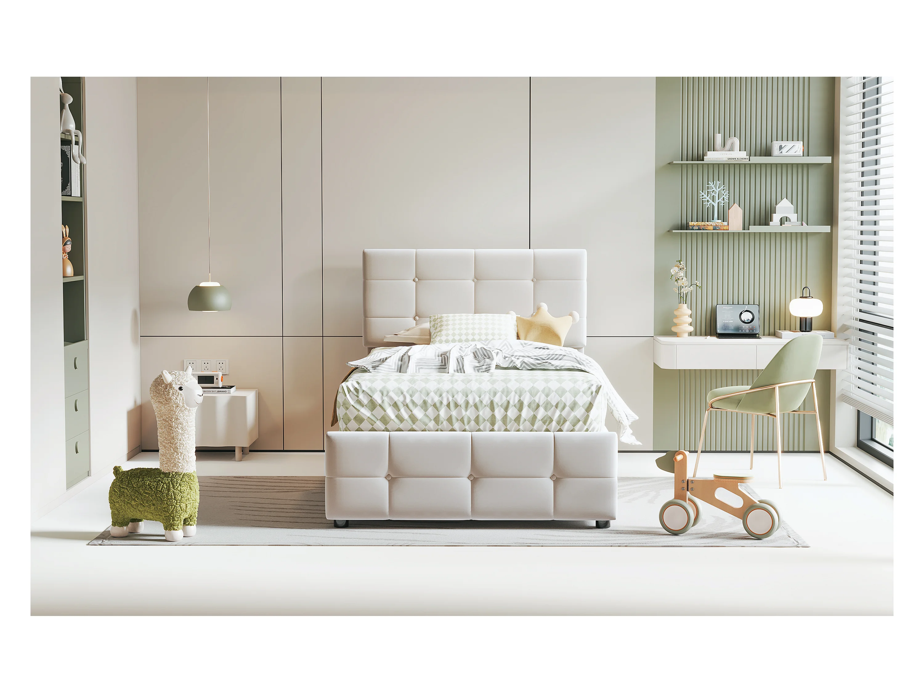 Lit enfant 90x200 cm, lit avec rangement hydraulique, tête de lit réglable, velours beige