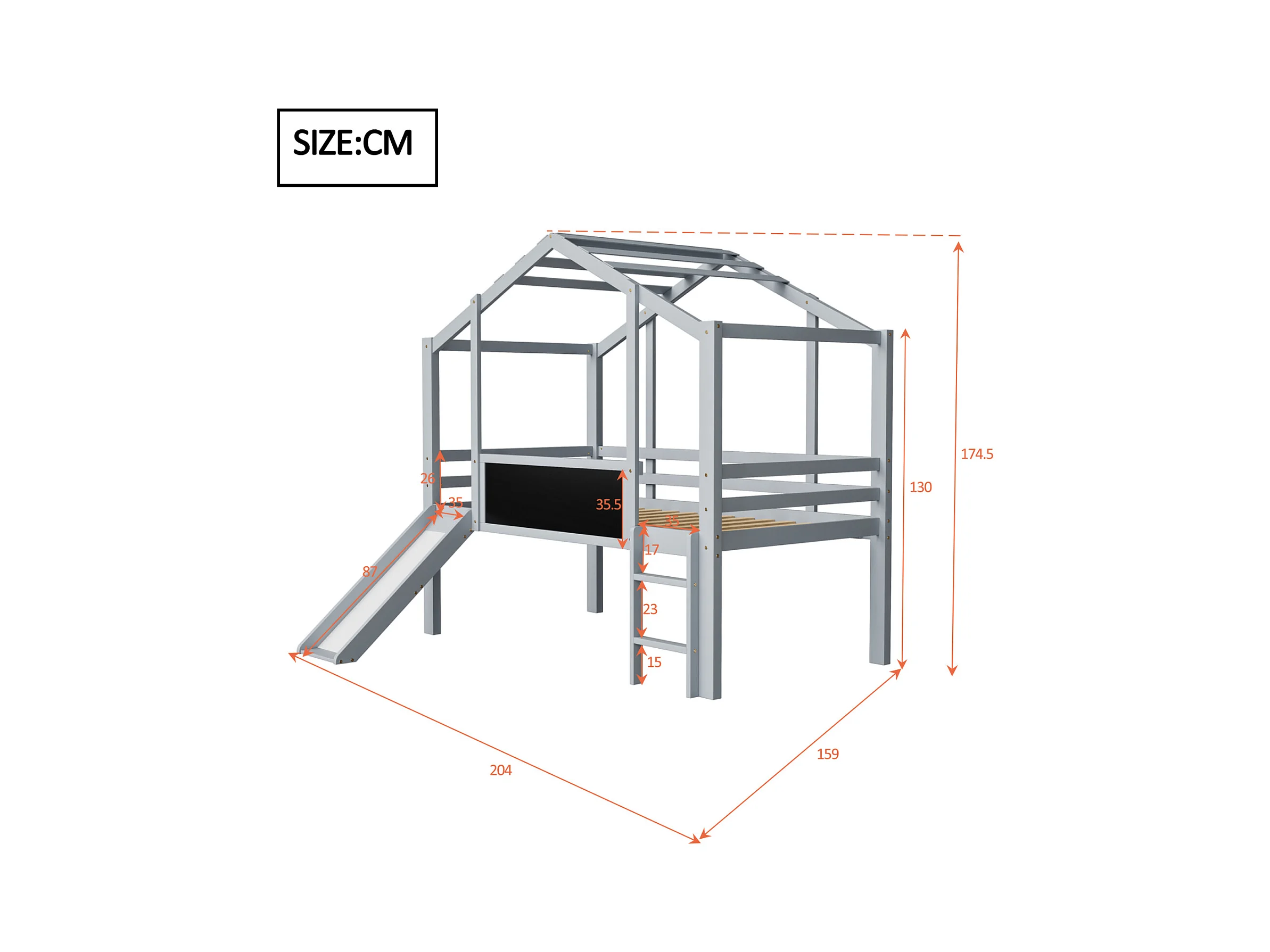 Lit enfant 90x200 cm style mezzanine avec échelle de sécurité et toboggan, tableau à graffitis, lit multifonction en bois massif