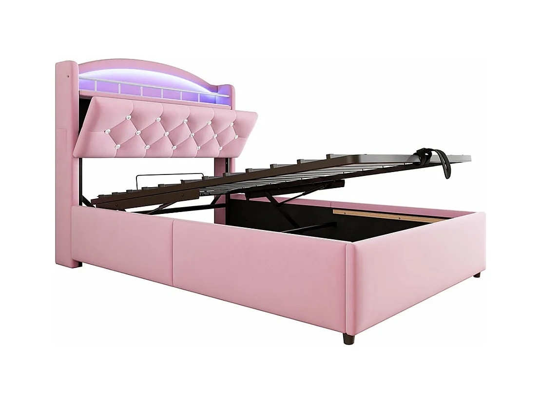 Lit enfant 90x200, simple velours, lit multifonctionnel avec LED et espace de rangement USB ,Rose