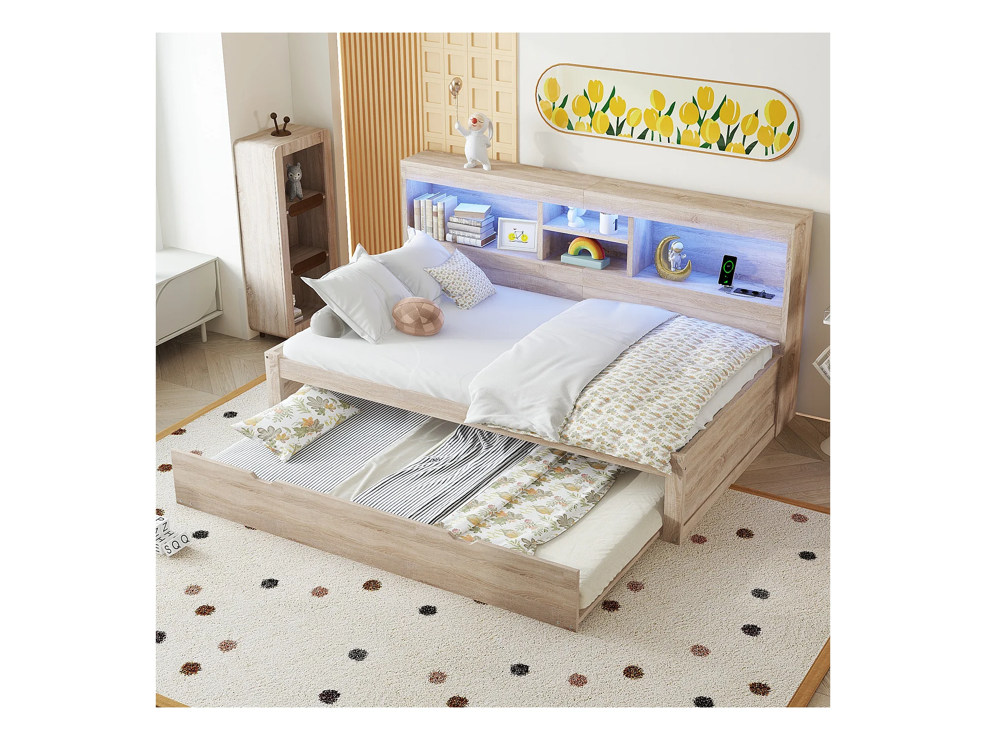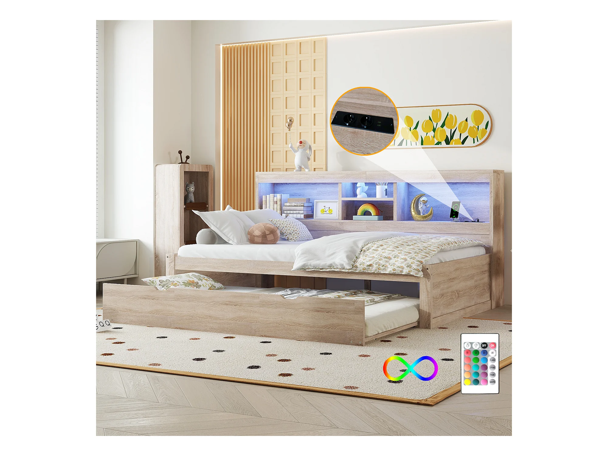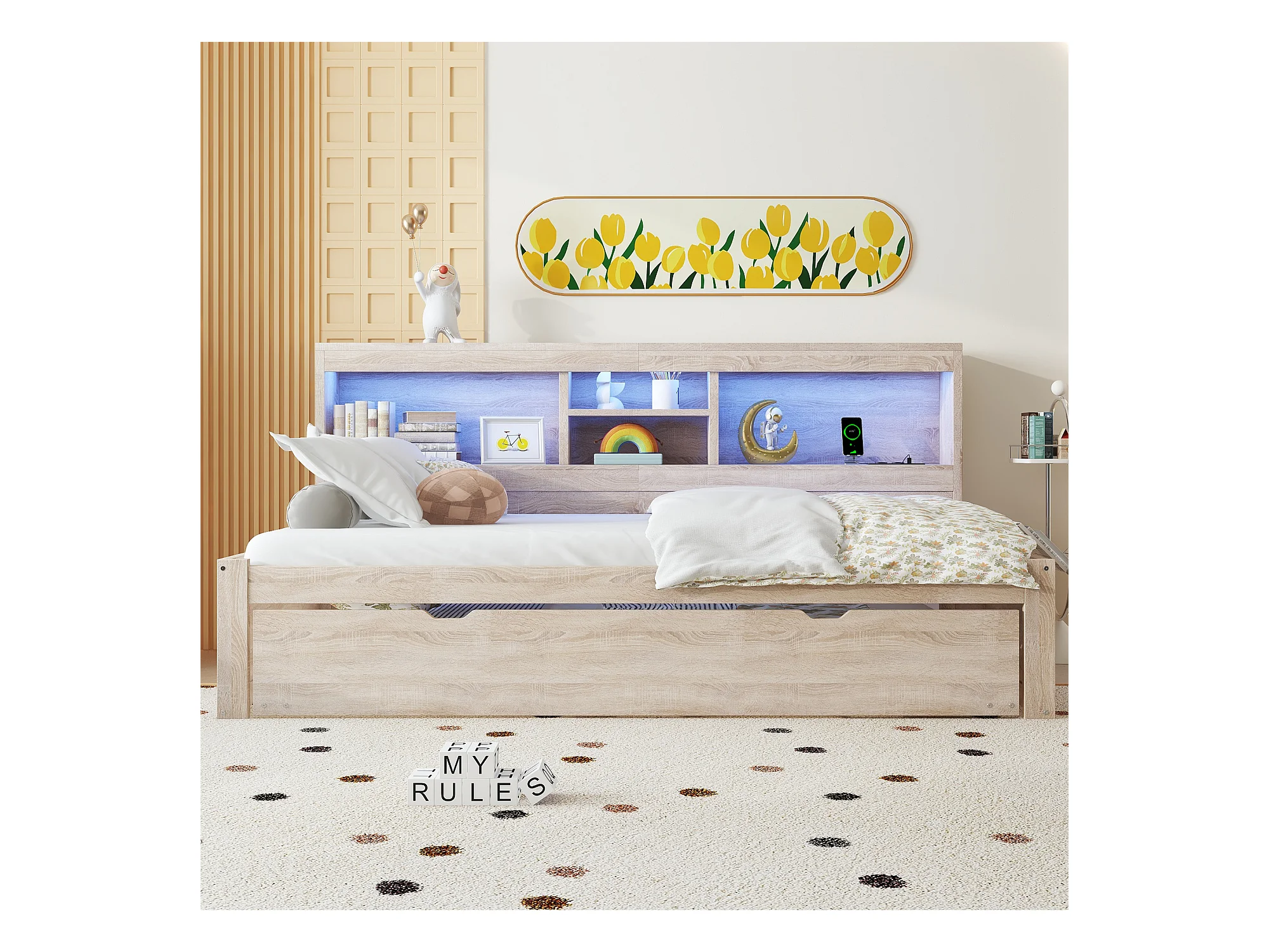 Lit enfant 90x200cm avec Etagère, lit gigogne 90x190cm,MDF naturel, sans matelas