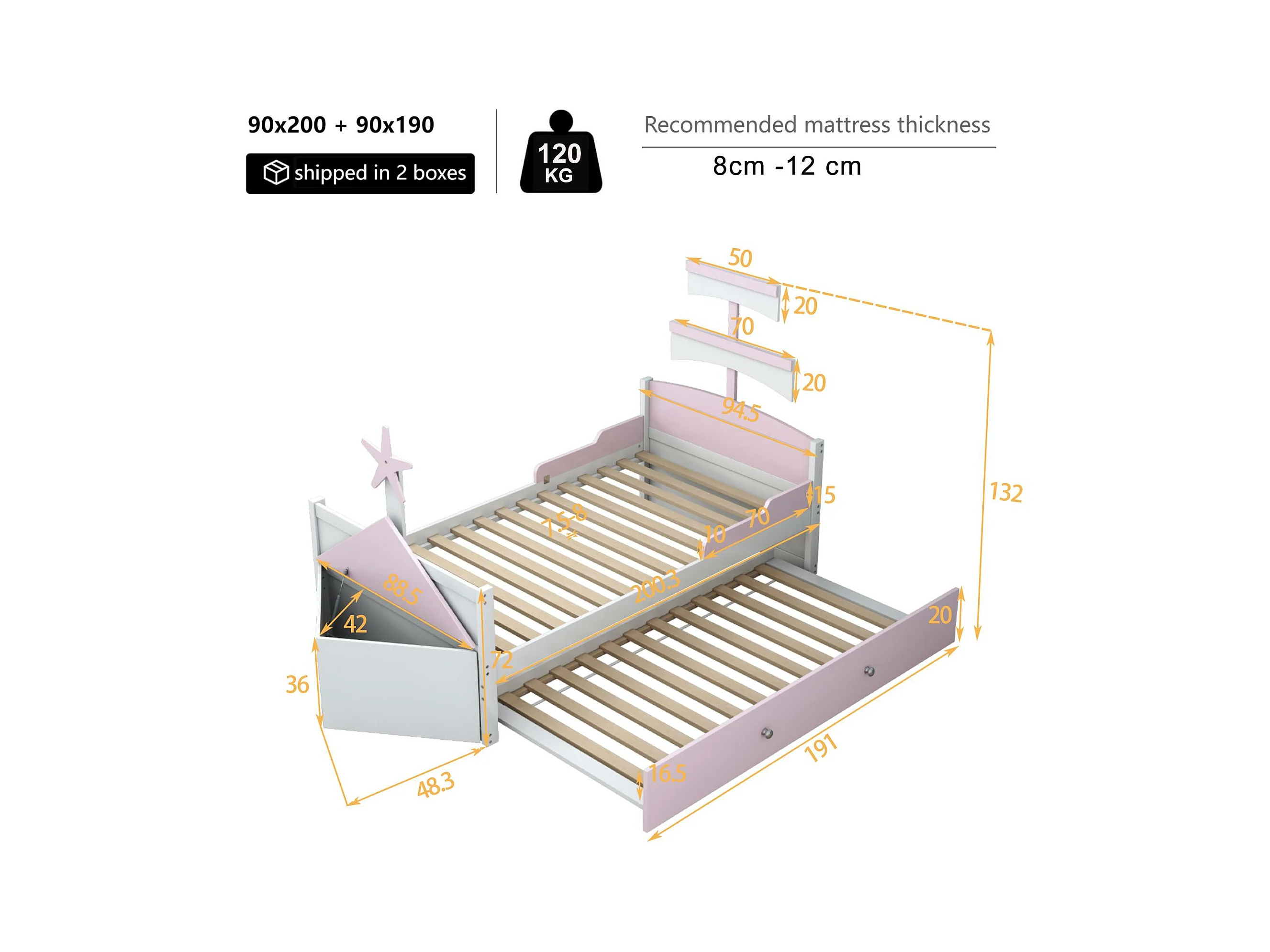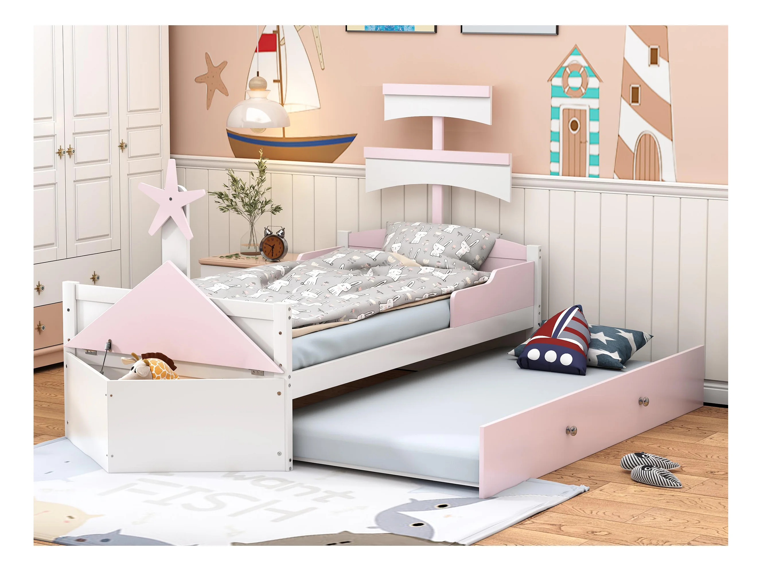 Lit enfant 90x200cm en bois - avec lit gigogne 90x190cm et une coffre - en forme de voilier - Rose