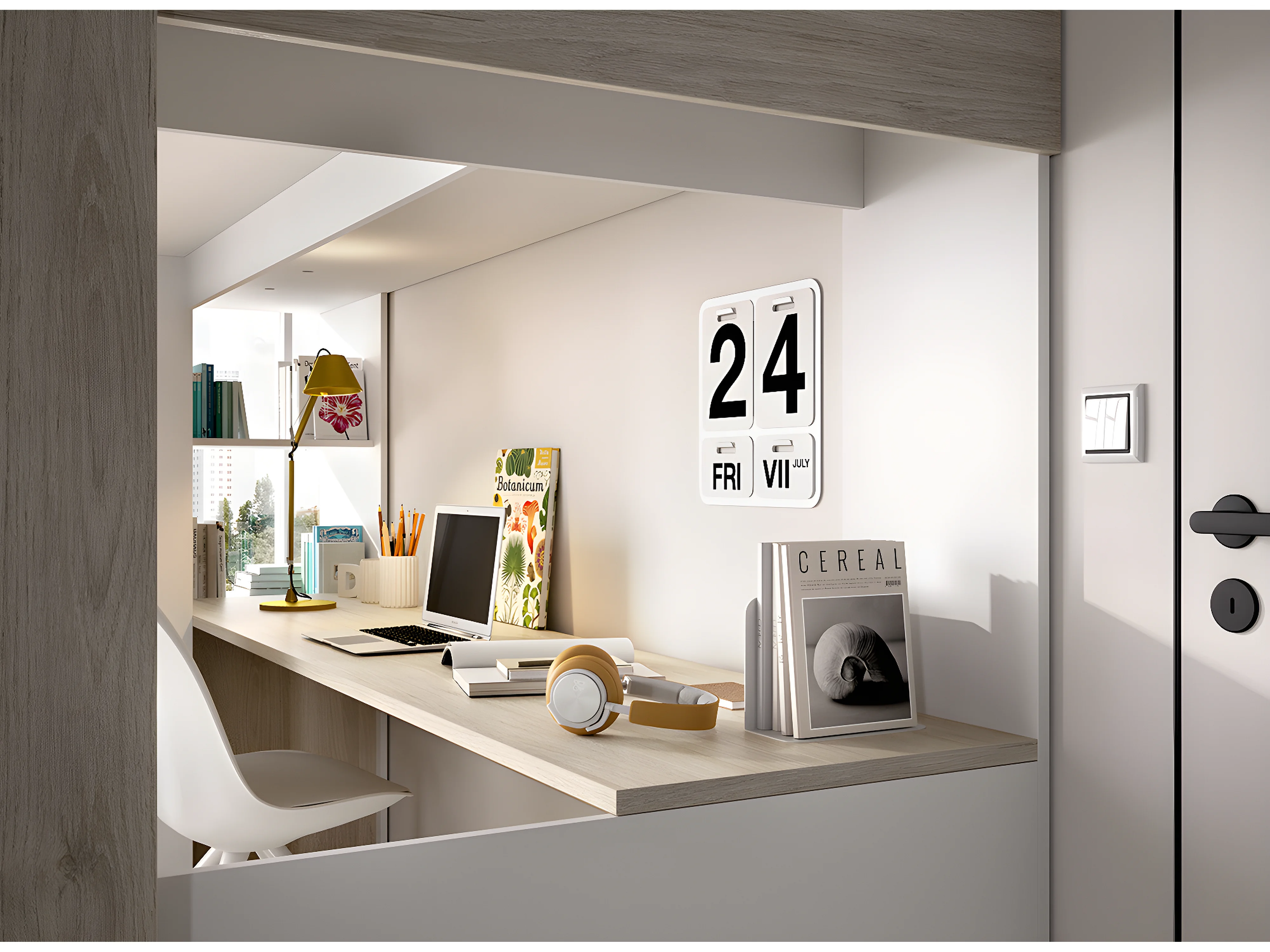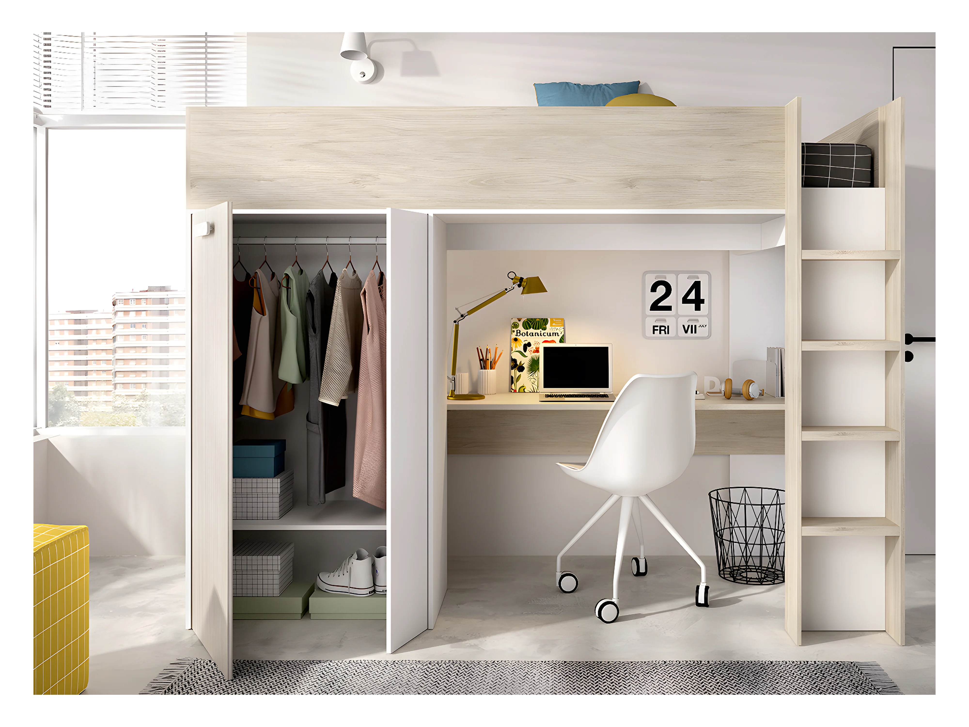 Lit enfant avec bureau et armoire coloris chêne naturel, imitation lamelles, blanc - Longueur 206 x Profondeur 111 x Hauteur 177 cm