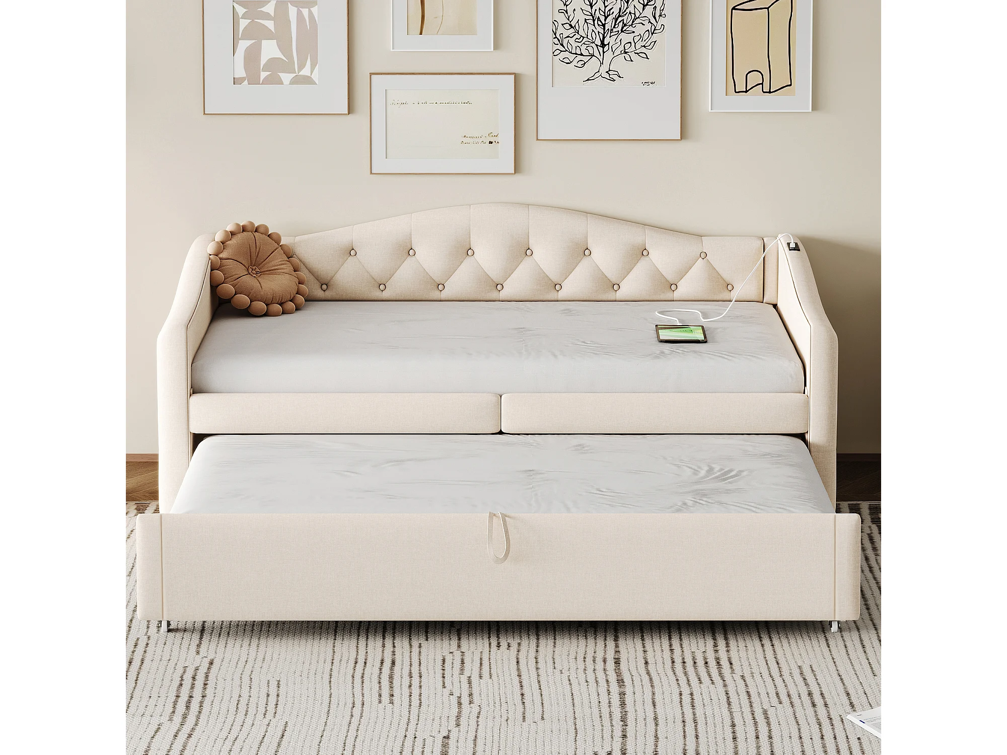 Lit enfant banquette 90x200cm beige en lin convertible, avec dossier et tête de lit rembourrés, sans matelas