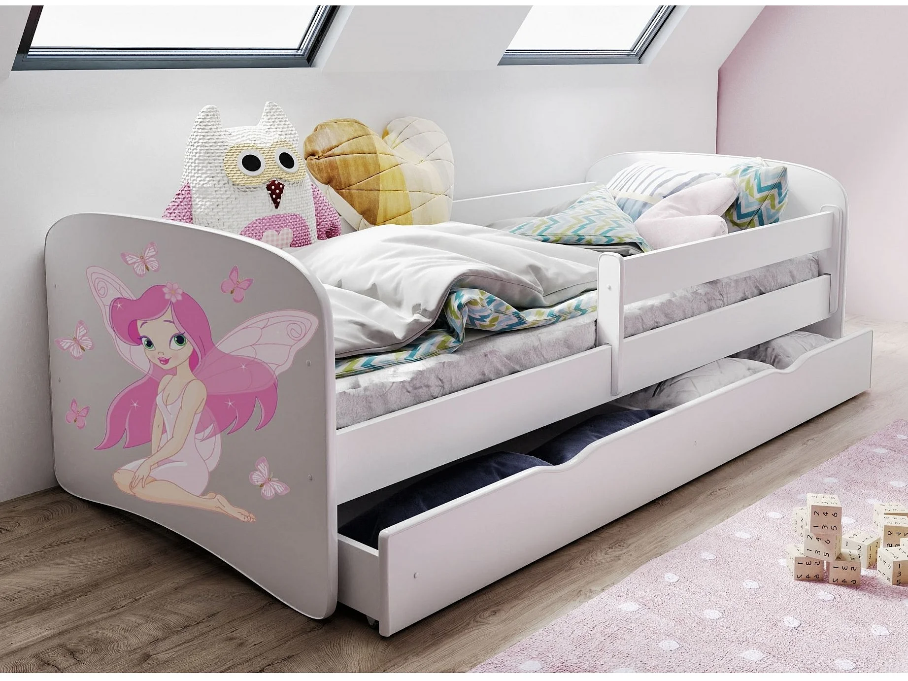 Lit enfant blanc fée avec papillons avec sommiers et barrière de sécurité amovible Drimy-Matelas mousse-70x140-Tiroirs Avec tiroir