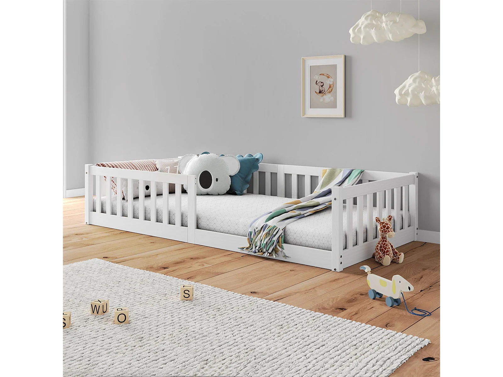 Lit enfant GUSTAVO lit au sol 90x200 cm d'inspiration Montessori, avec barrières de protection, en pin massif lasuré blanc