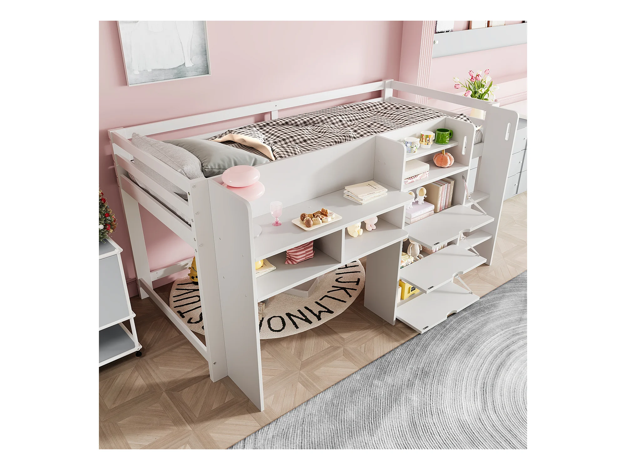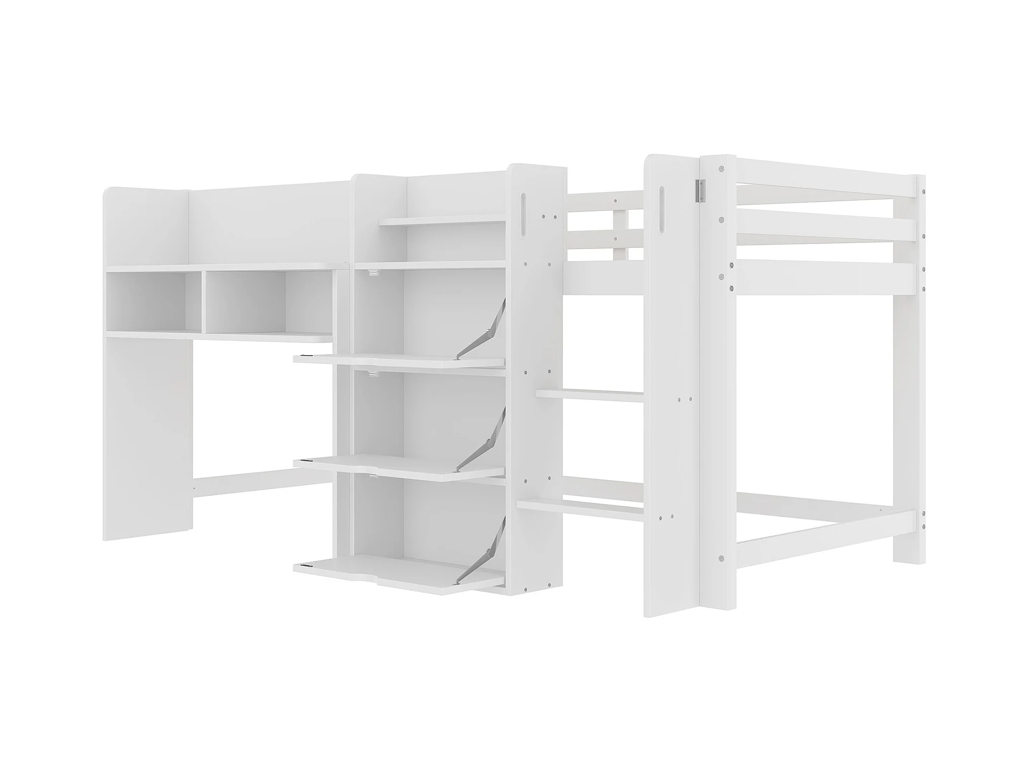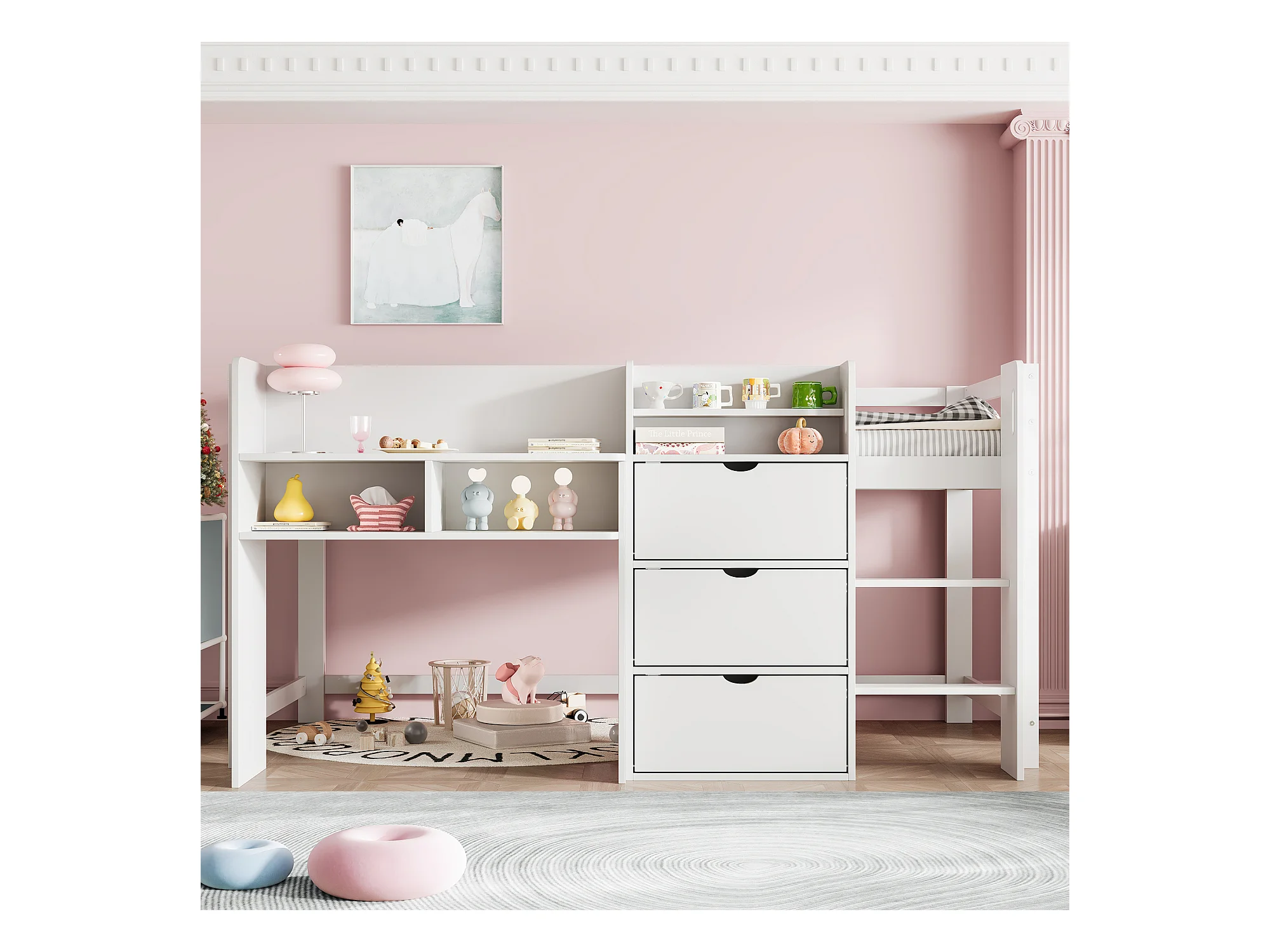 Lit enfant mi-hauteur blanc 90x200cm avec 3 portes, étagères de rangement et espace de divertissement (sans matelas)