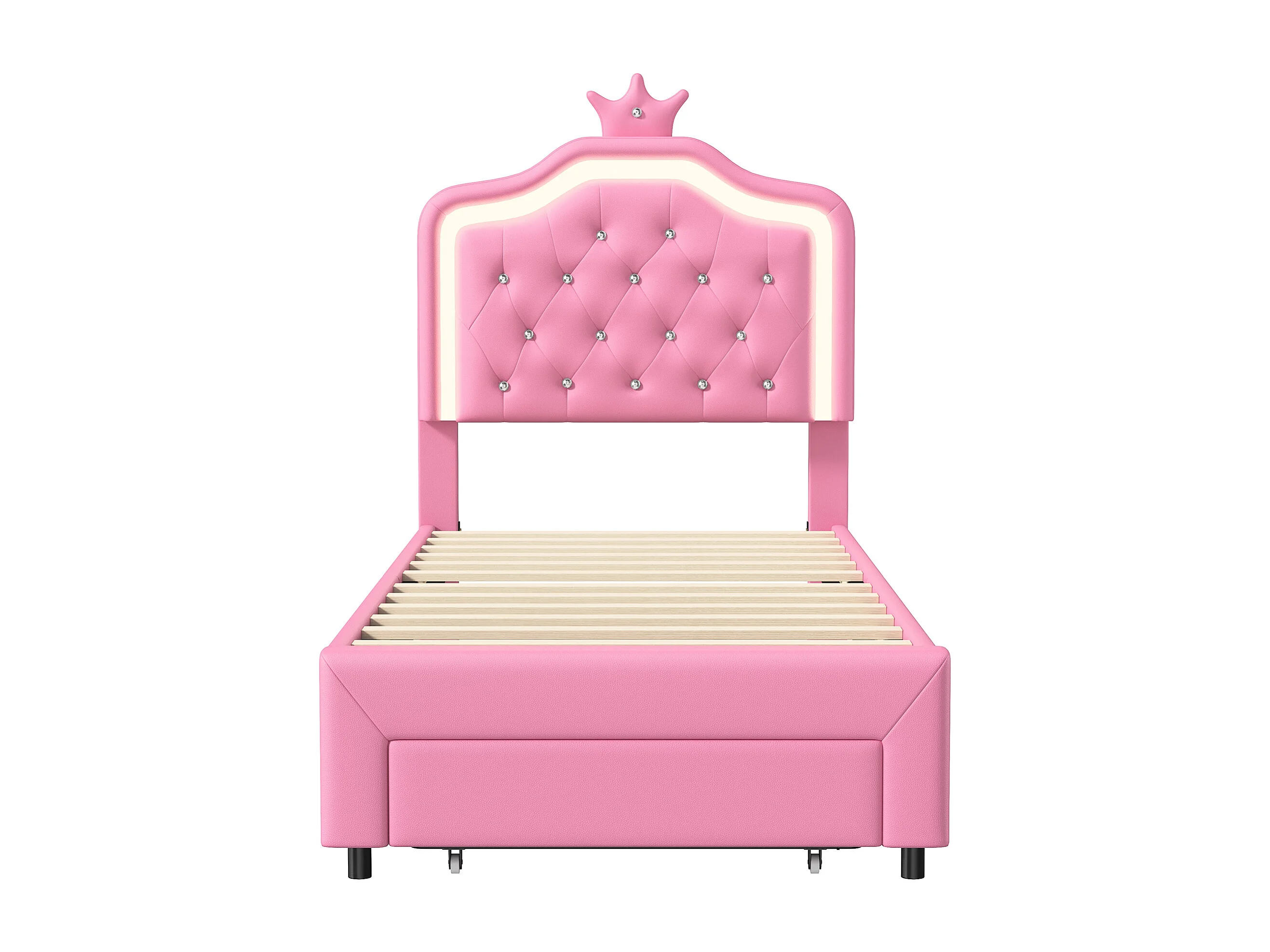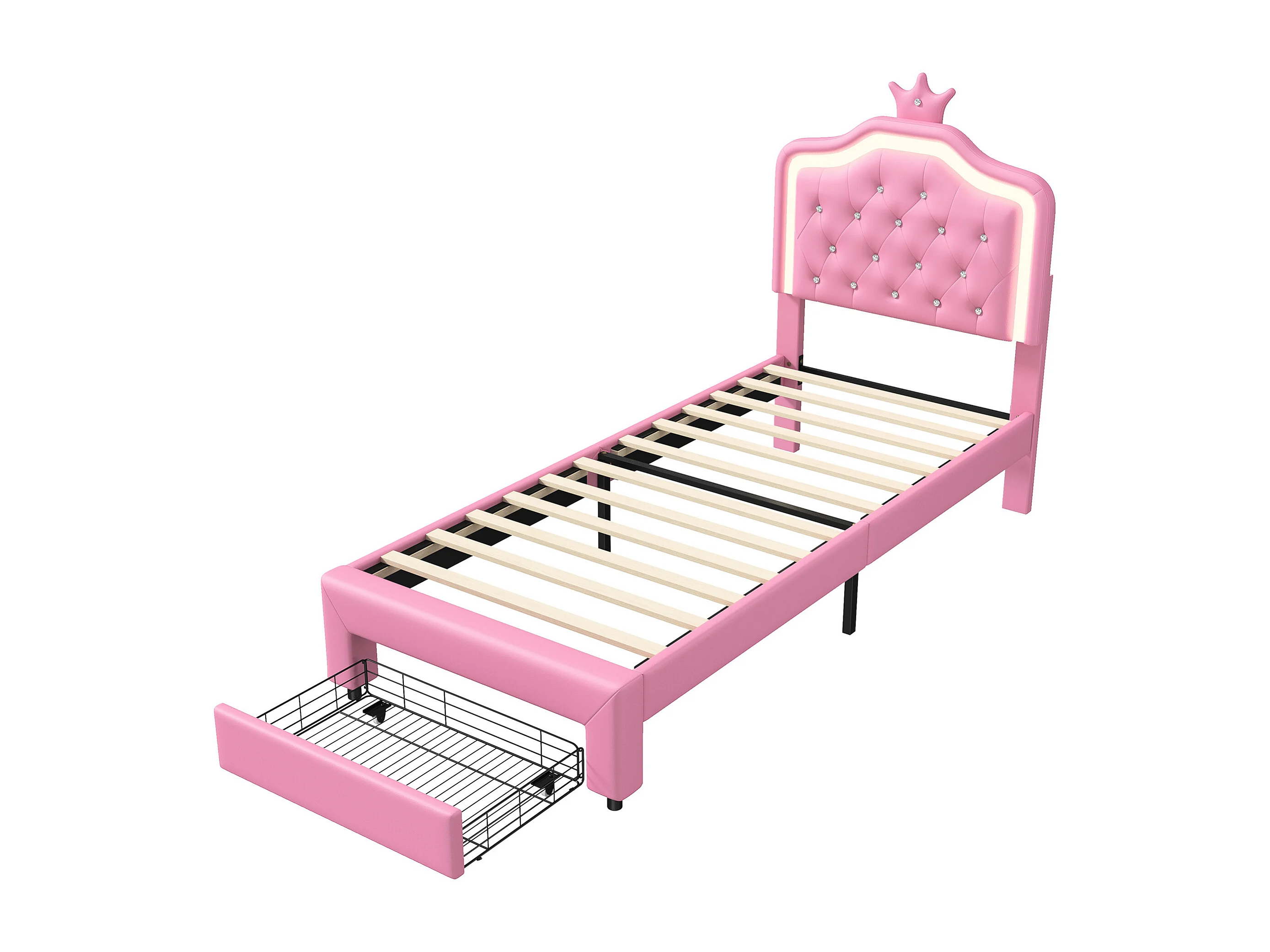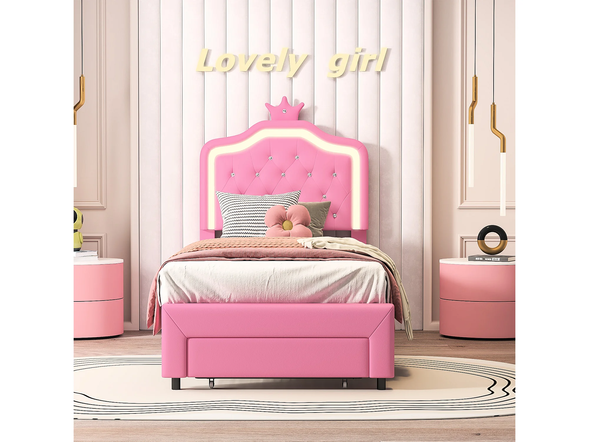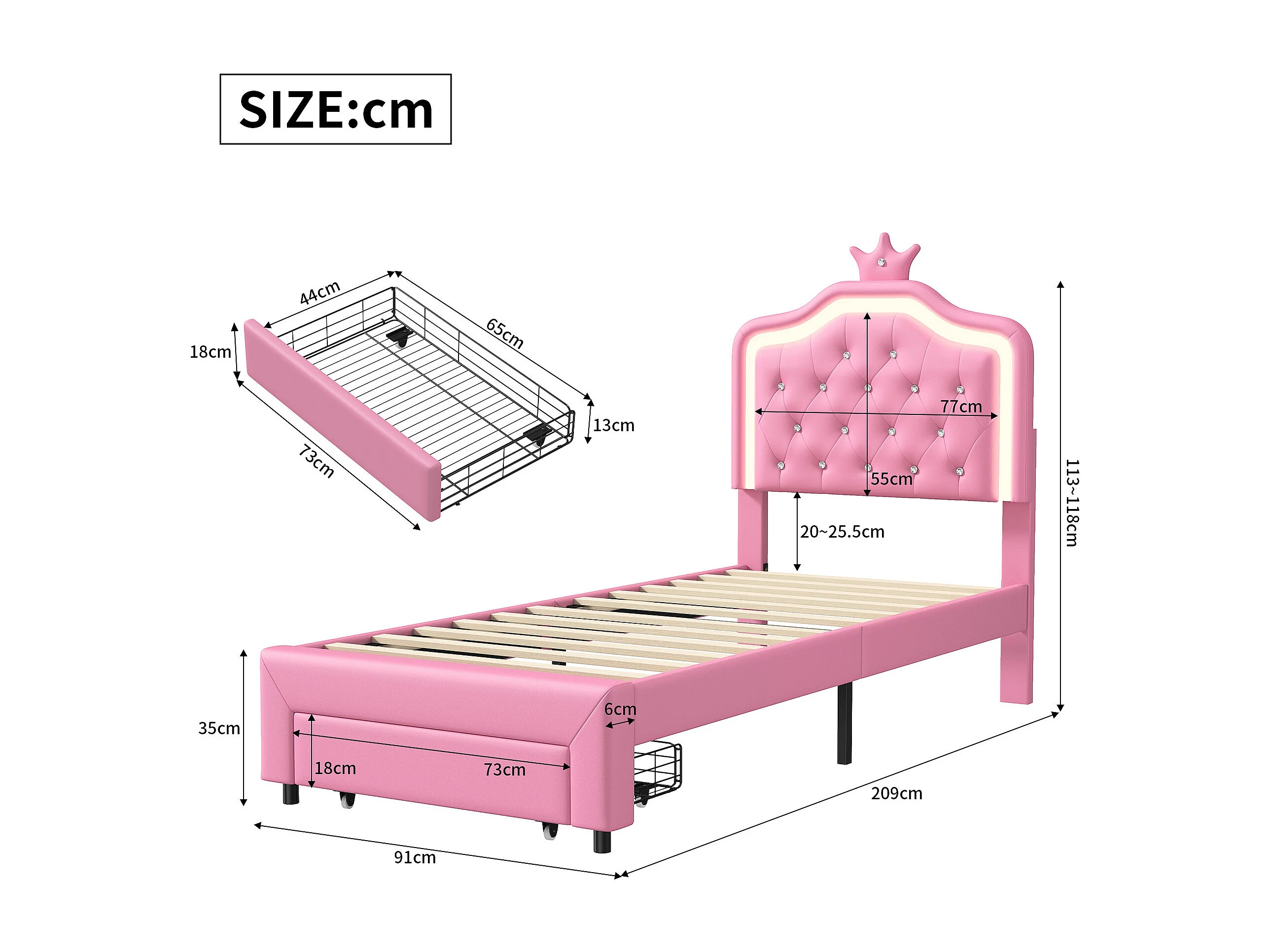 Lit Enfant Rembourré 90 X 200 cm Cadre de lit Pour Filles, Cadre de Lits Double en Cuir pu avec éClairage Led Bed en Bois avec Tiroirs avec Sommier à Lattes