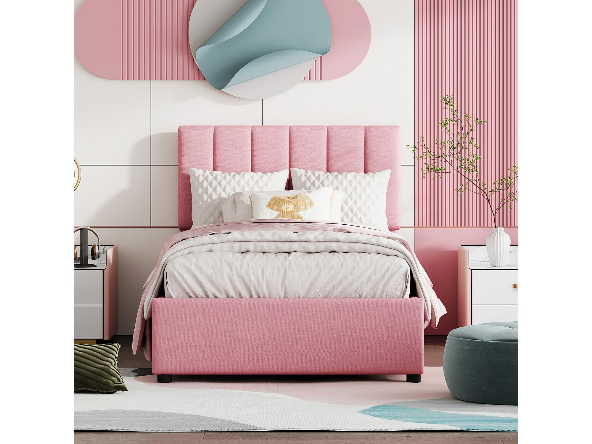 Lit enfant rembourré 90x200 cm avec coffre hydraulique, sommier inclus, velours lin rose, lit multifonction