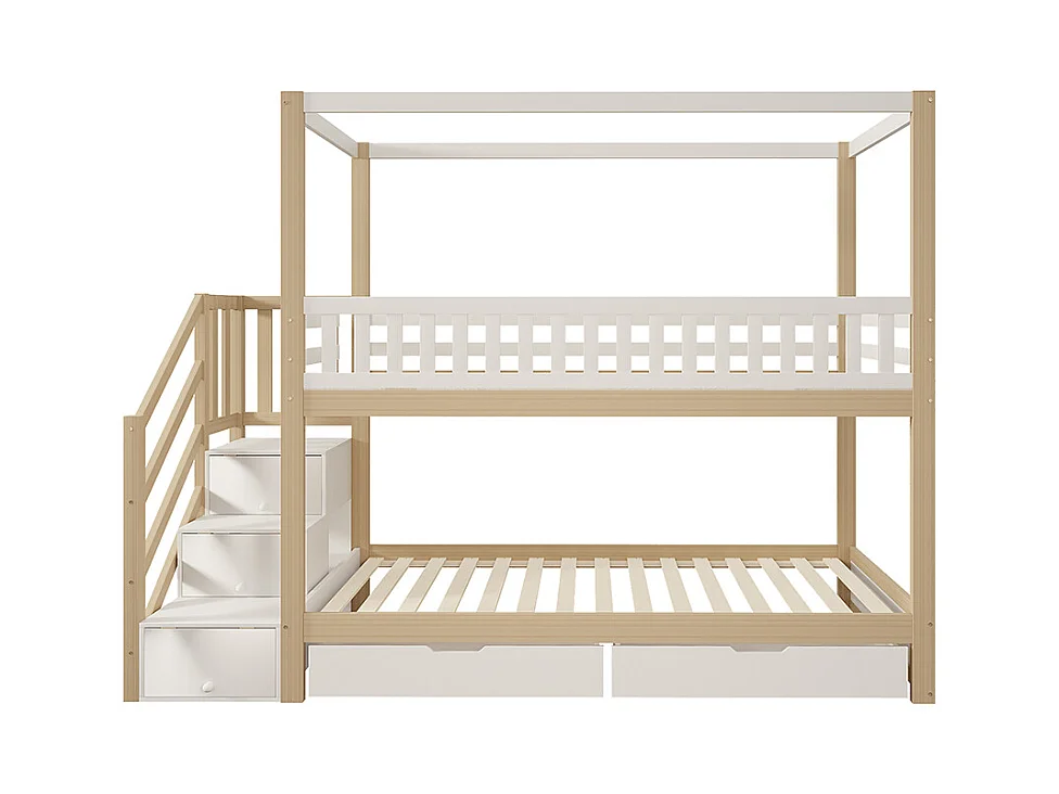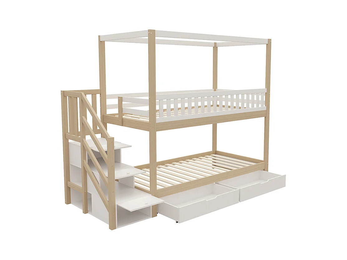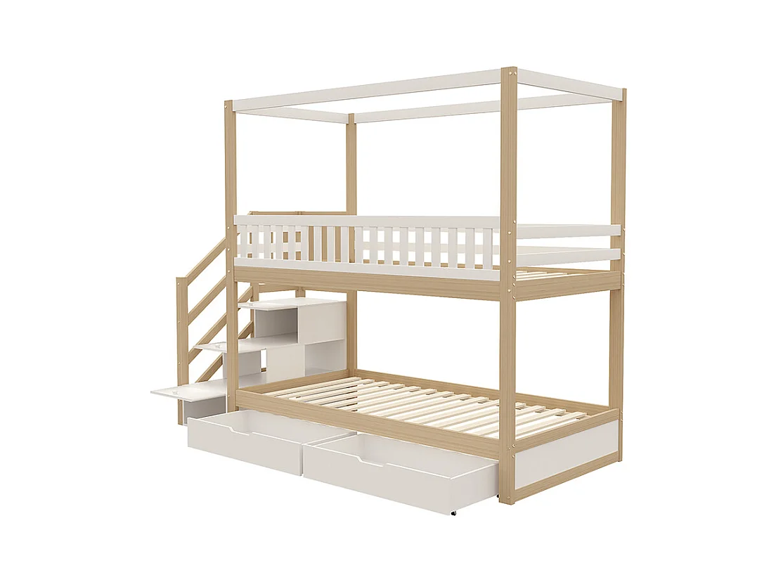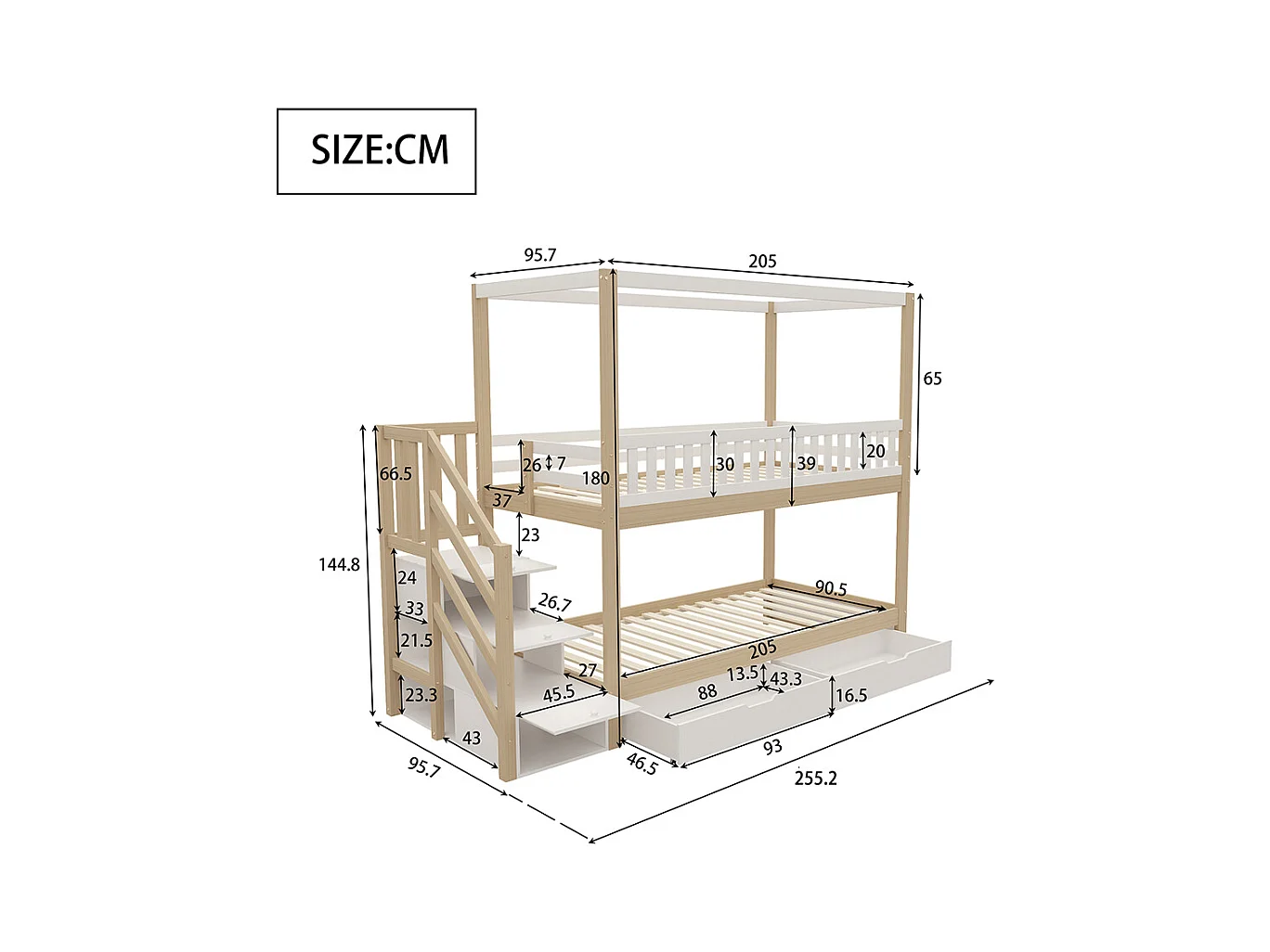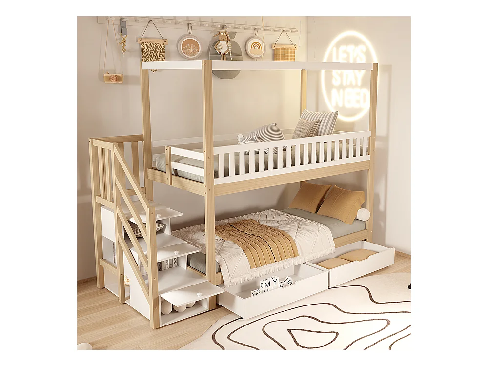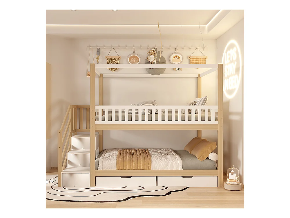 Lit enfant superposé 90*200 cm, bois massif, garde-corps de sécurité, échelle de sécurité, blanc + bois d'origine