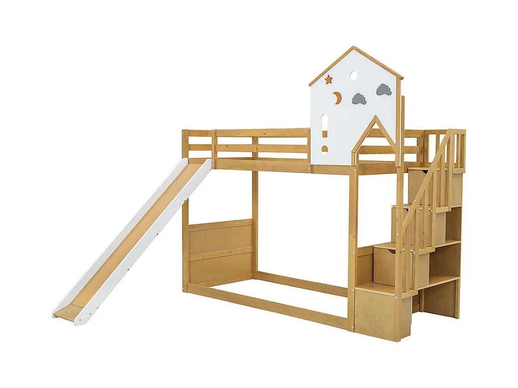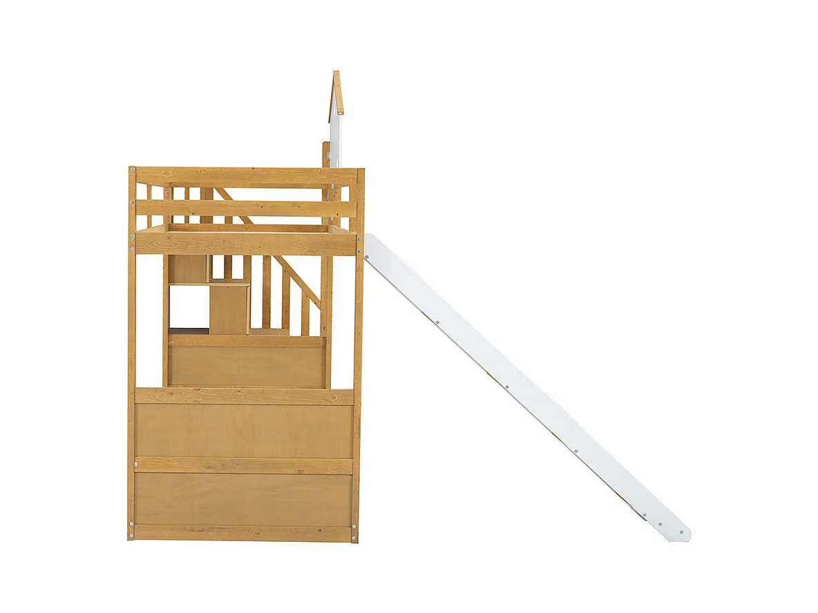 Lit enfant superposé 90x200 cm, lit simple avec escalier d'angle, toit et fenêtre, 3 casiers sur l'escalier, blanc + couleurs naturelles