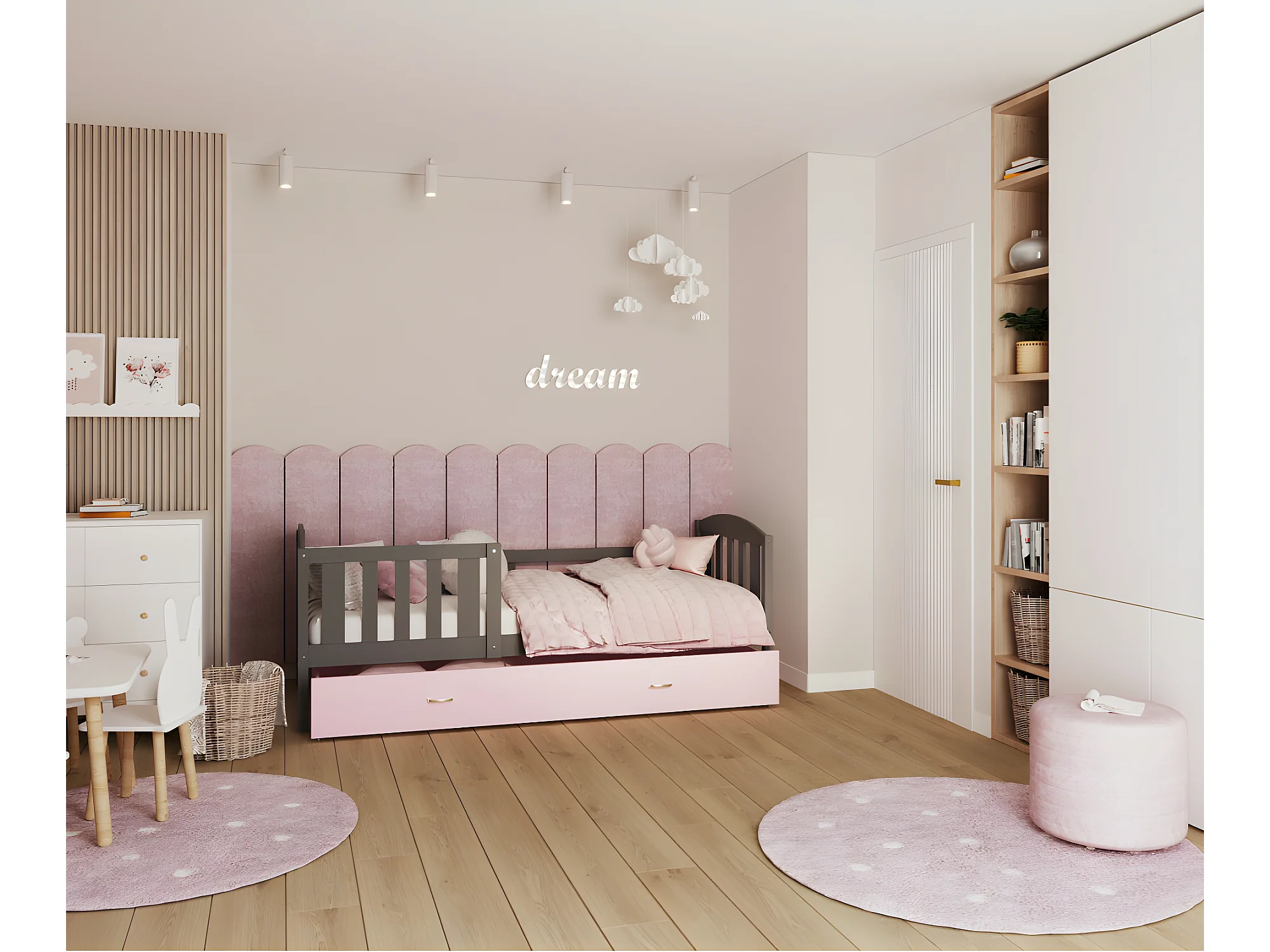 Lit Enfant Teo 90x190 Gris - rose Livré avec sommiers, tiroir et matelas en mousse de 7cm