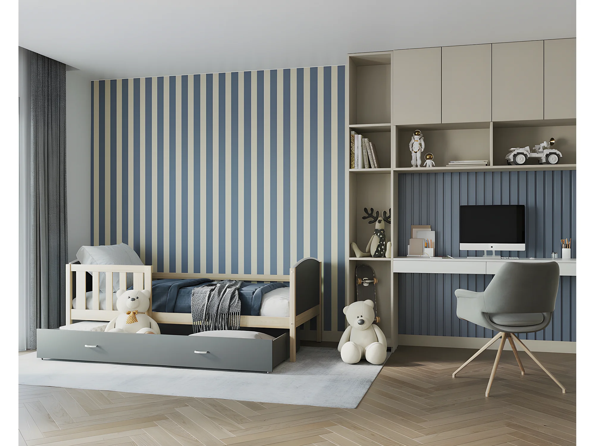 Lit Enfant Tomy 90x190 Pin - gris Livré avec sommiers, tiroir et matelas en mousse de 7cm