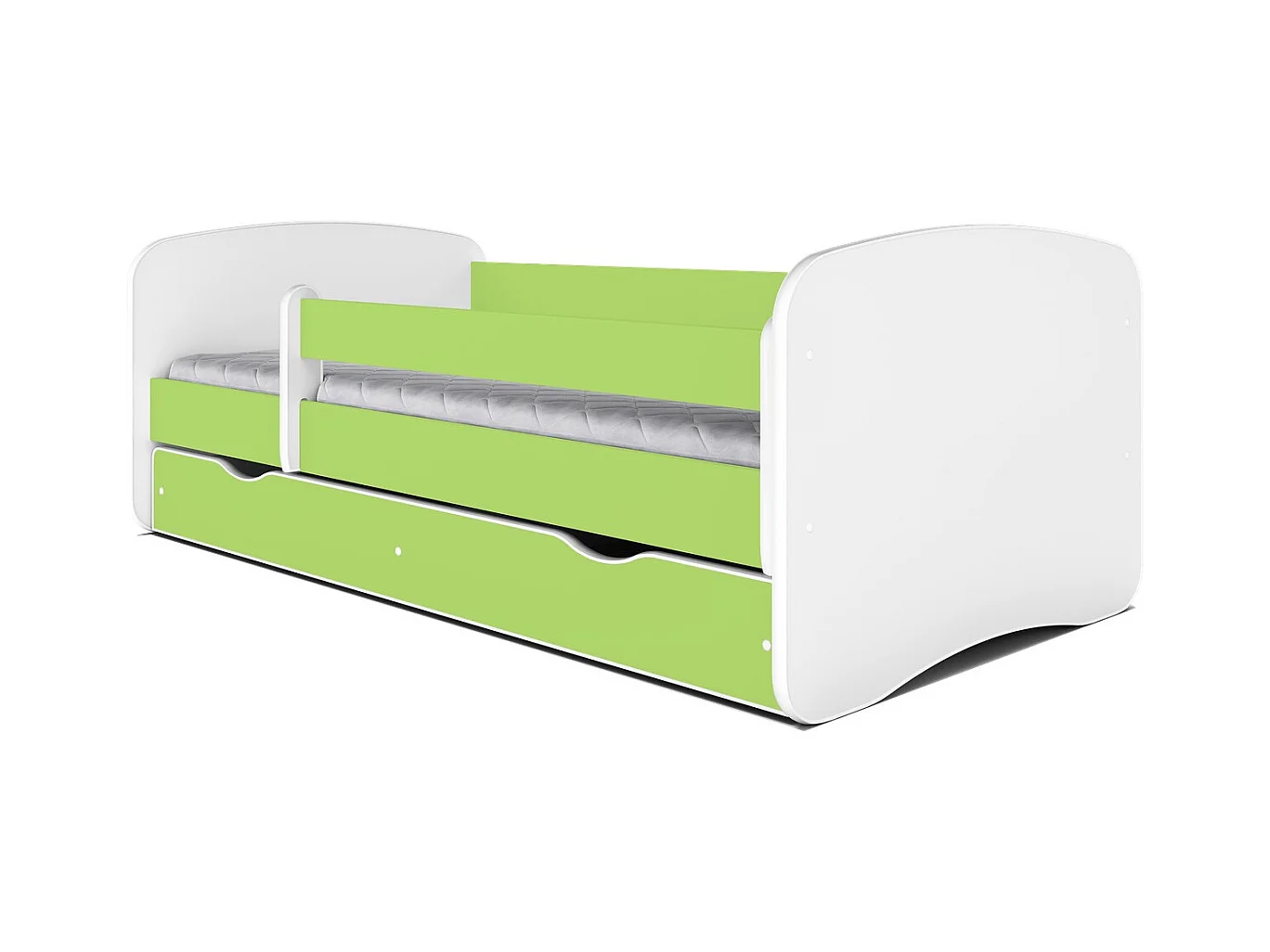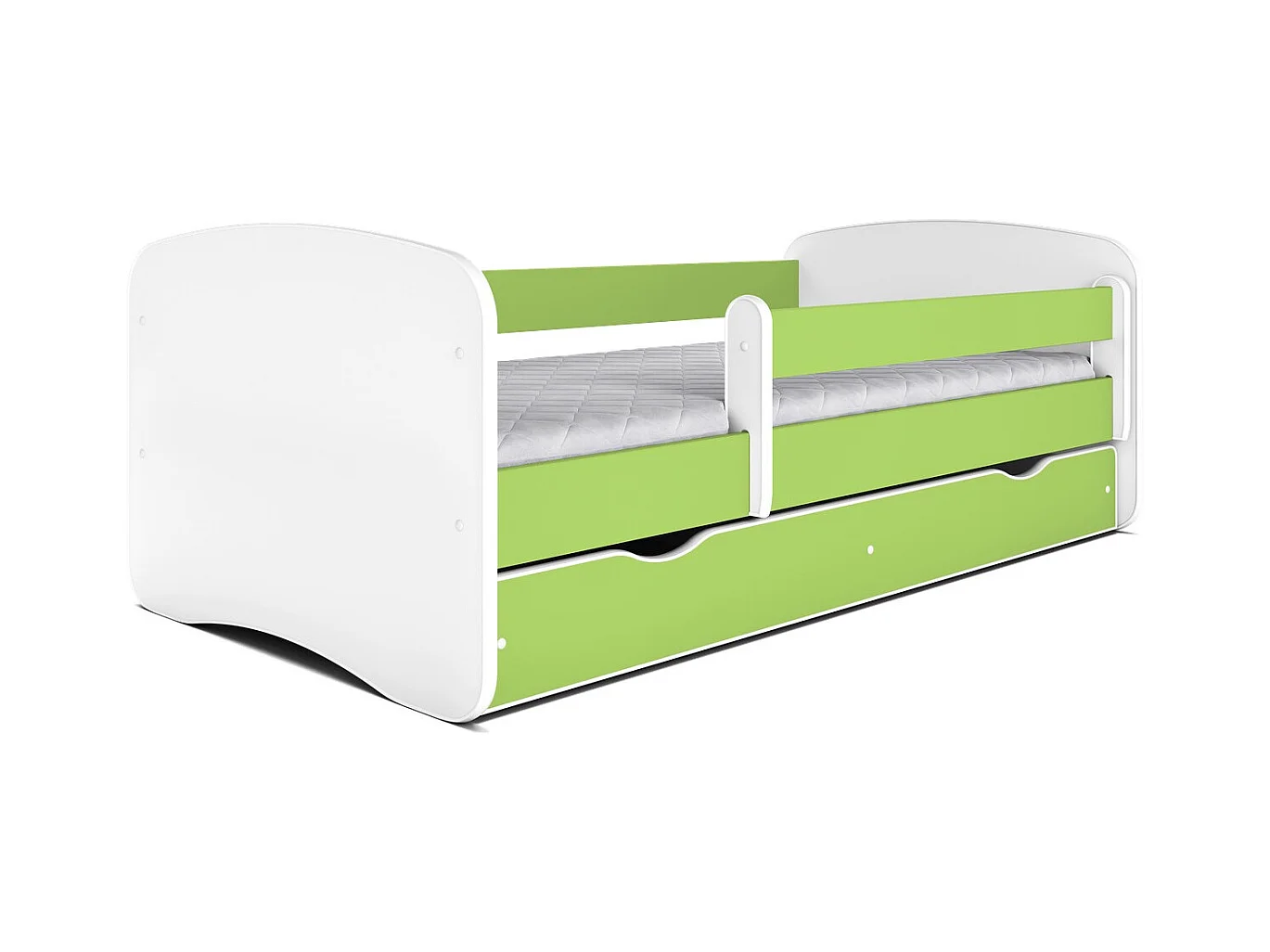Lit enfant vert avec sommiers et barrière de sécurité amovible Drimy-Matelas mousse-80x160-Tiroirs Avec tiroir