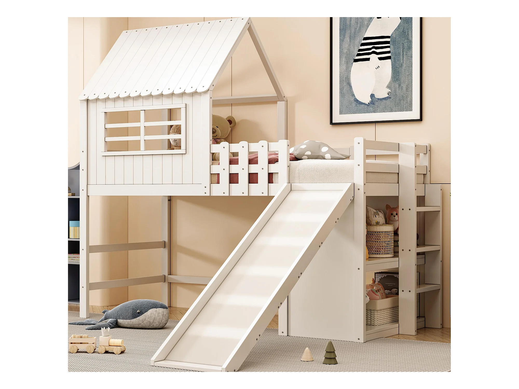 Lit enfanté 90 x 200 cm - avec échelle de sécurité - avec toboggan - avec compartiment de rangement - blanc (matelas non inclus)
