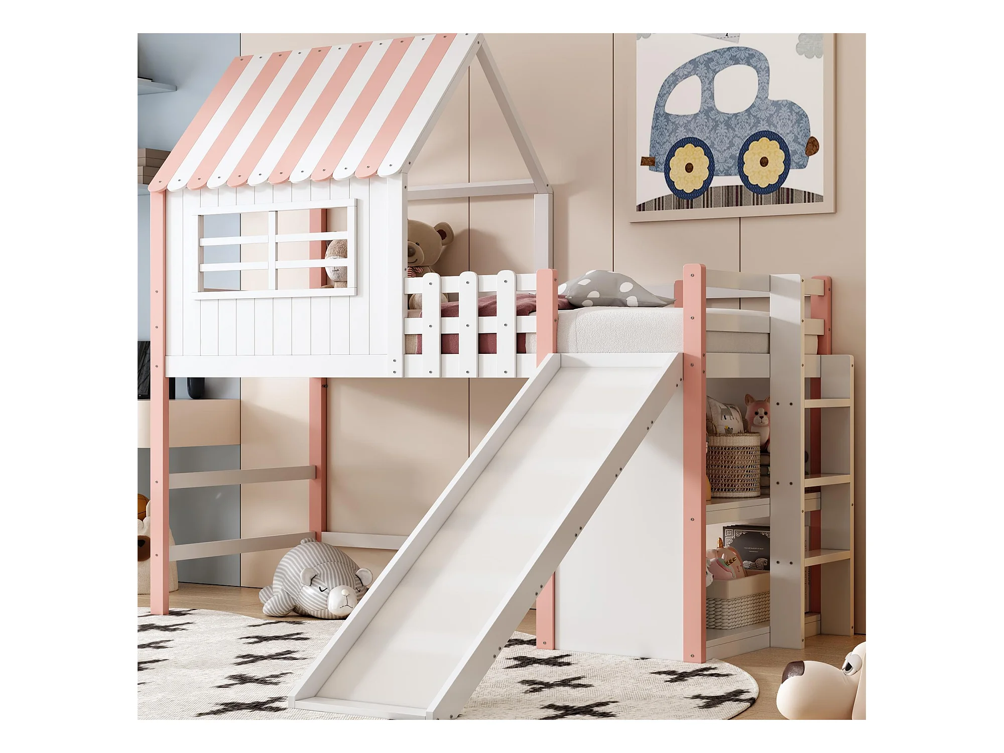 Lit enfanté 90x200 cm - avec échelle de sécurité - avec toboggan - avec compartiment de rangement - rose (matelas non inclus)