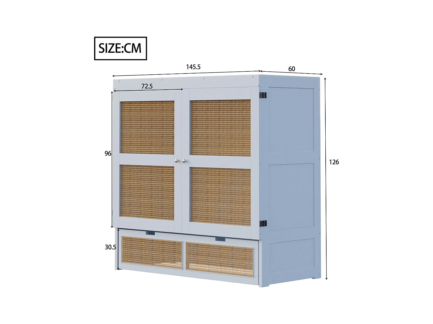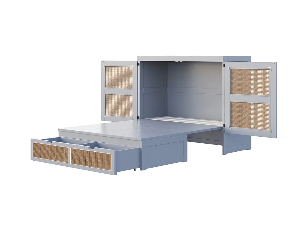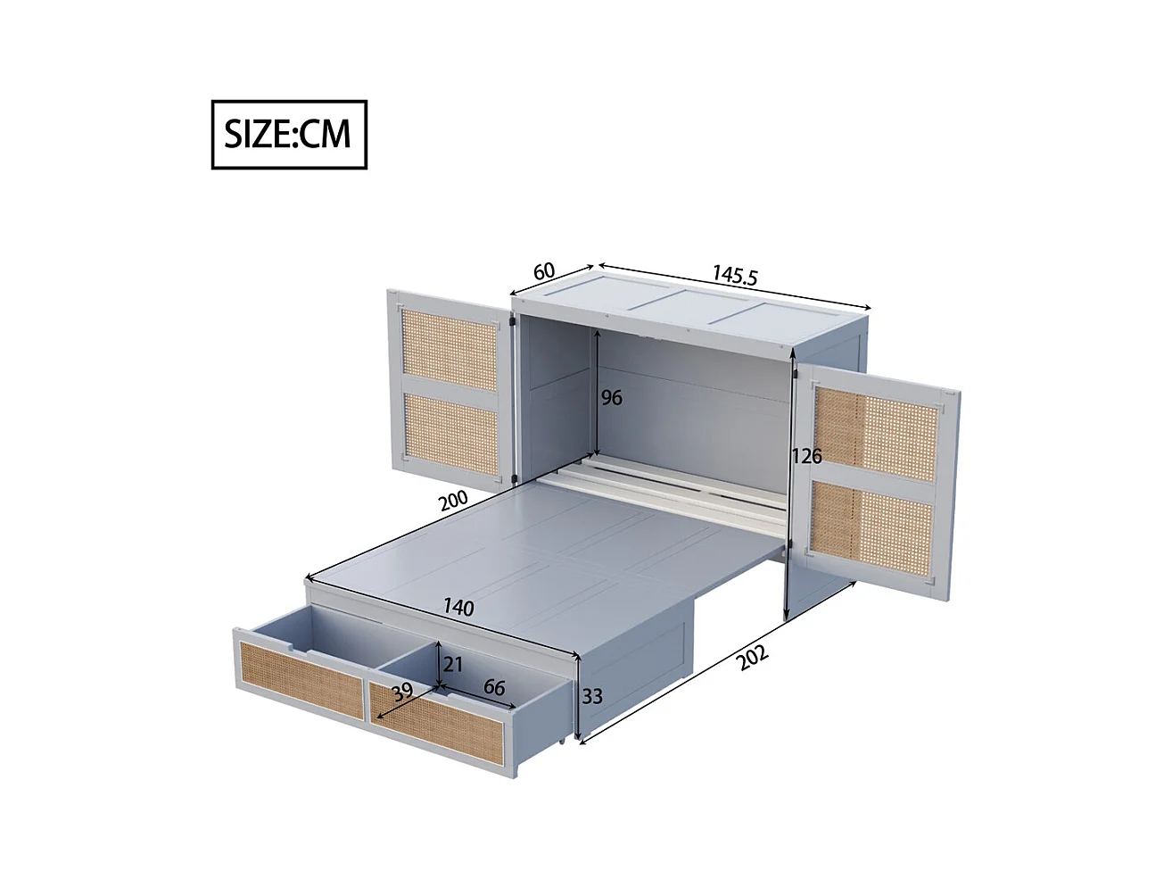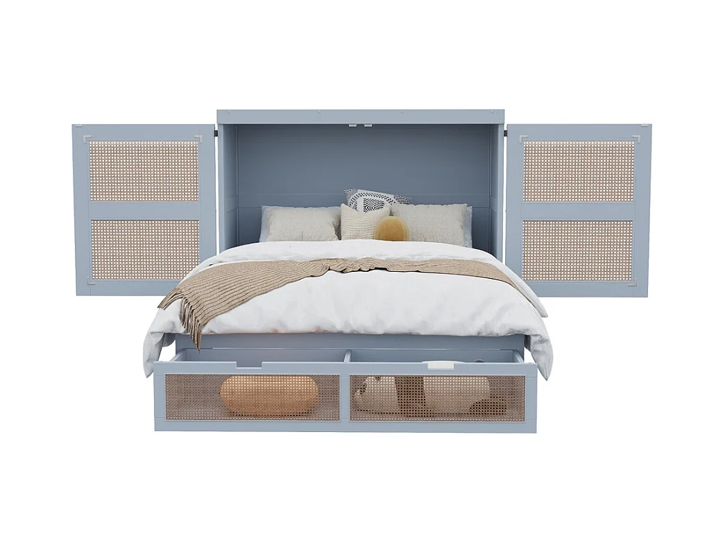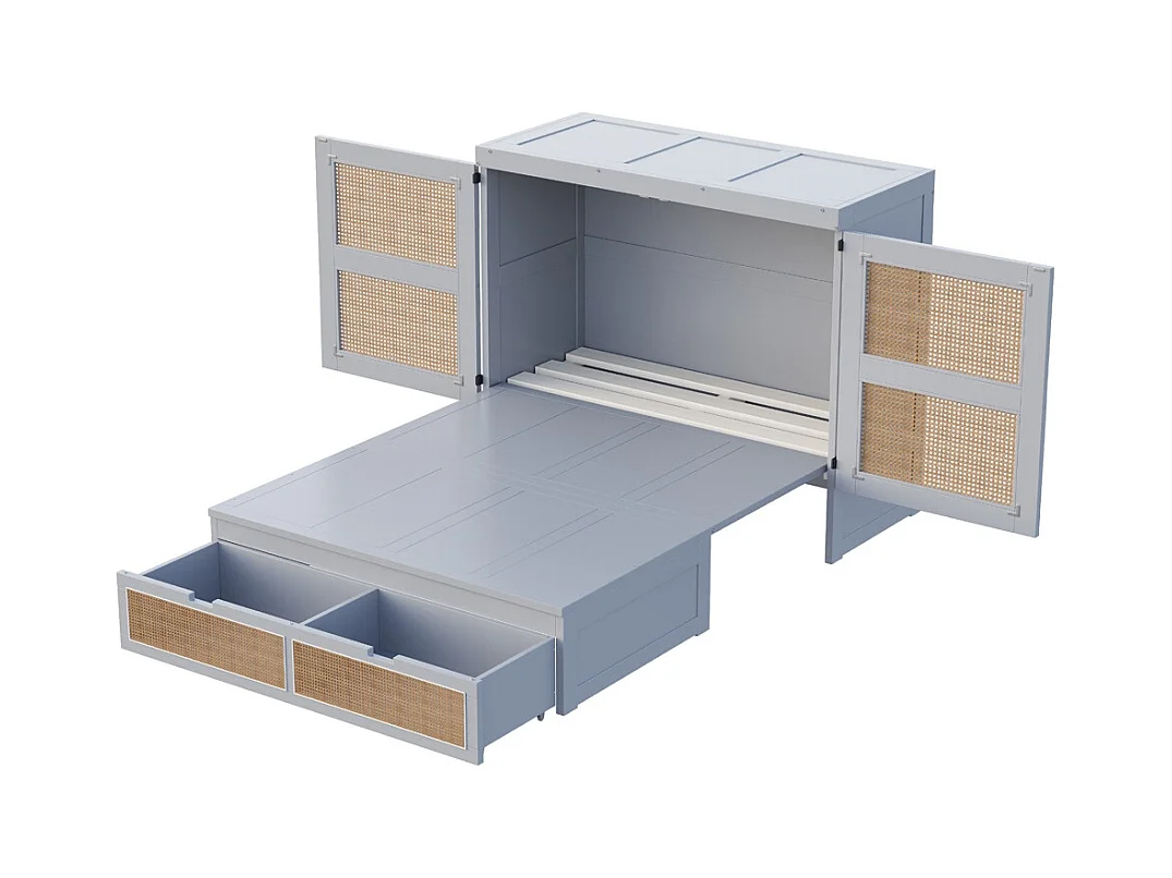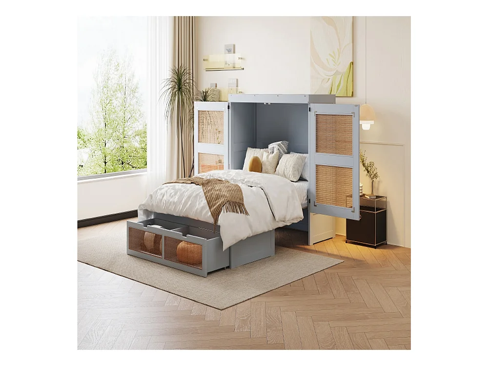 Lit escamotable 140x200 lit mural lit rabattable mural avec tiroirs de rangement design rotin gris