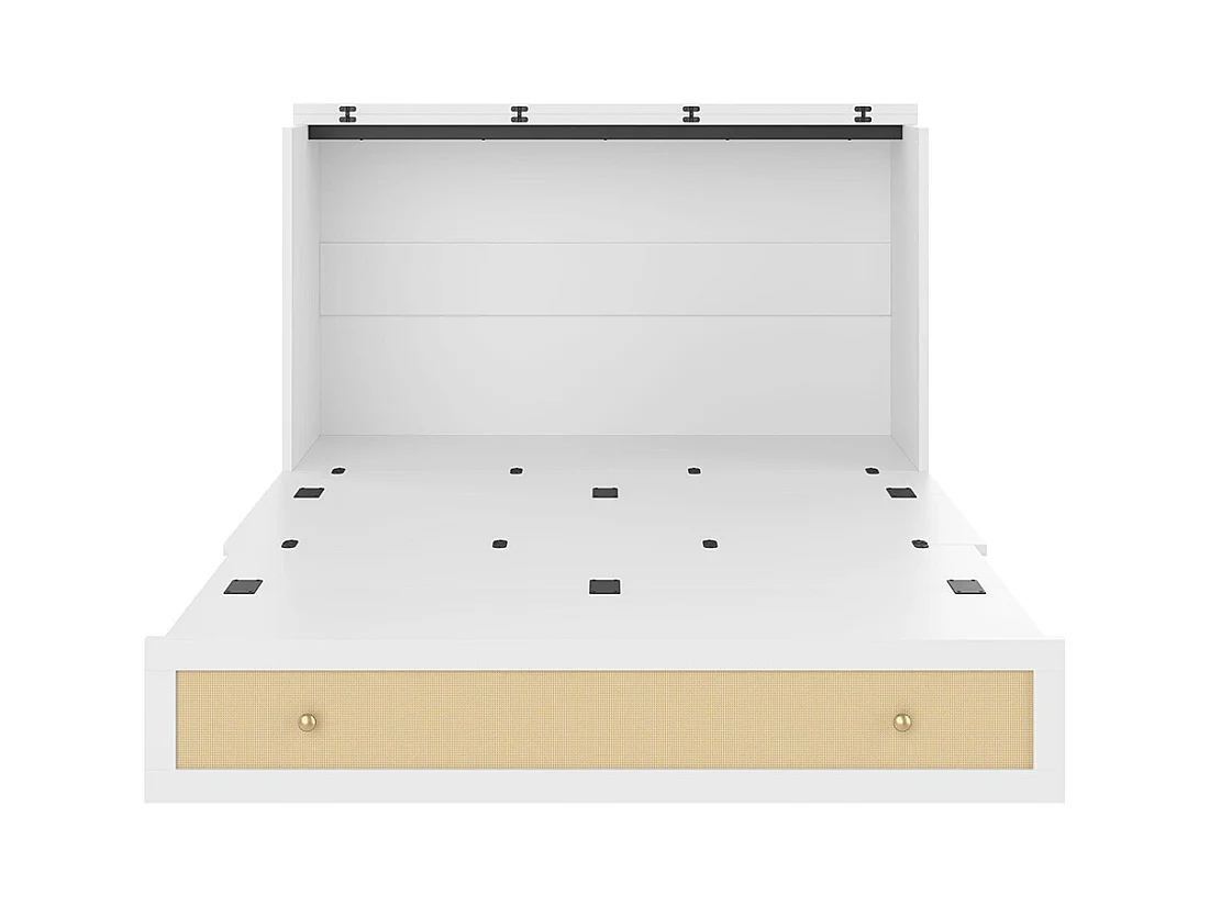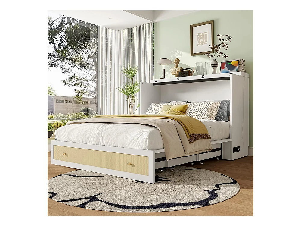 Lit escamotable mobile 140x200 cm tiroirs pied étagère tête USB électrique sans matelas blanc