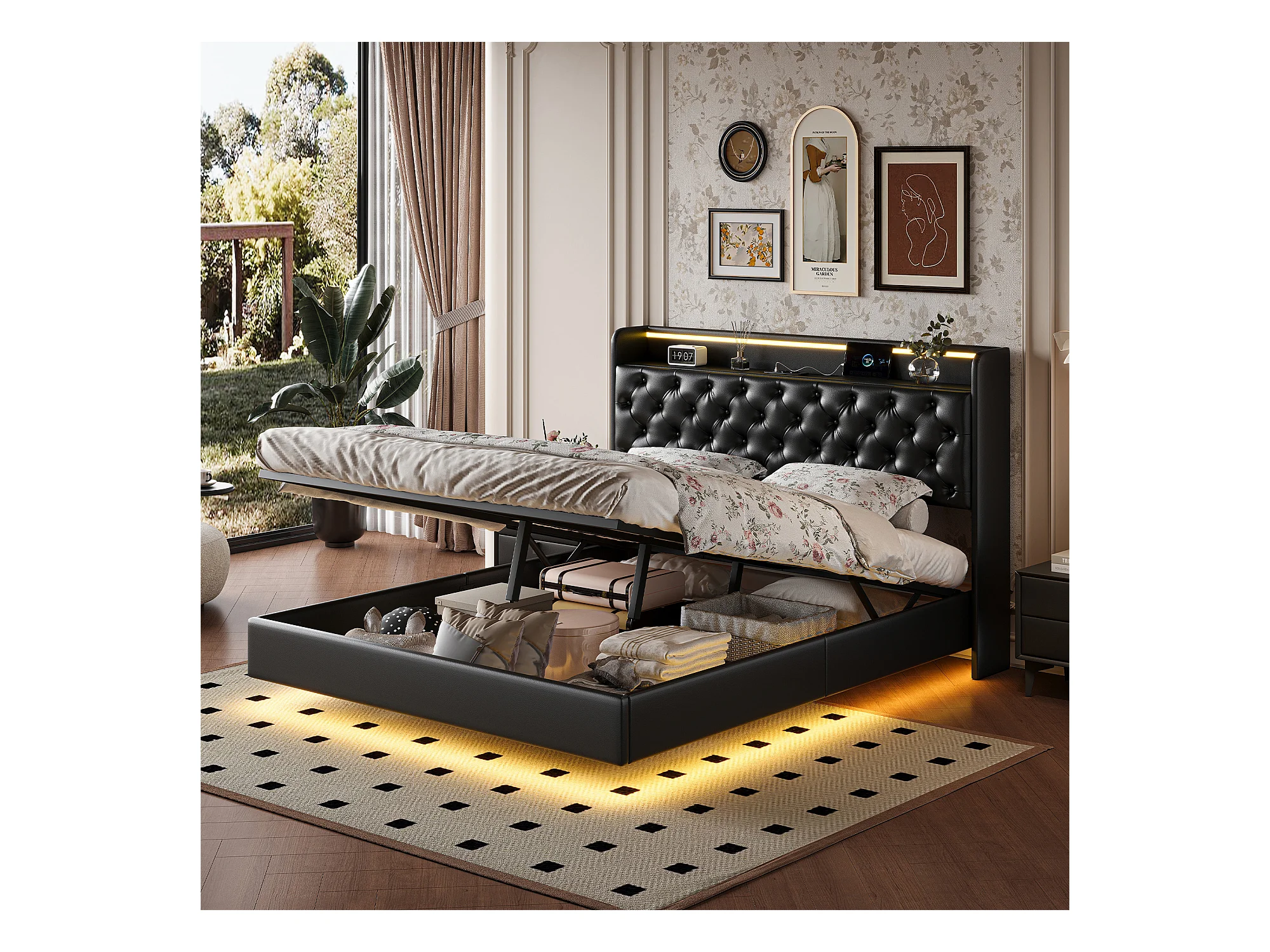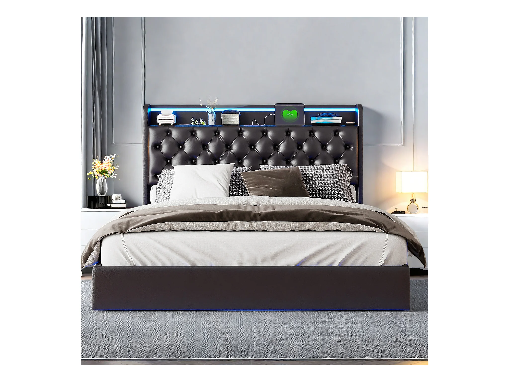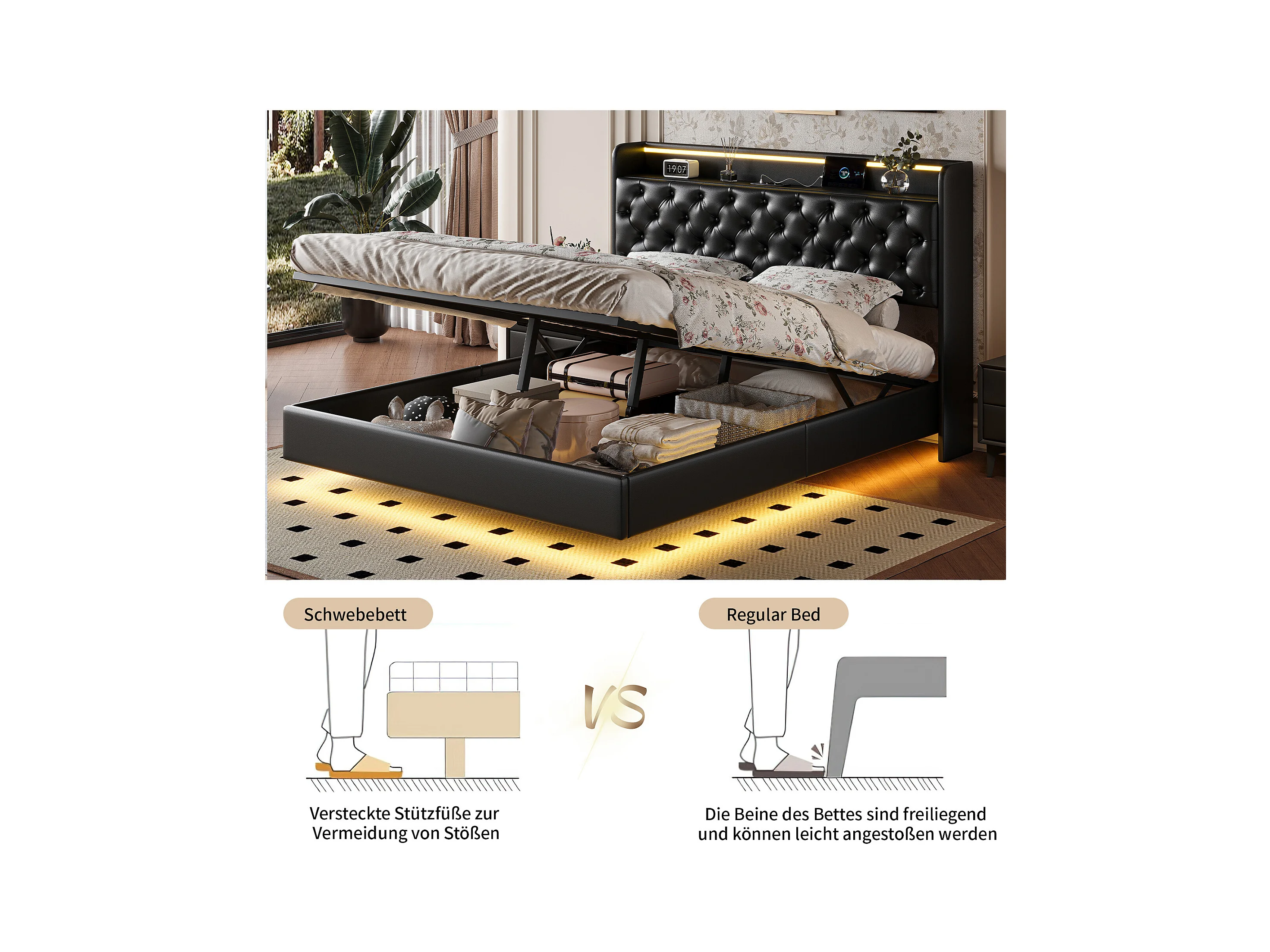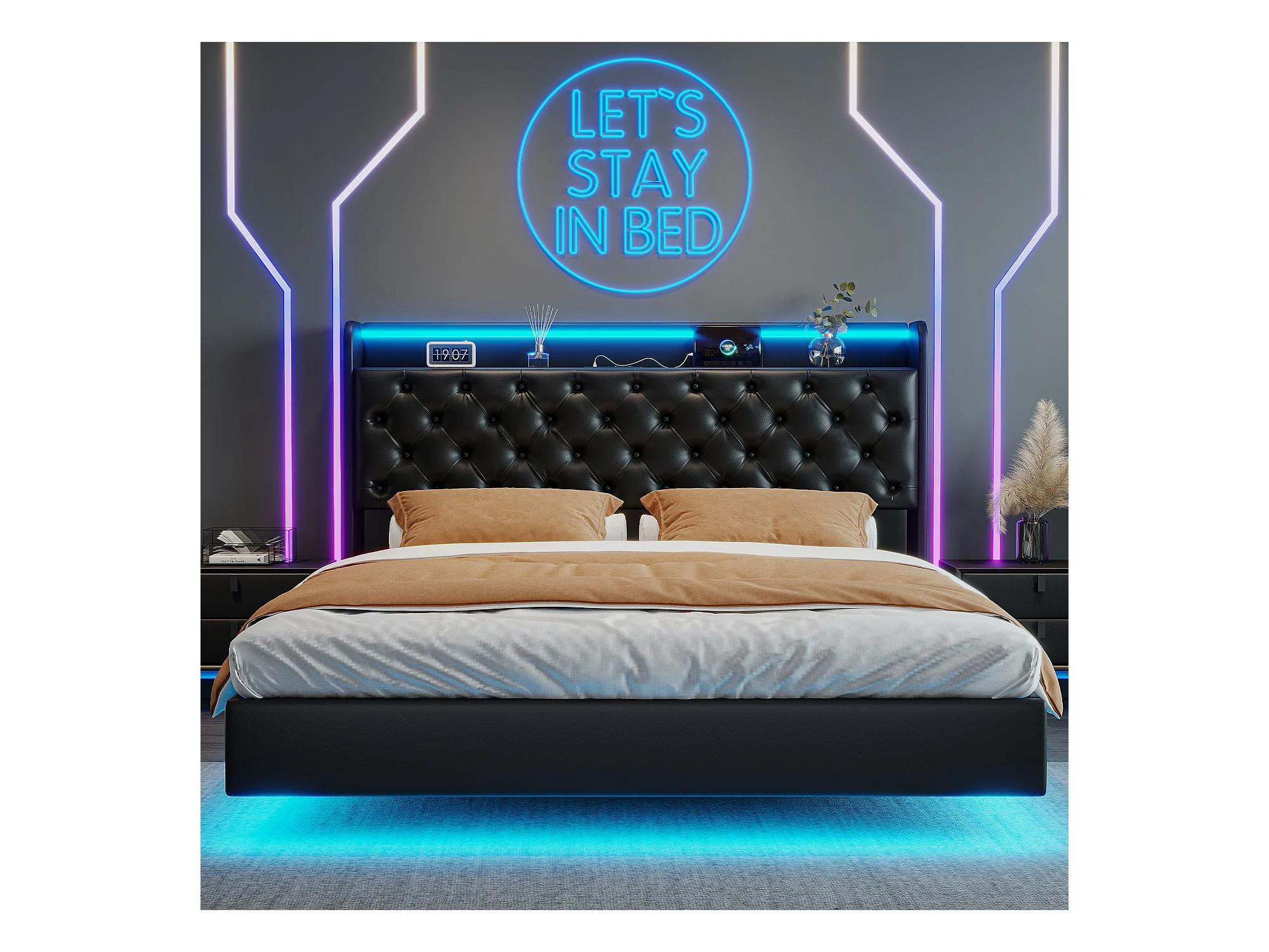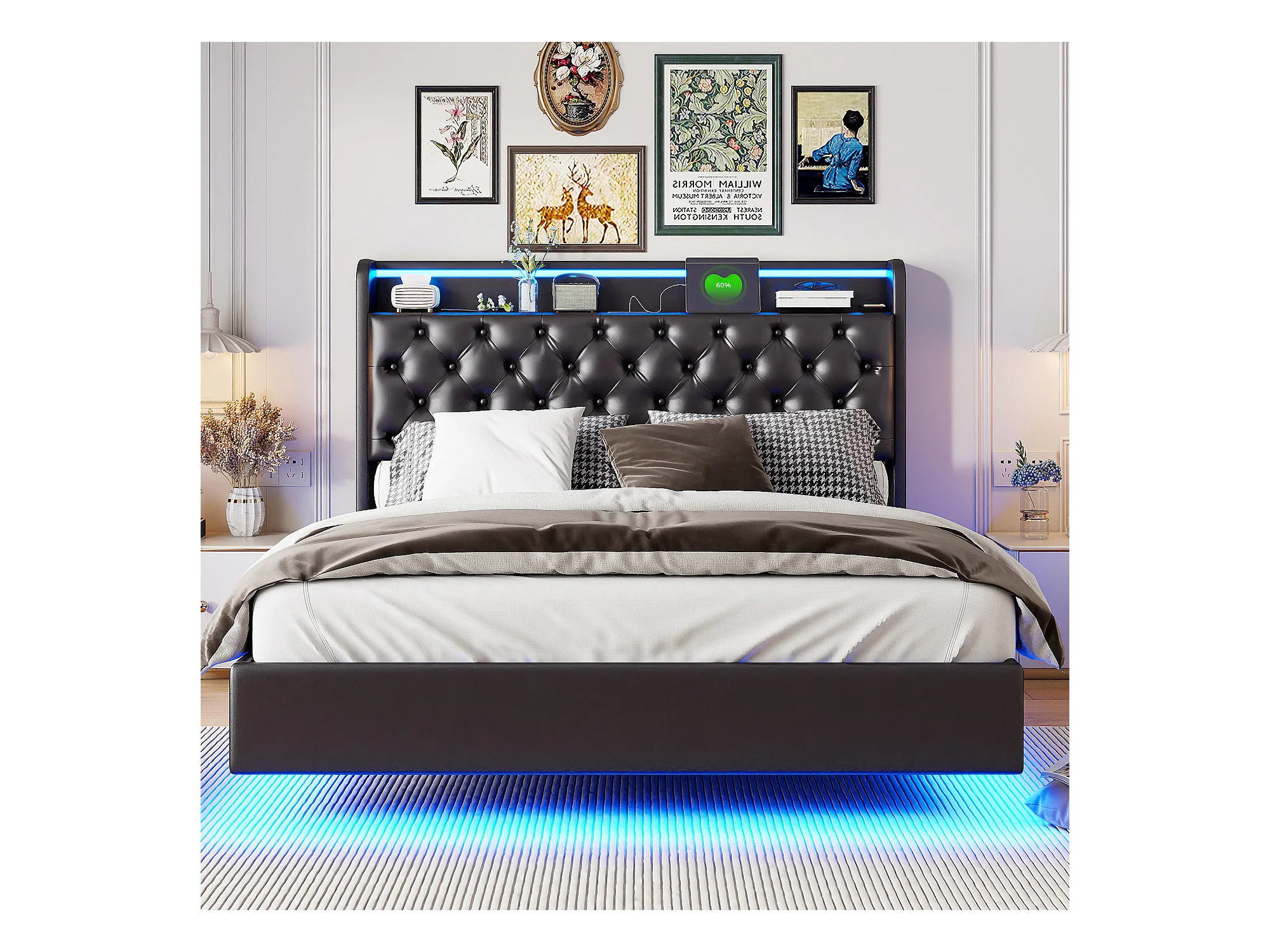 Lit flottant 160x200cm en PU avec LED tête & corps, rangement tête de lit rembourrée & prise EU – Design moderne et pratique