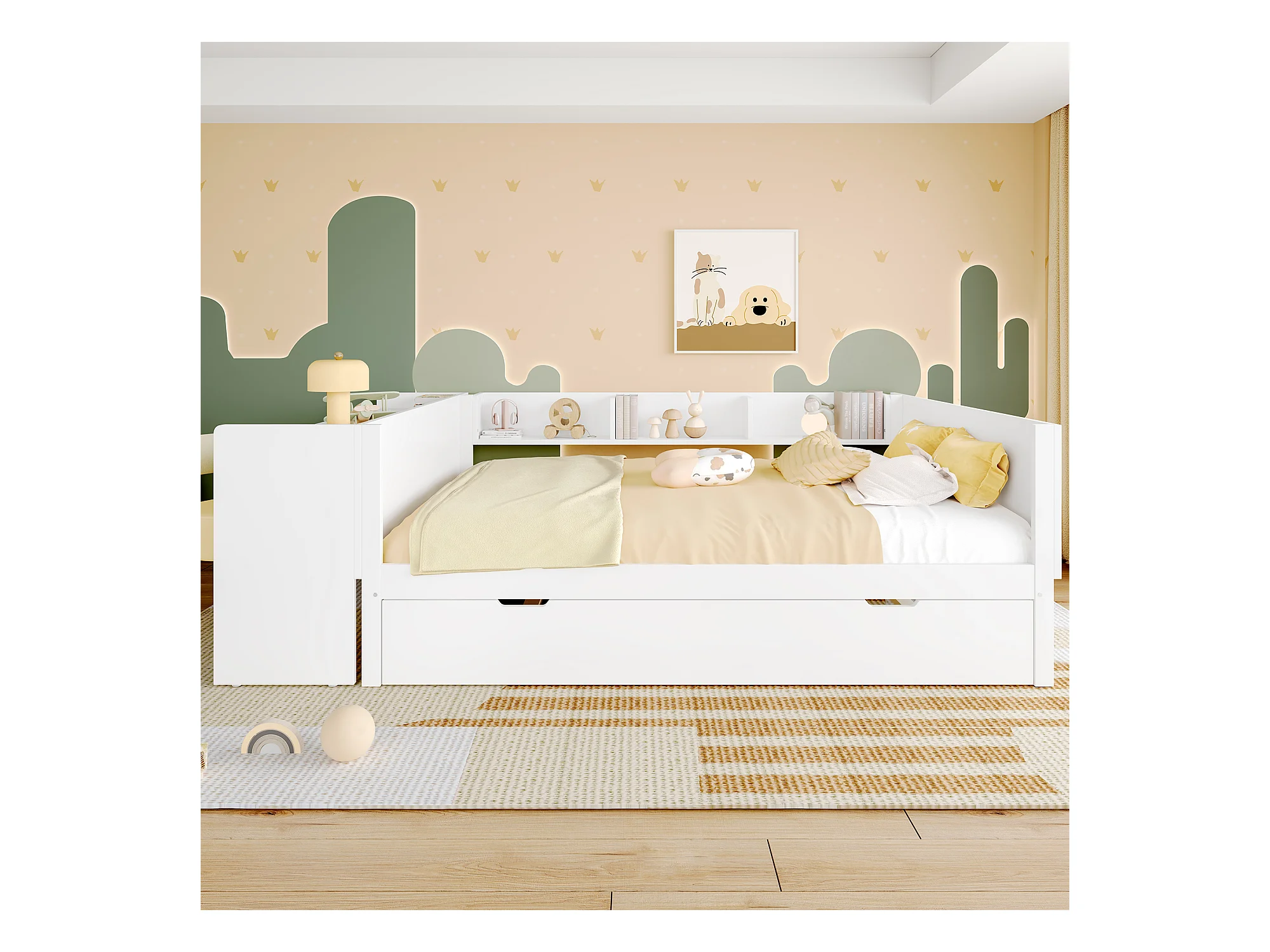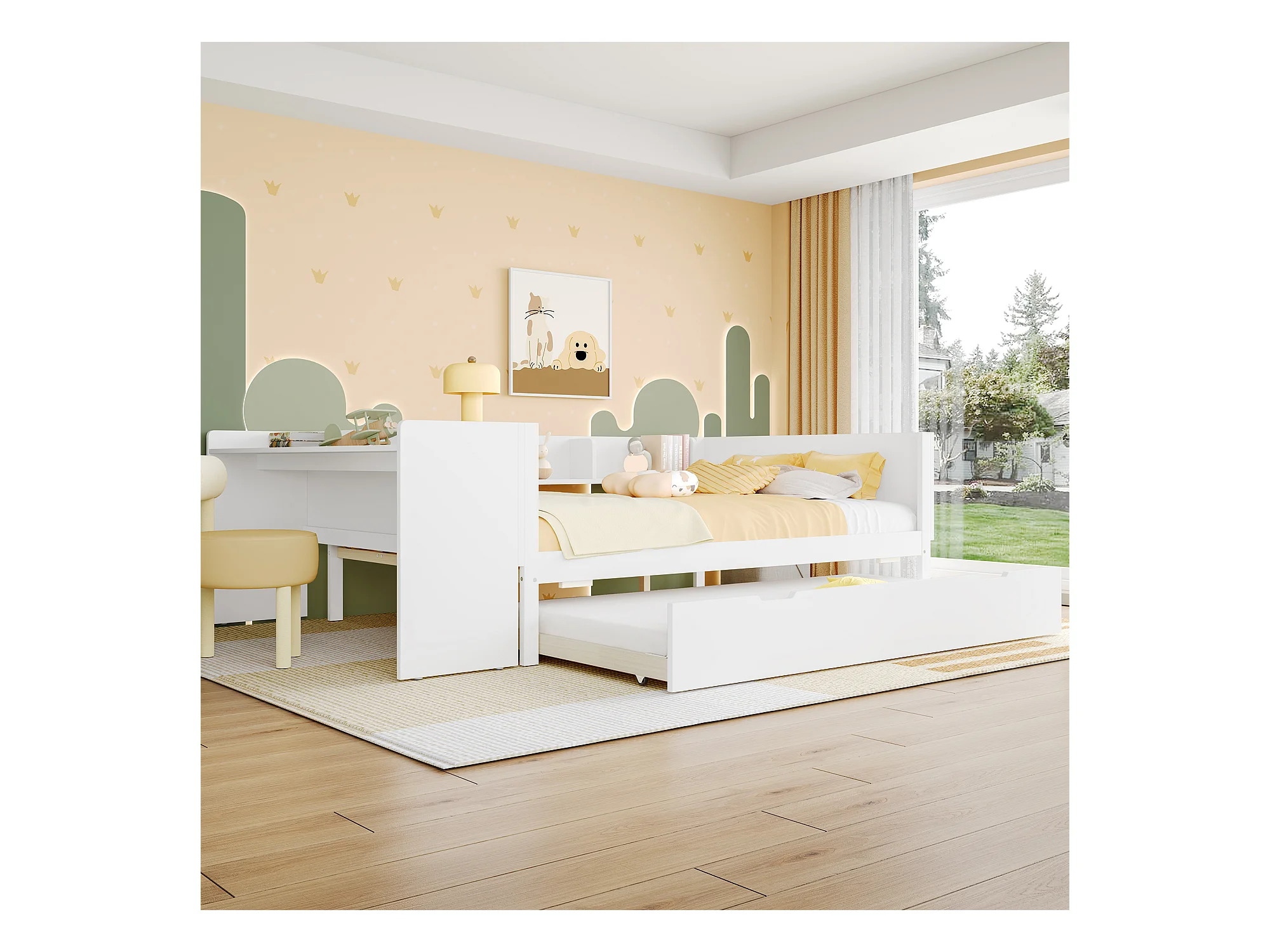 lit gigogne - 140 x 200 cm + 90 x 190 cm - rangements + bureau - sans matelas - pin + aggloméré - blanc