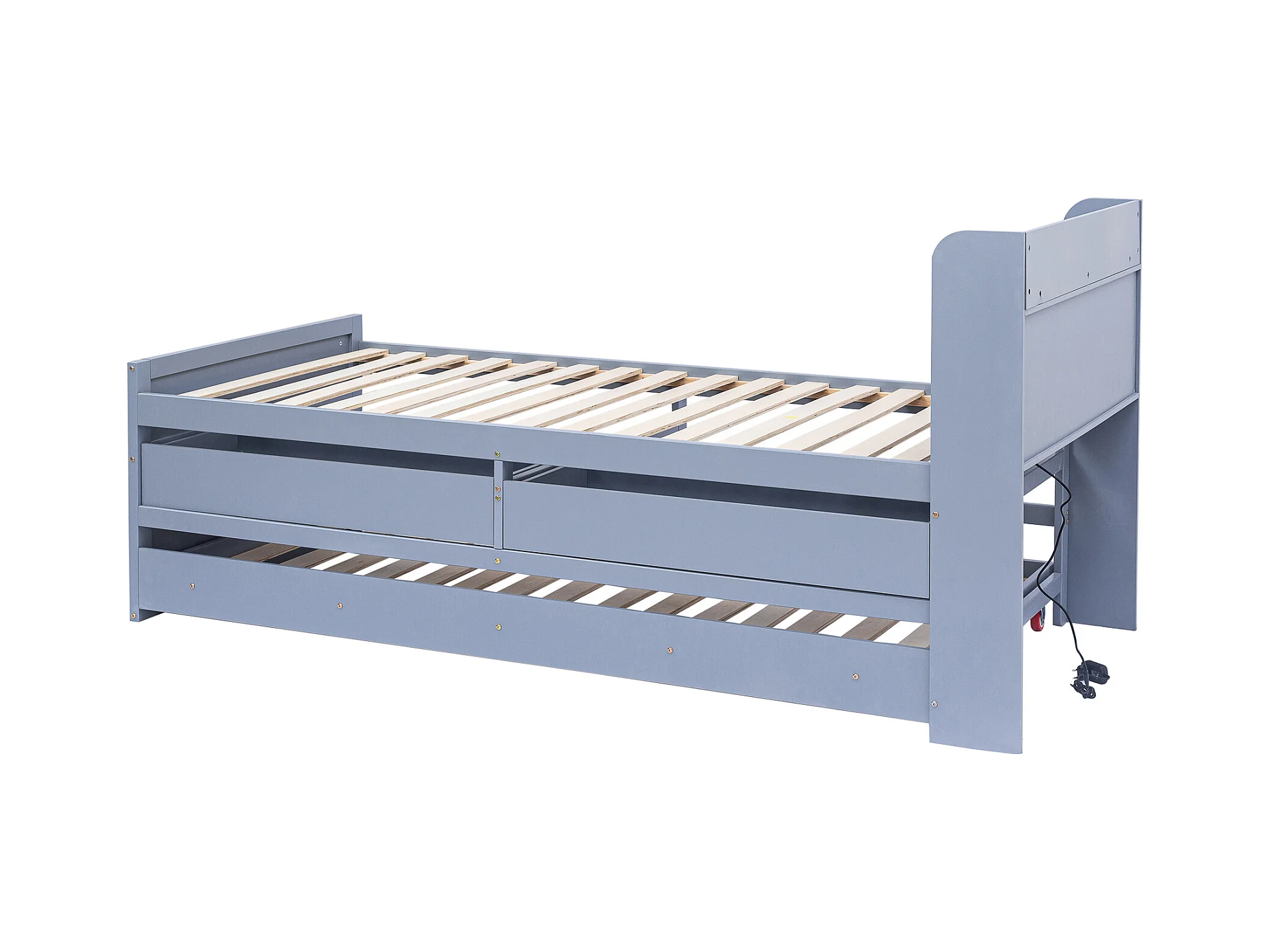Lit enfant 90x190 cm - lit gigogne avec tiroirs et prise USB - bois massif - gris - sans matelas