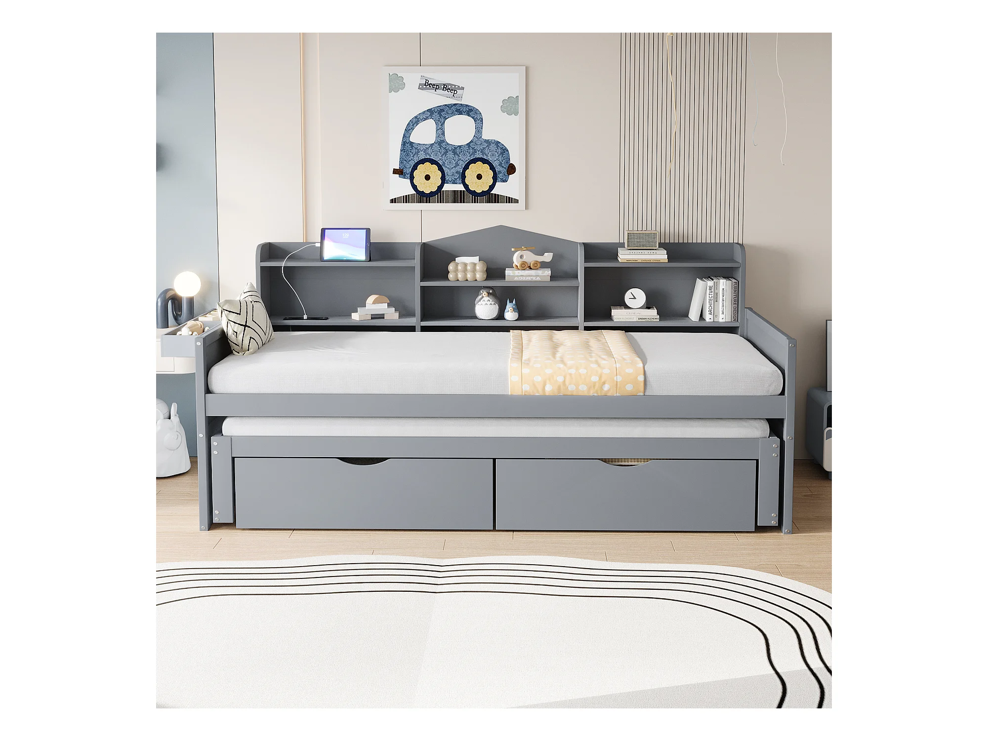 Lit gigogne 90 x 200 + 90 x 190 cm avec 2 tiroirs, étagères et prise USB - Panneaux de particules et MDF - Gris