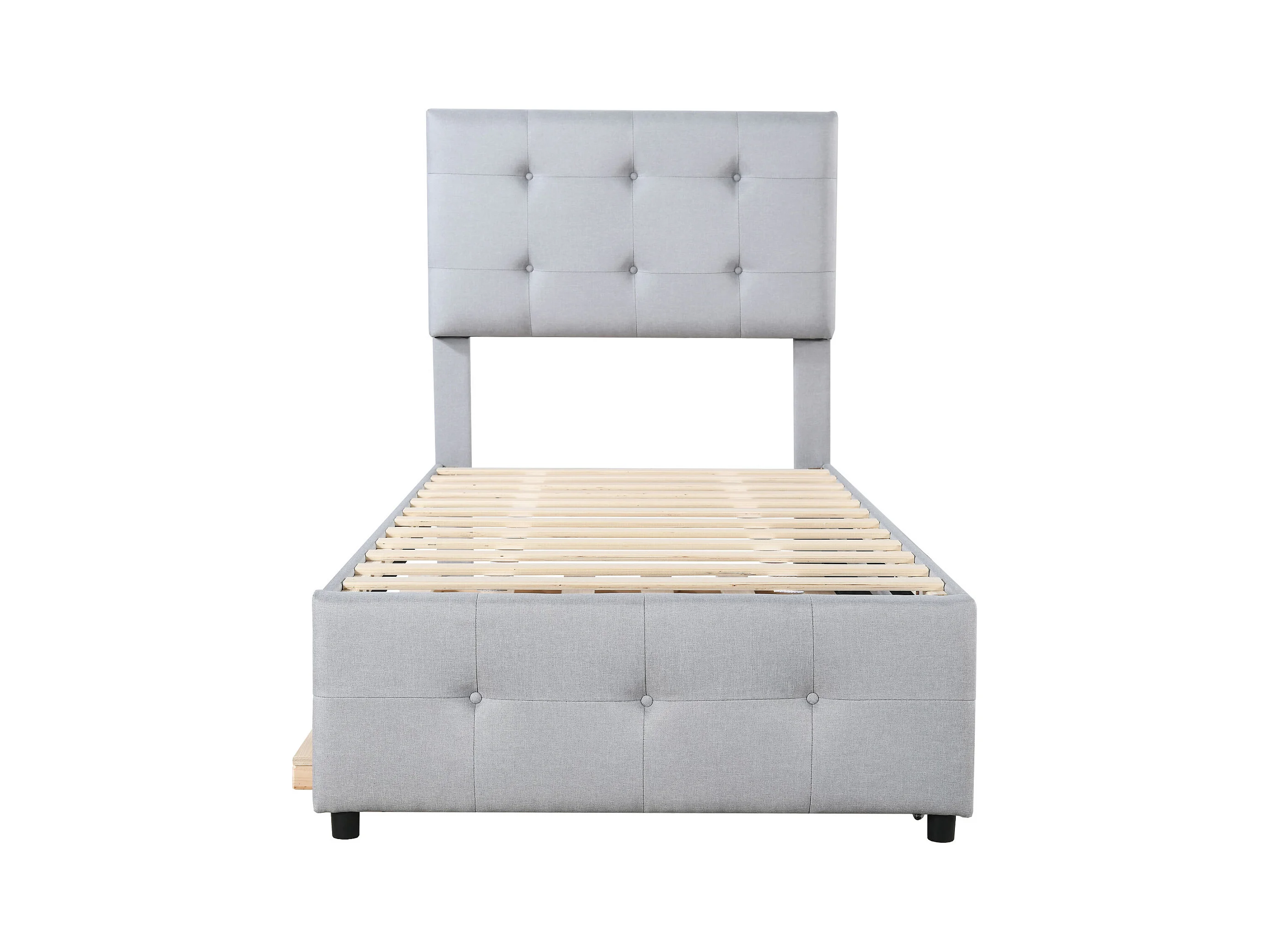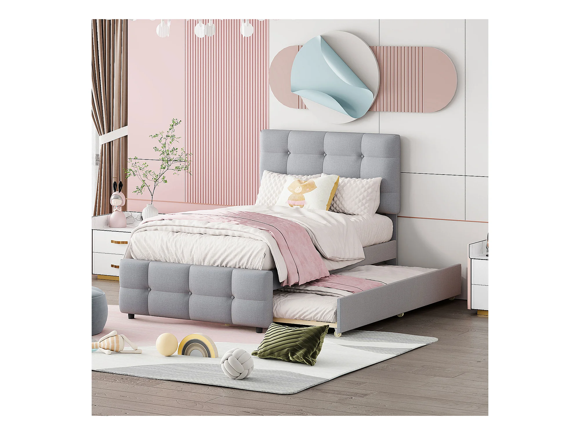 Lit gigogne 90x190/200 cm - Lit enfant avec tête de lit réglable - sommier à lattes en bois - lin gris