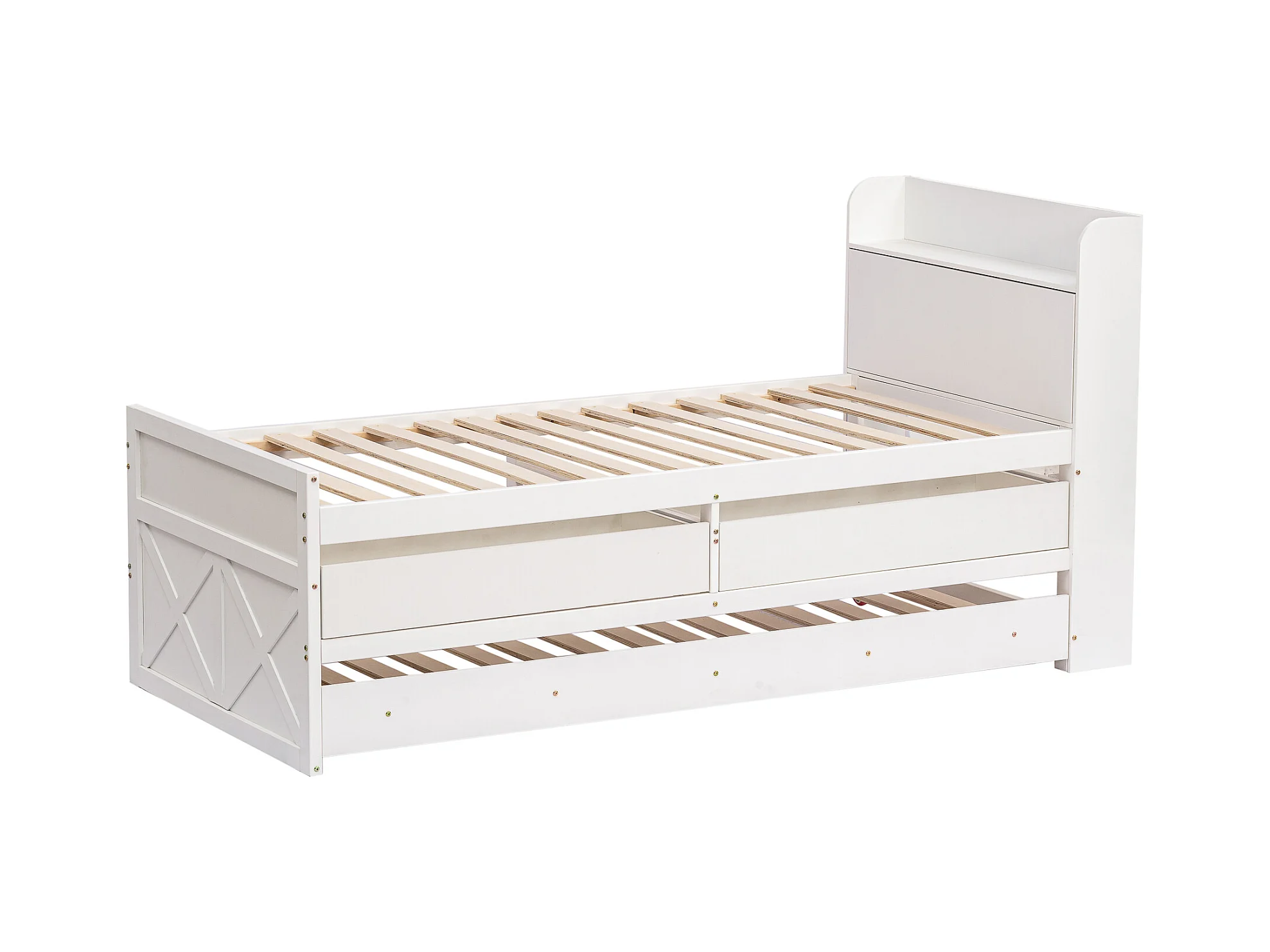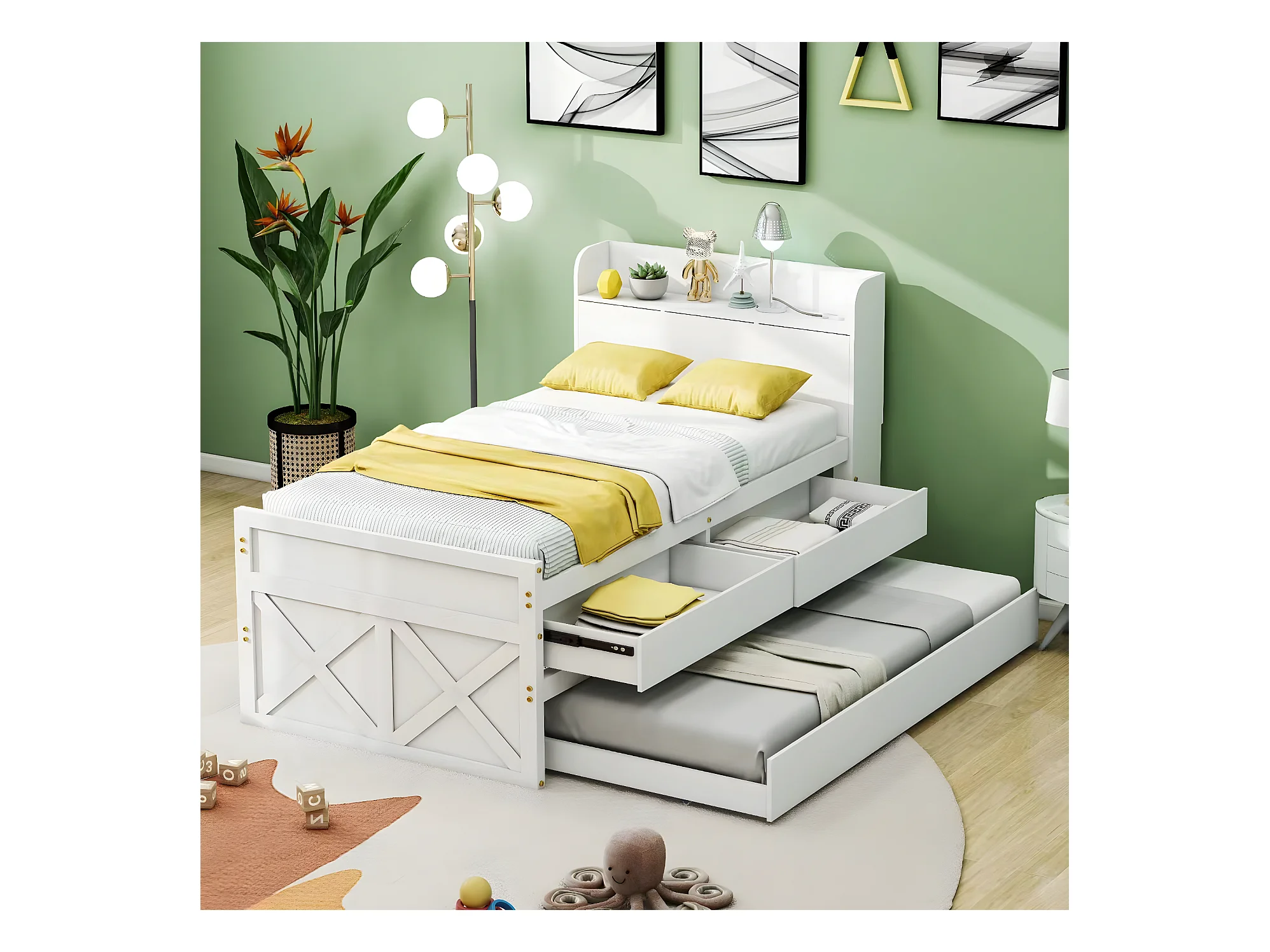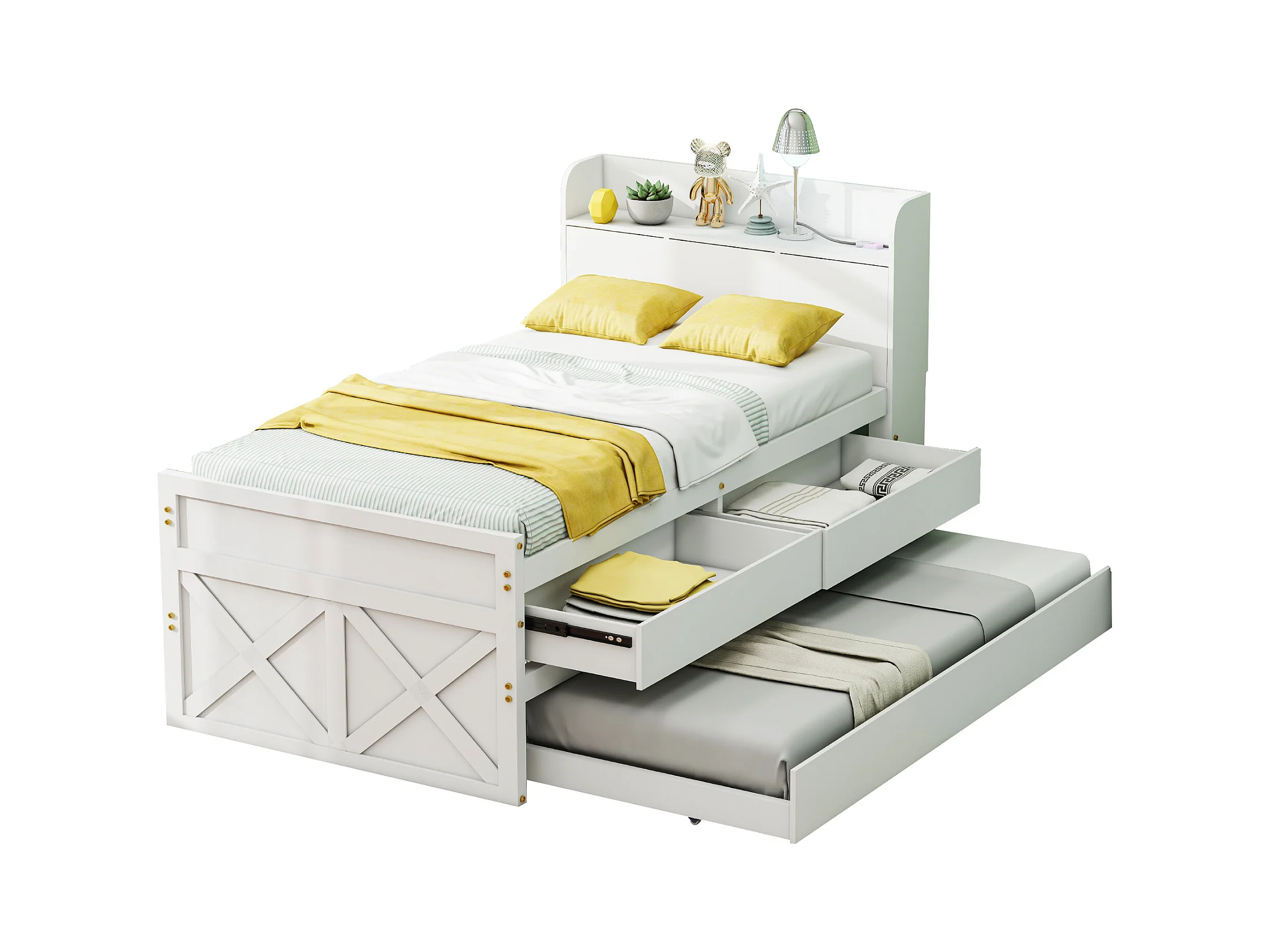 Lit enfant 90x190 cm lit simple avec lit gigogne, tiroirs et prise USB - bois massif - blanc - sans matelas