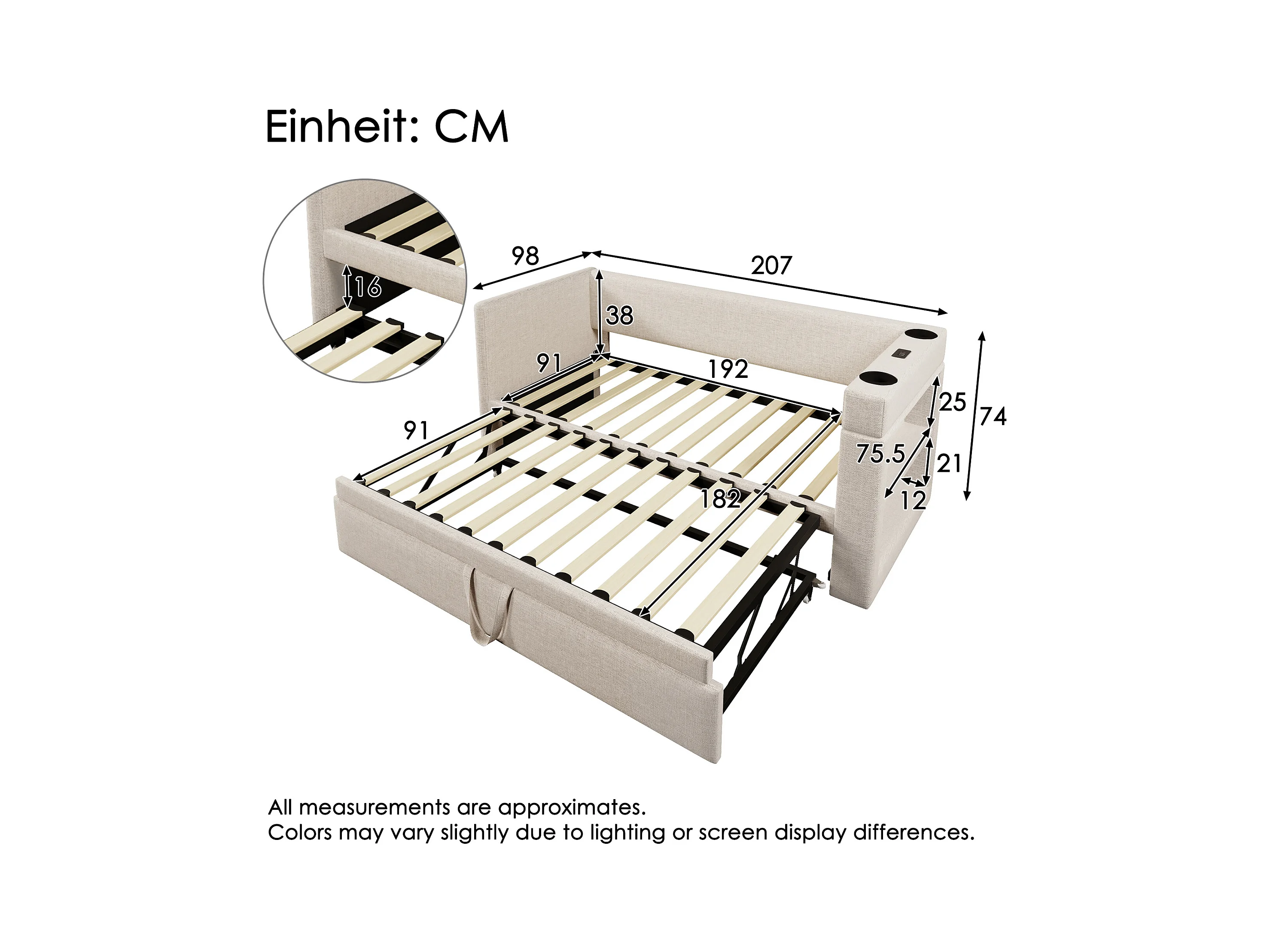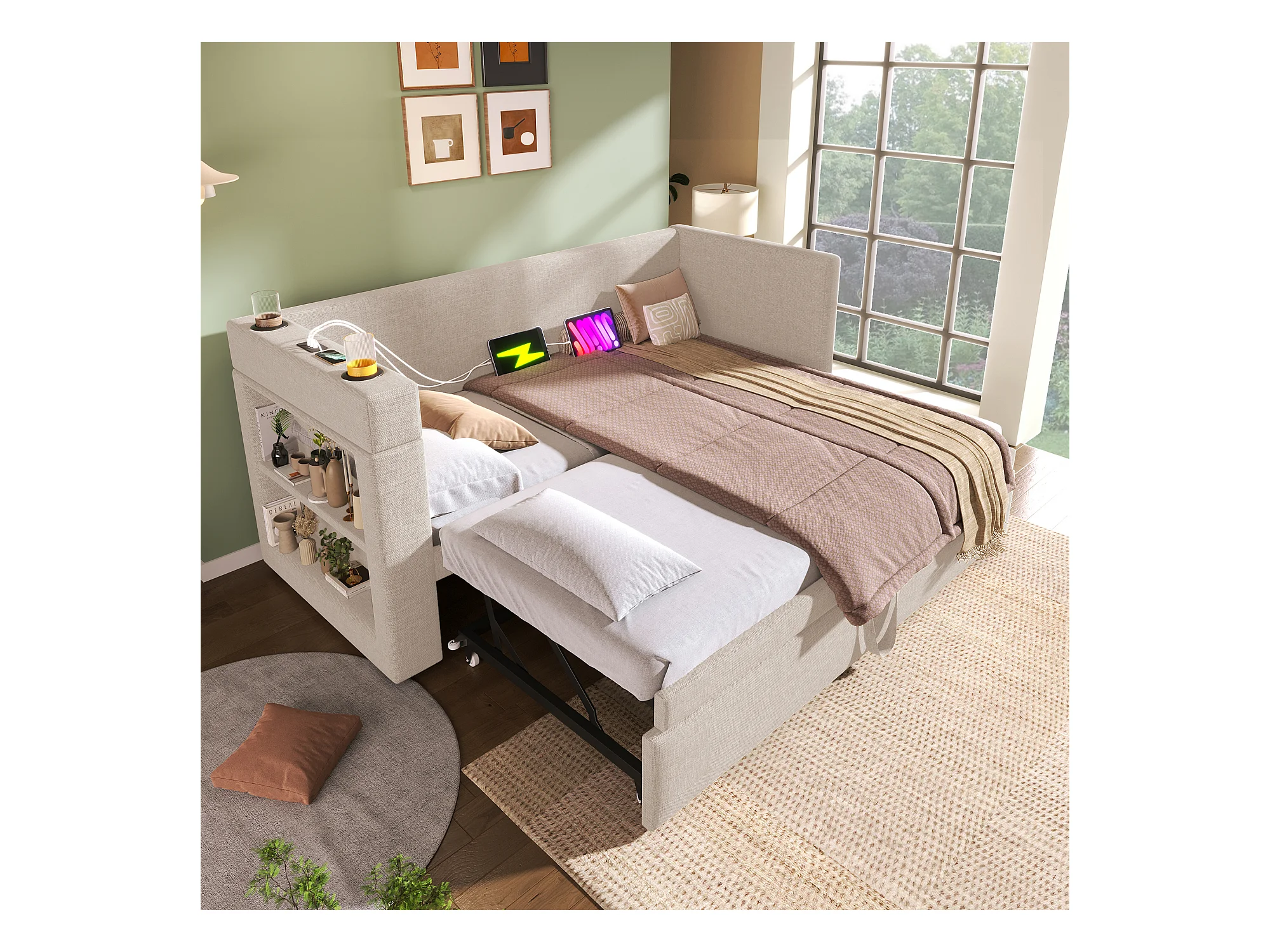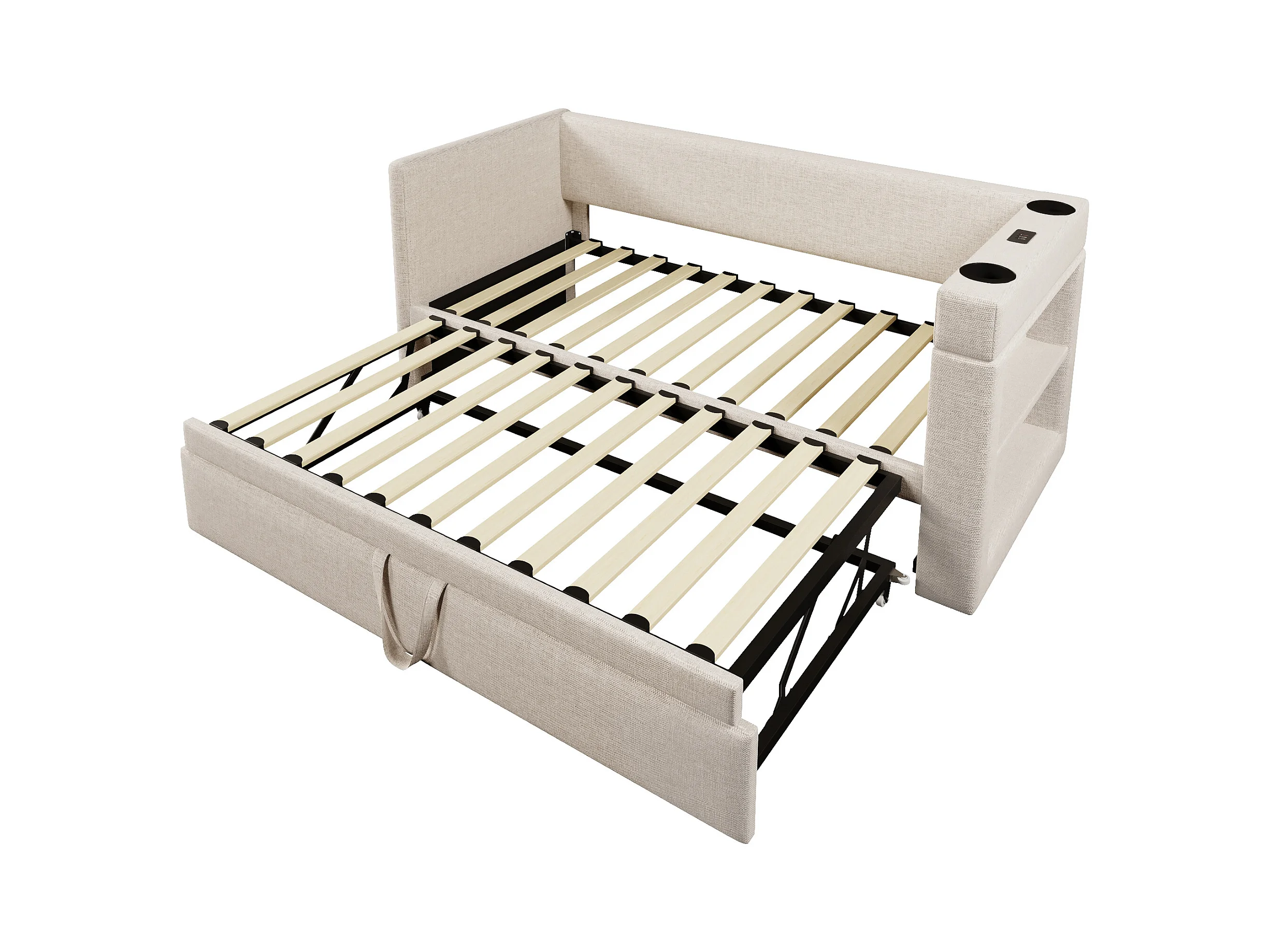 Lit gigogne 90x190 cm - Lit baldaquin avec recharge USB et 2 porte-gobelets - rangements ouverts - beige