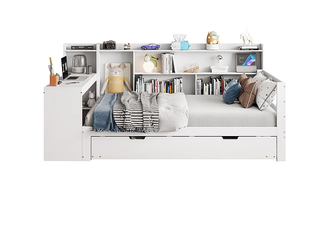 Lit gigogne 90x200 avec bureau étagères compartiments de rangement et étagères avec prises de courant lit simple en bois Blanc