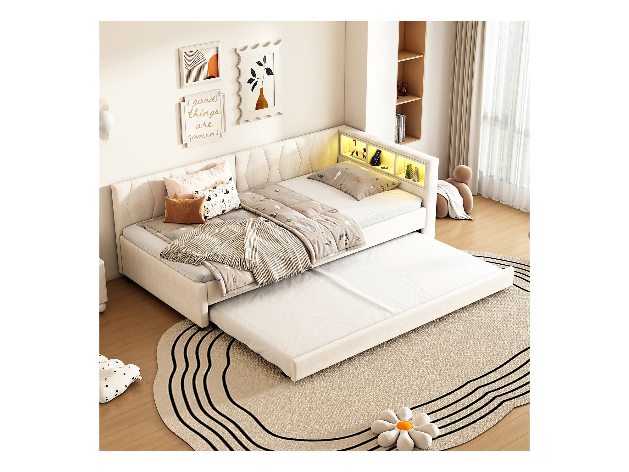 Lit gigogne 90x200 cm - Lit enfant avec éclairage LED et recharge USB - rangements ouverts - lin beige