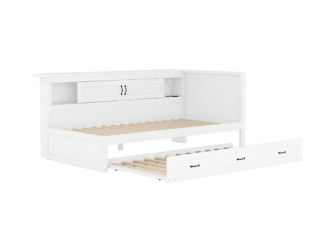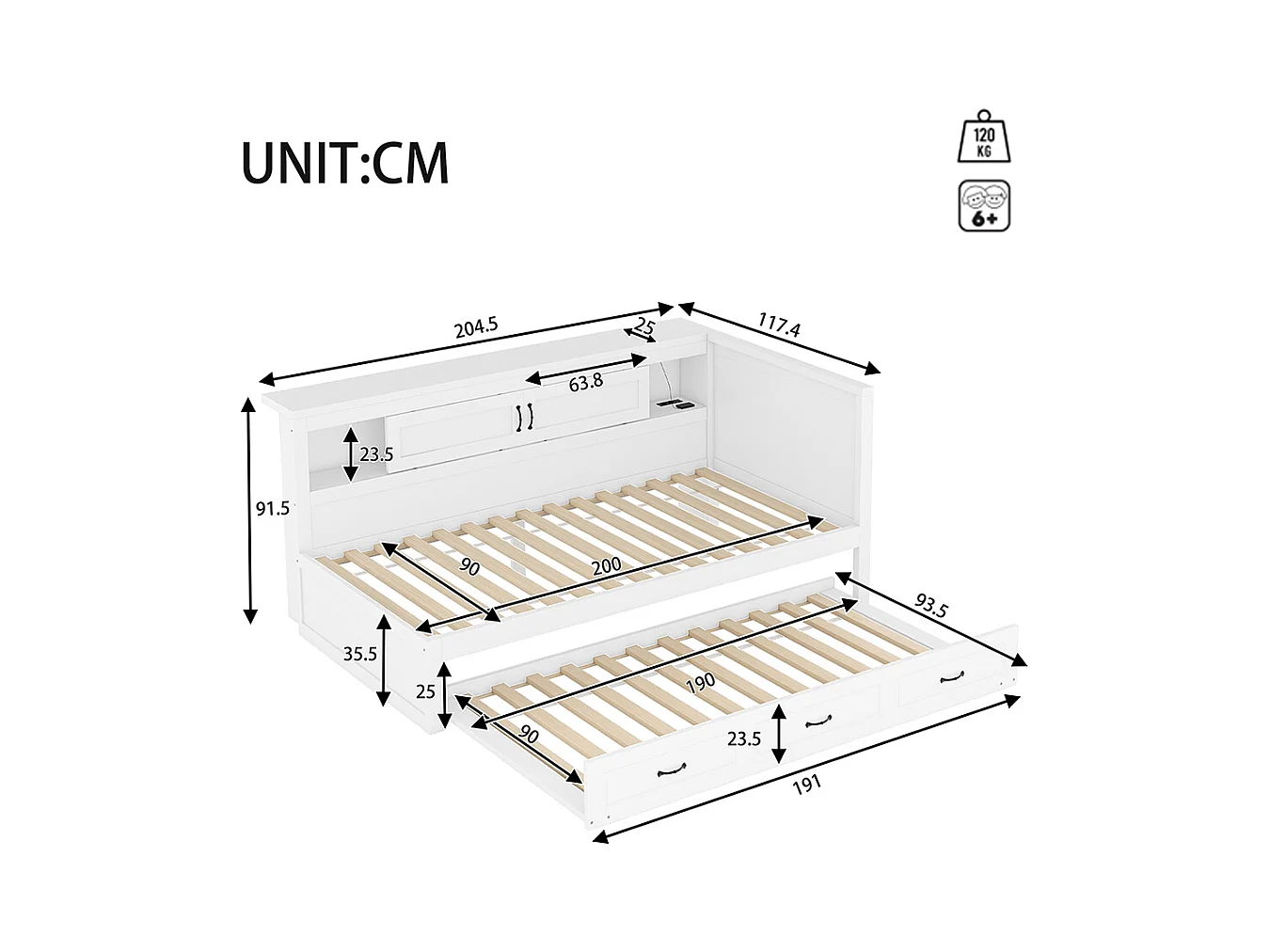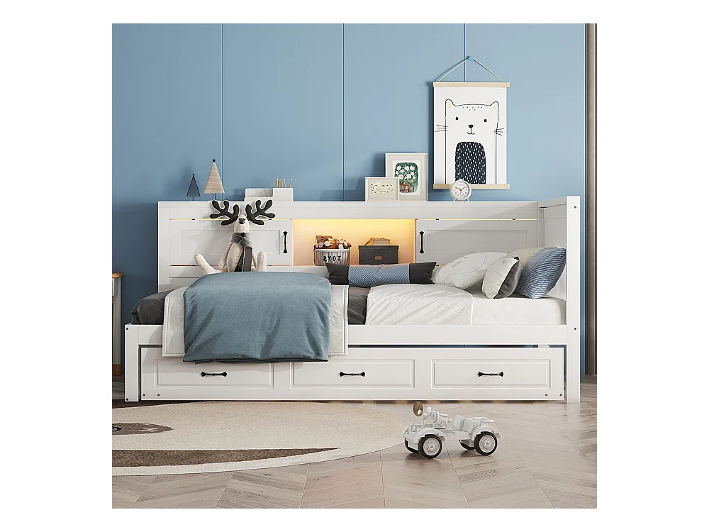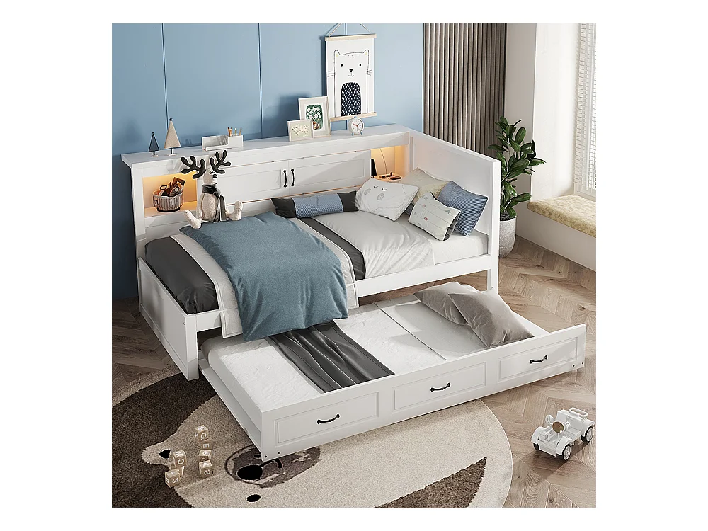 Lit gigogne 90x200 éclairage d'ambiance télécommandé compartiment de rangement côté lit lit extensible prise + USB Blanc
