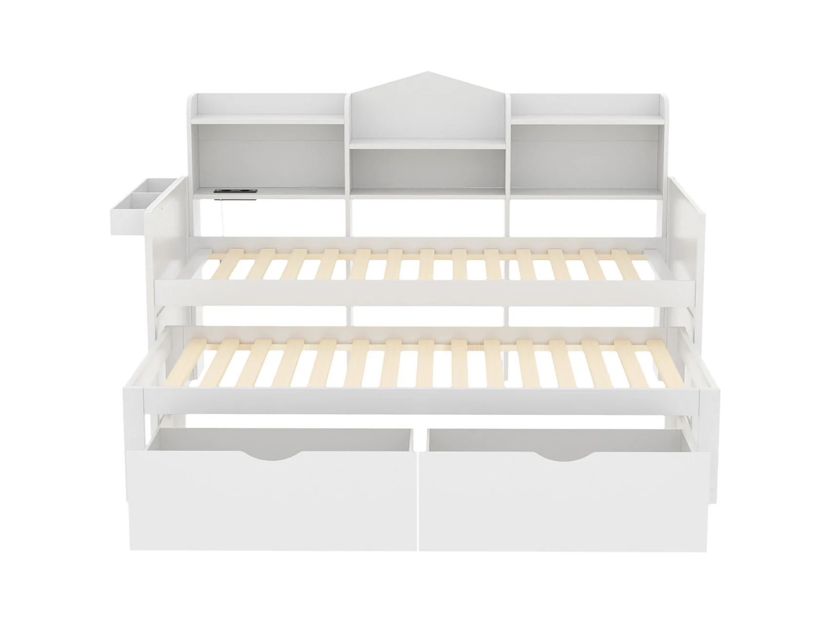 Lit gigogne 90x200cm+90x190cm - cadre en bois massif avec sommier à lattes, prise USB, étagères et 2 tirois, blanc