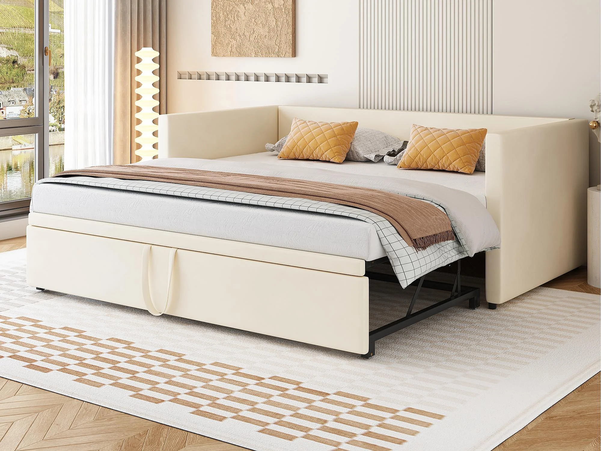 Lit banquette en velours 90/180x200cm - avec lit gigogne - avec sommier à lattes - Beige