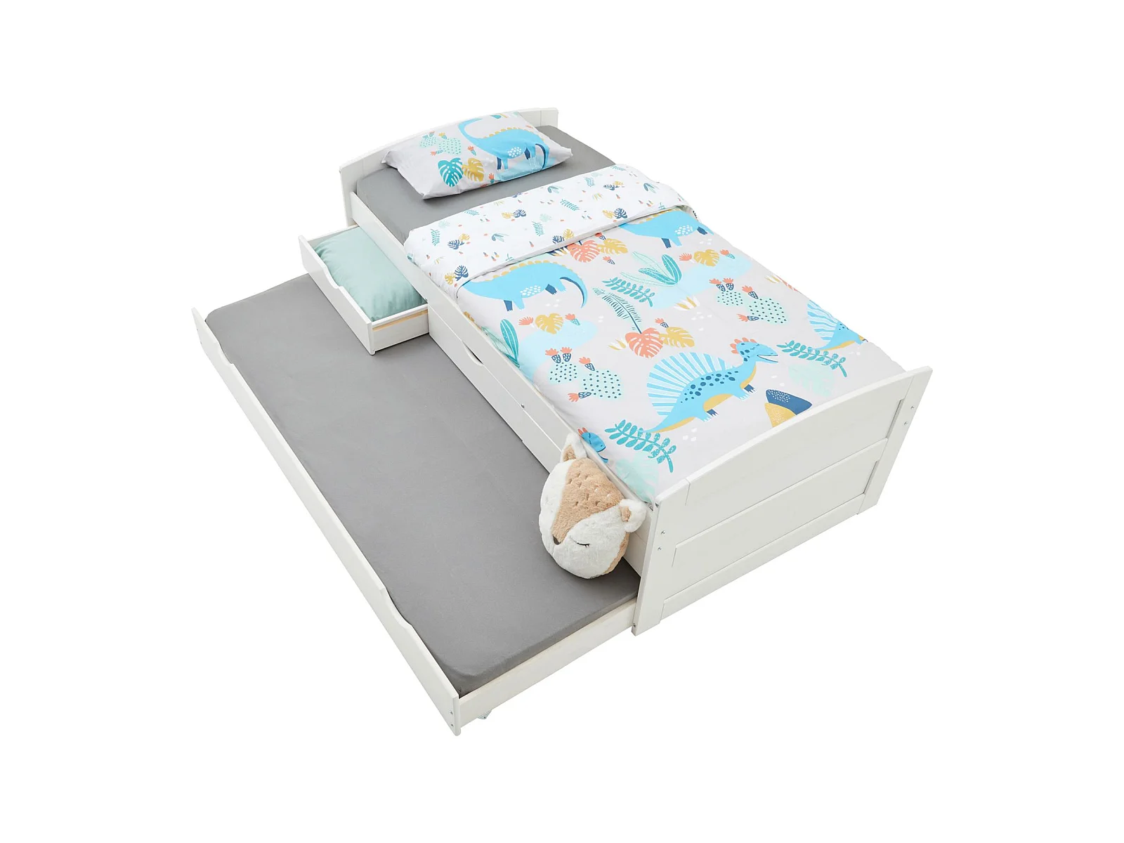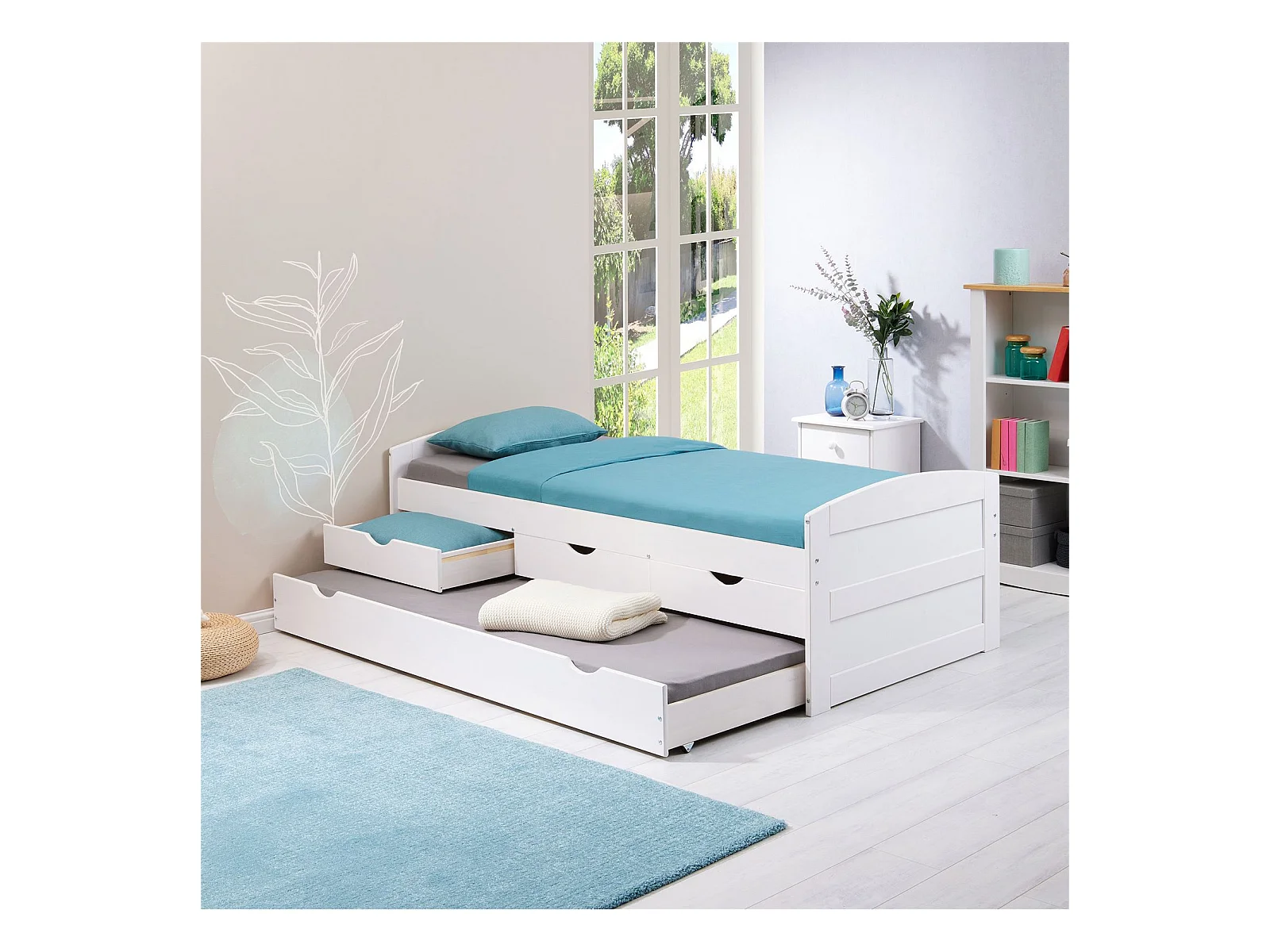 Lit gigogne JESSY lit enfant fonctionnel avec tiroir-lit et rangement 3 tiroirs, couchage 90x190 cm, en pin massif lasuré blanc