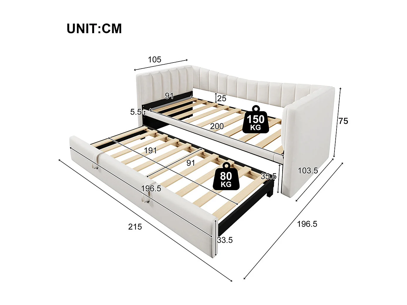 Lit gigogne Lit de jour 90x200 cm (180x200 cm) lit simple lit double avec sommier velours style minimaliste Blanc