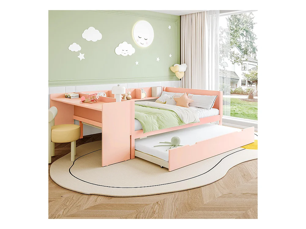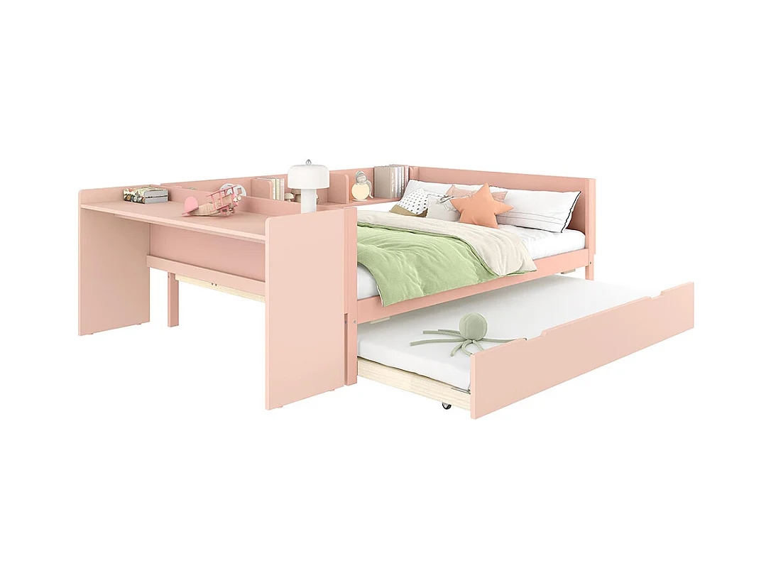 Lit gigogne Lit plat 140x200 cm avec bureau avec lit à roulettes lit double avec étagères pin + panneau de particules Rose