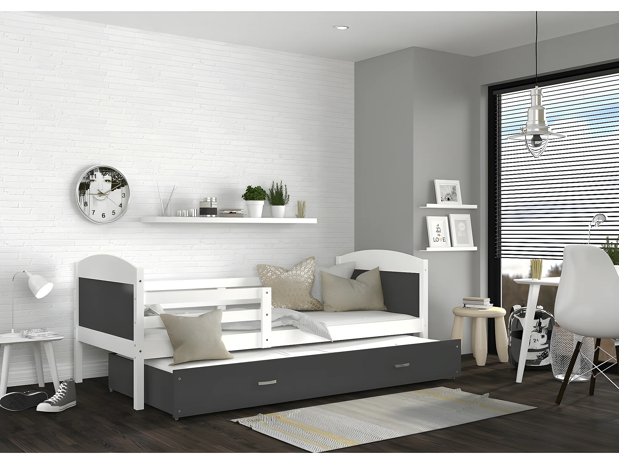Lit Gigogne Mateo 90x190 Blanc - gris Livré avec sommiers, tiroir et matelas en mousse de 7cm