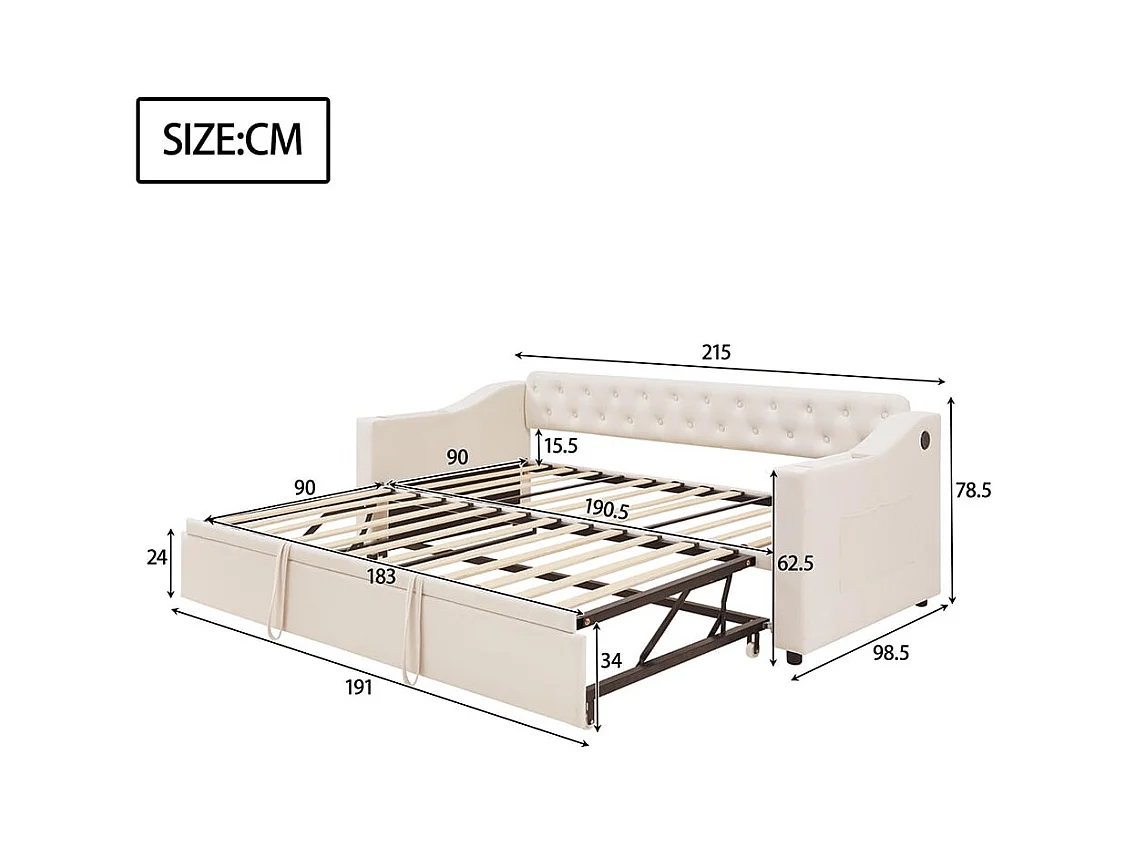 Lit gigogne rembourré, 90/180*190 cm, accoudoirs extra-larges et épais (avec port de charge USB),Beige