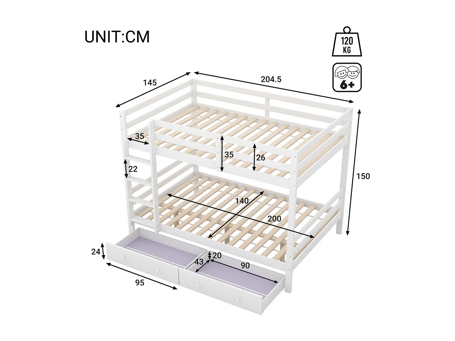 Lit jeune lit 140x200 cm lit superposé avec tiroirs lit simple pin blanc