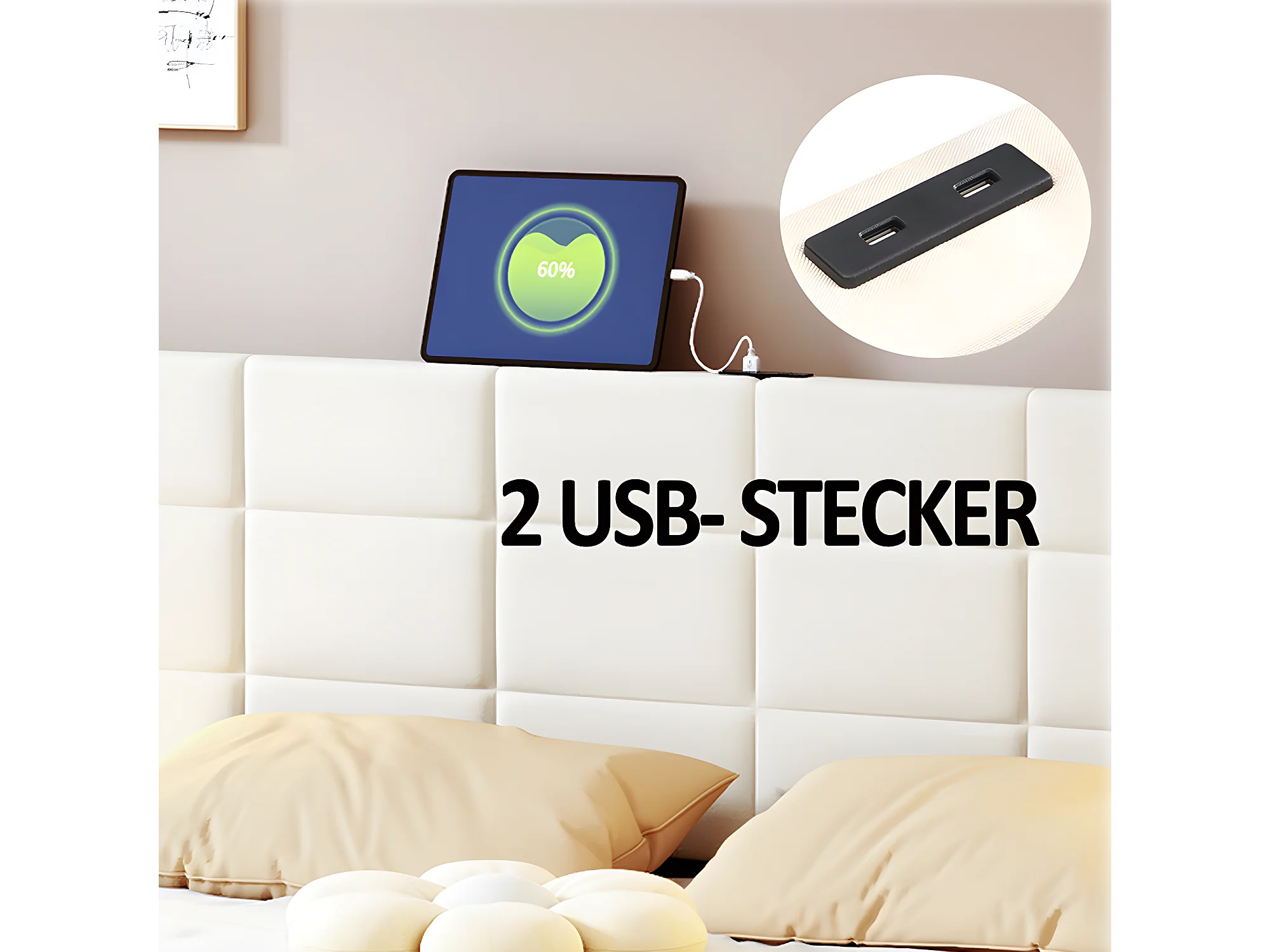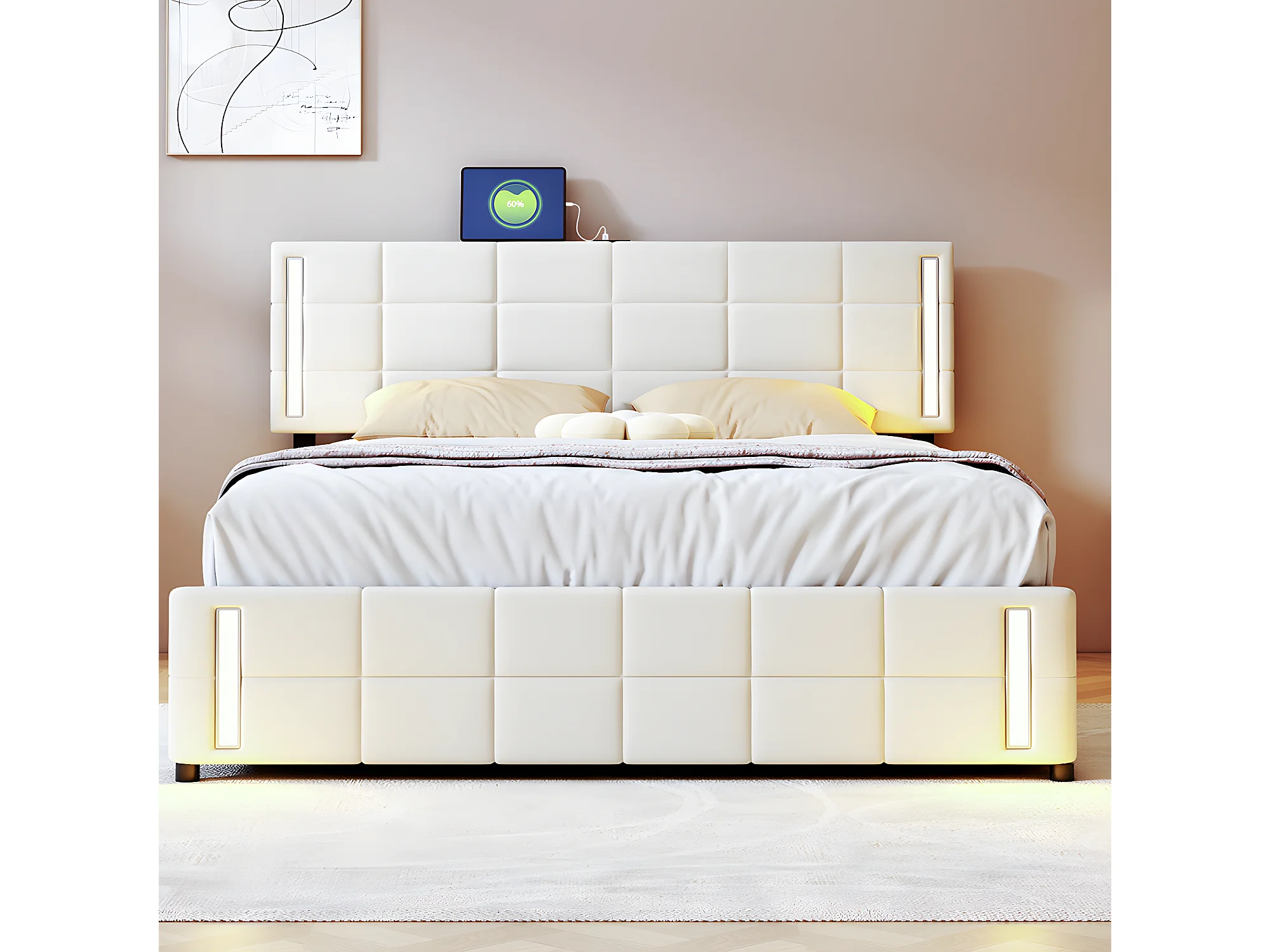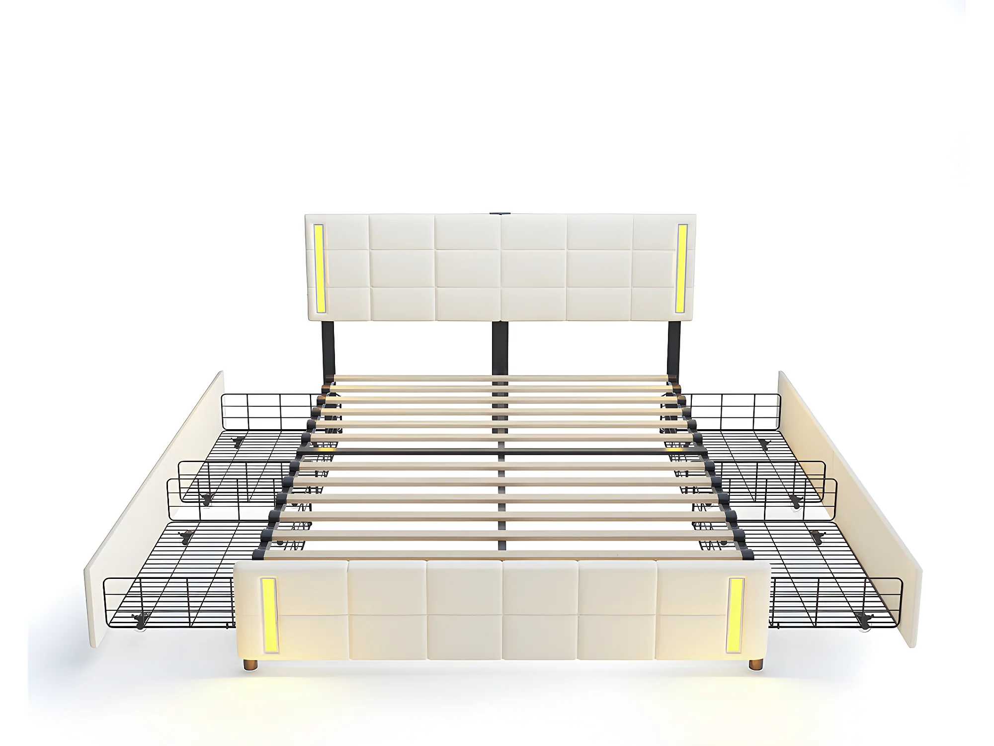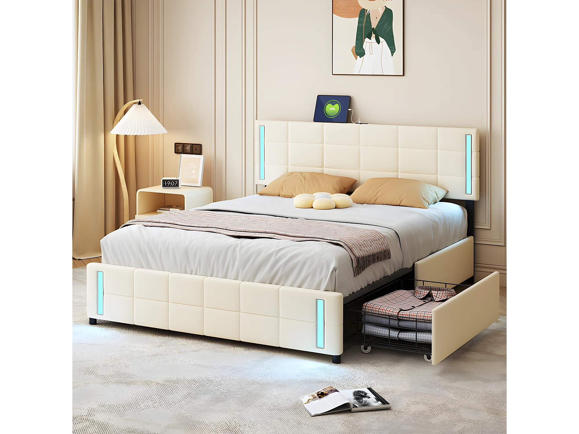 Lit LED avec tête de lit rangements et 4 tiroirs - 180 x 190 cm - Beige - Sweiko
