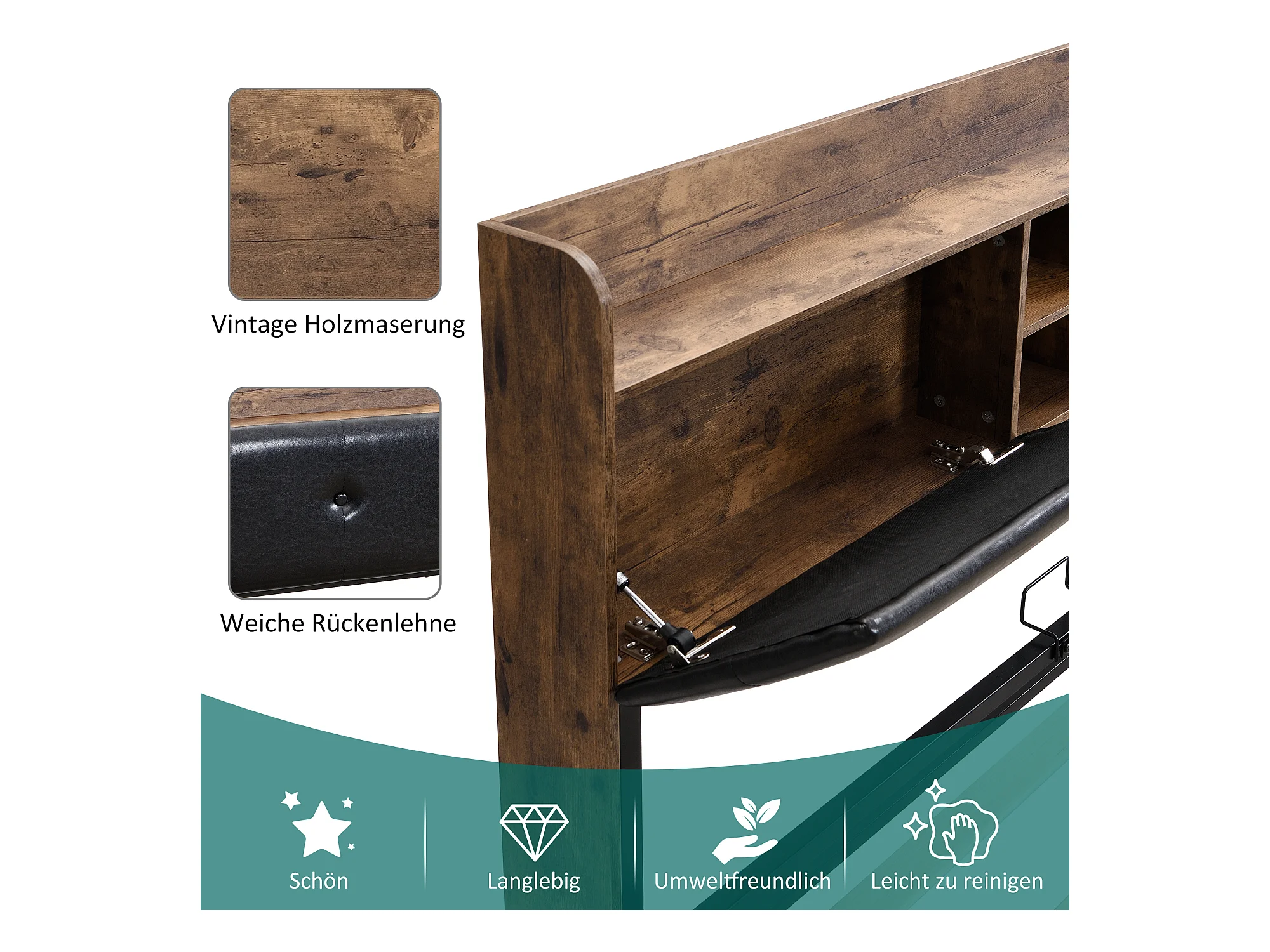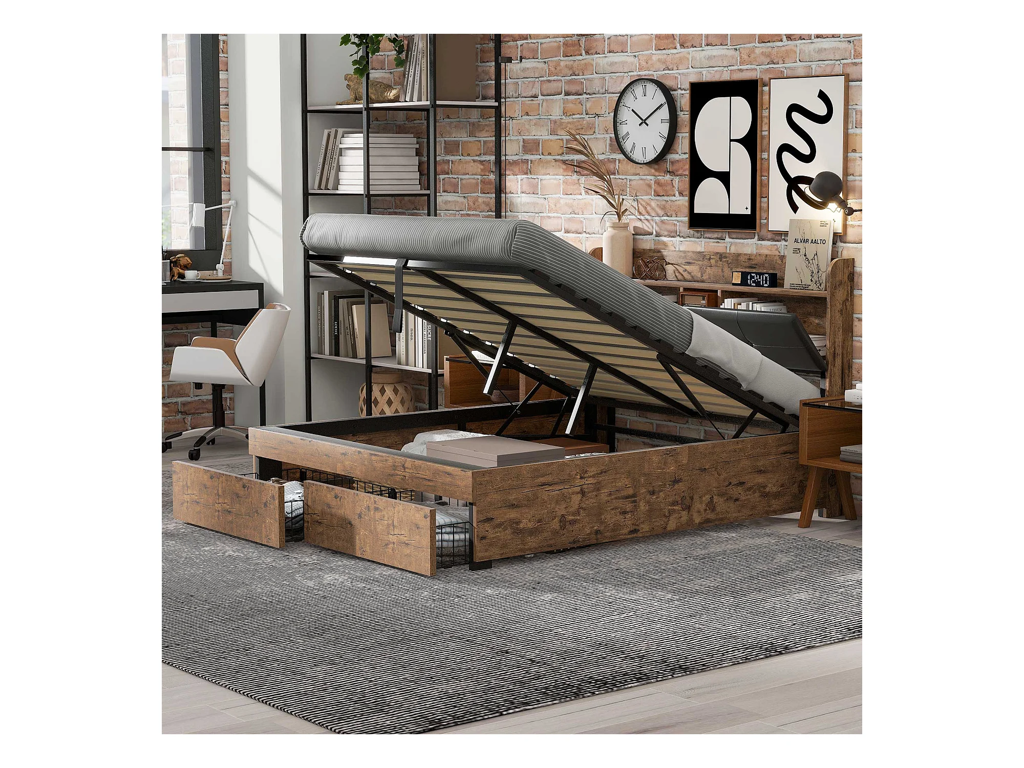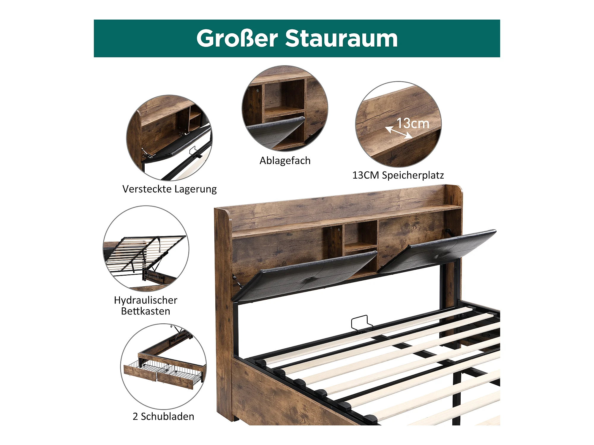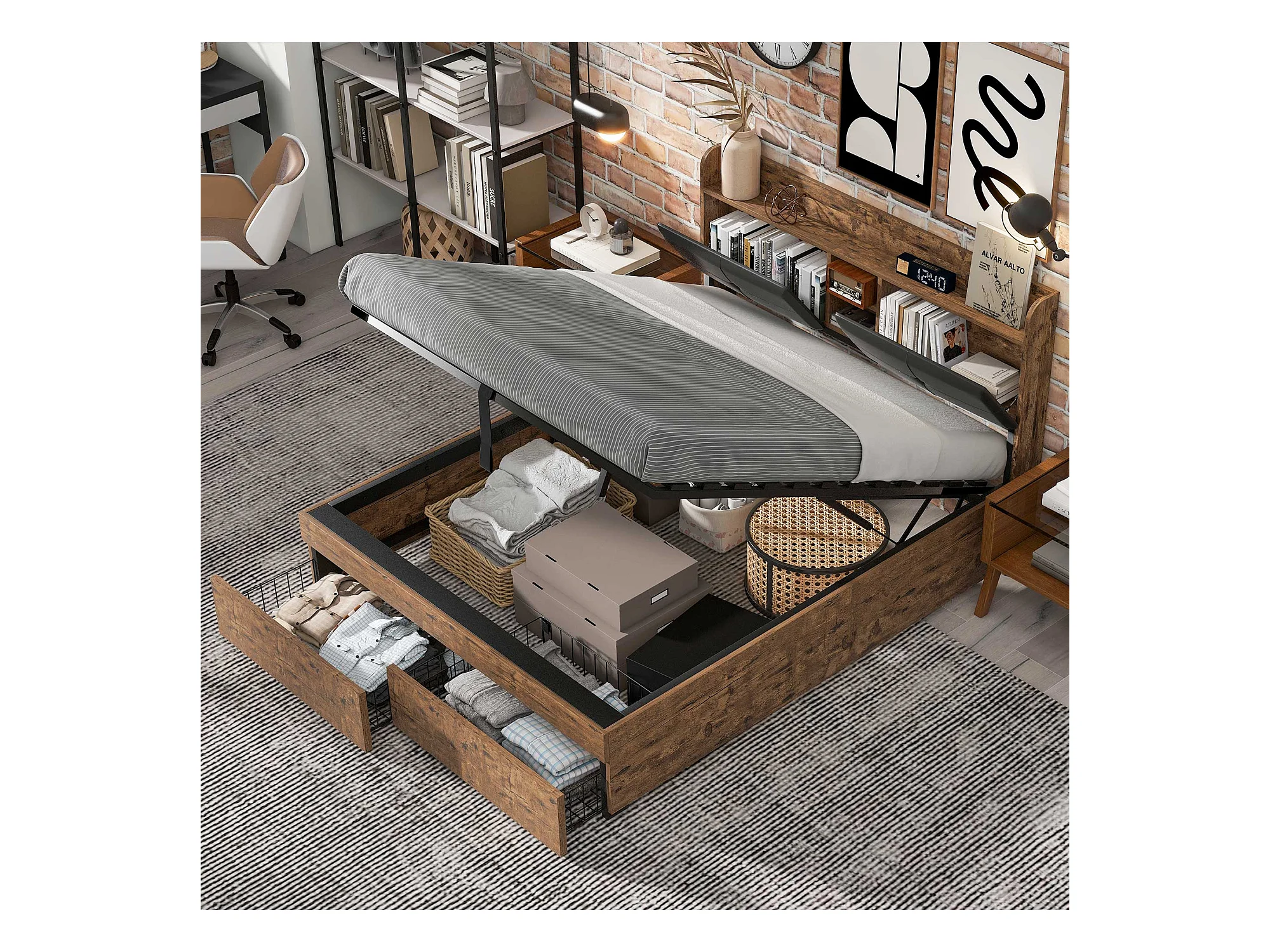 Lit métallique 140 x 200 cm, hydraulique, tête de lit avec rangement, sommier à lattes métalliques, pour adultes et enfants, bois + noir