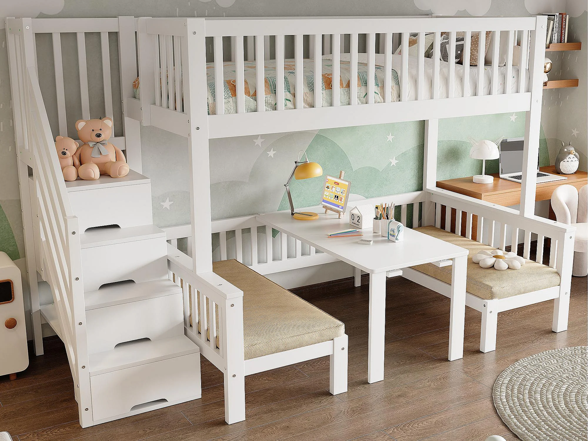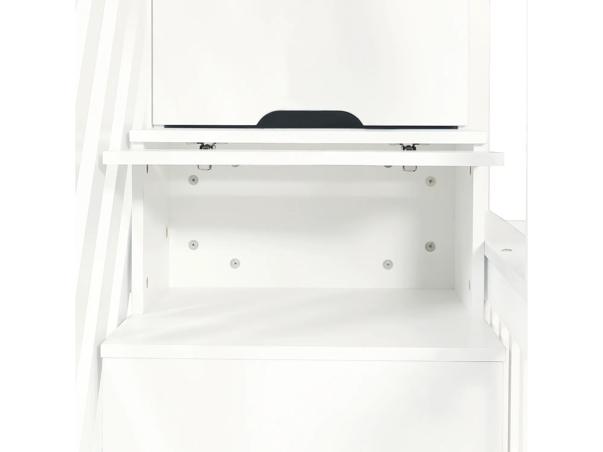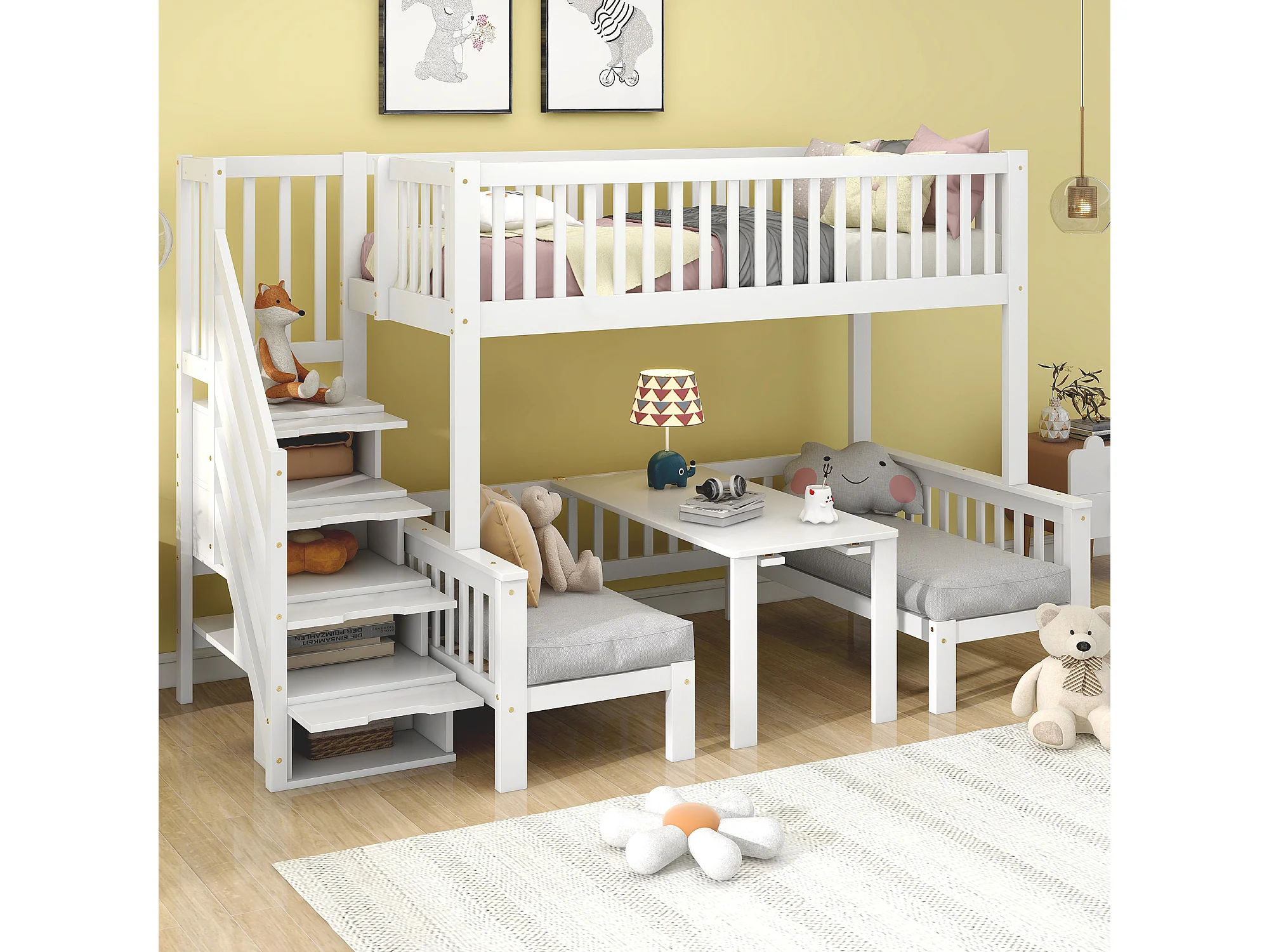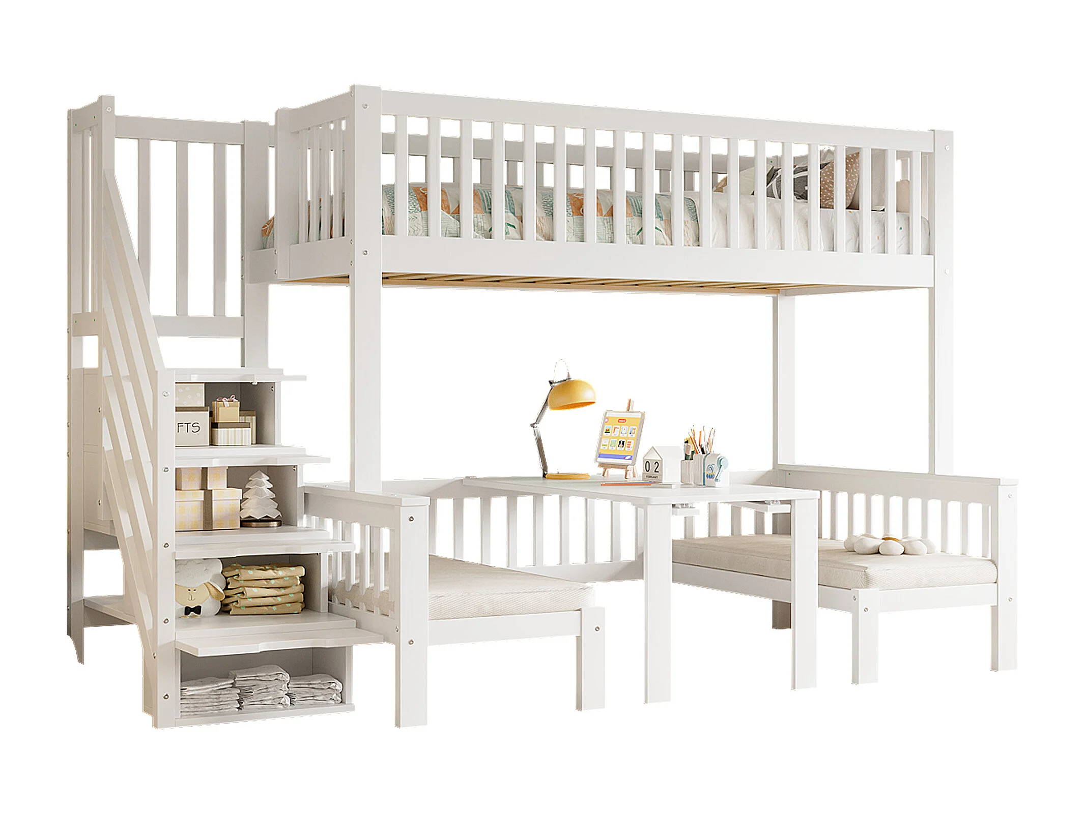 Lit mezzanie 90x200cm+120x200cm en pin massif avec table et canapé + sommiers à lattes - Blanc