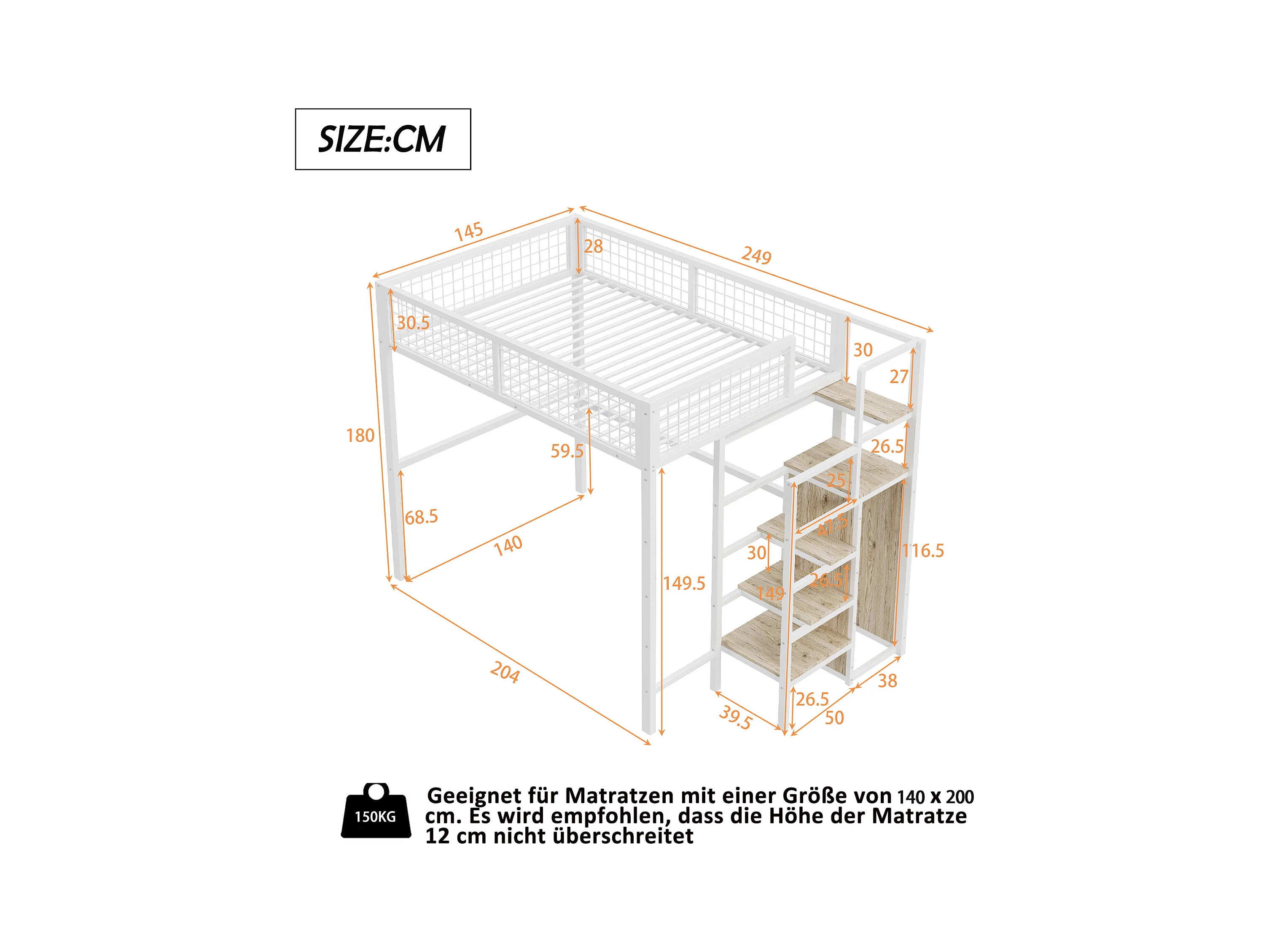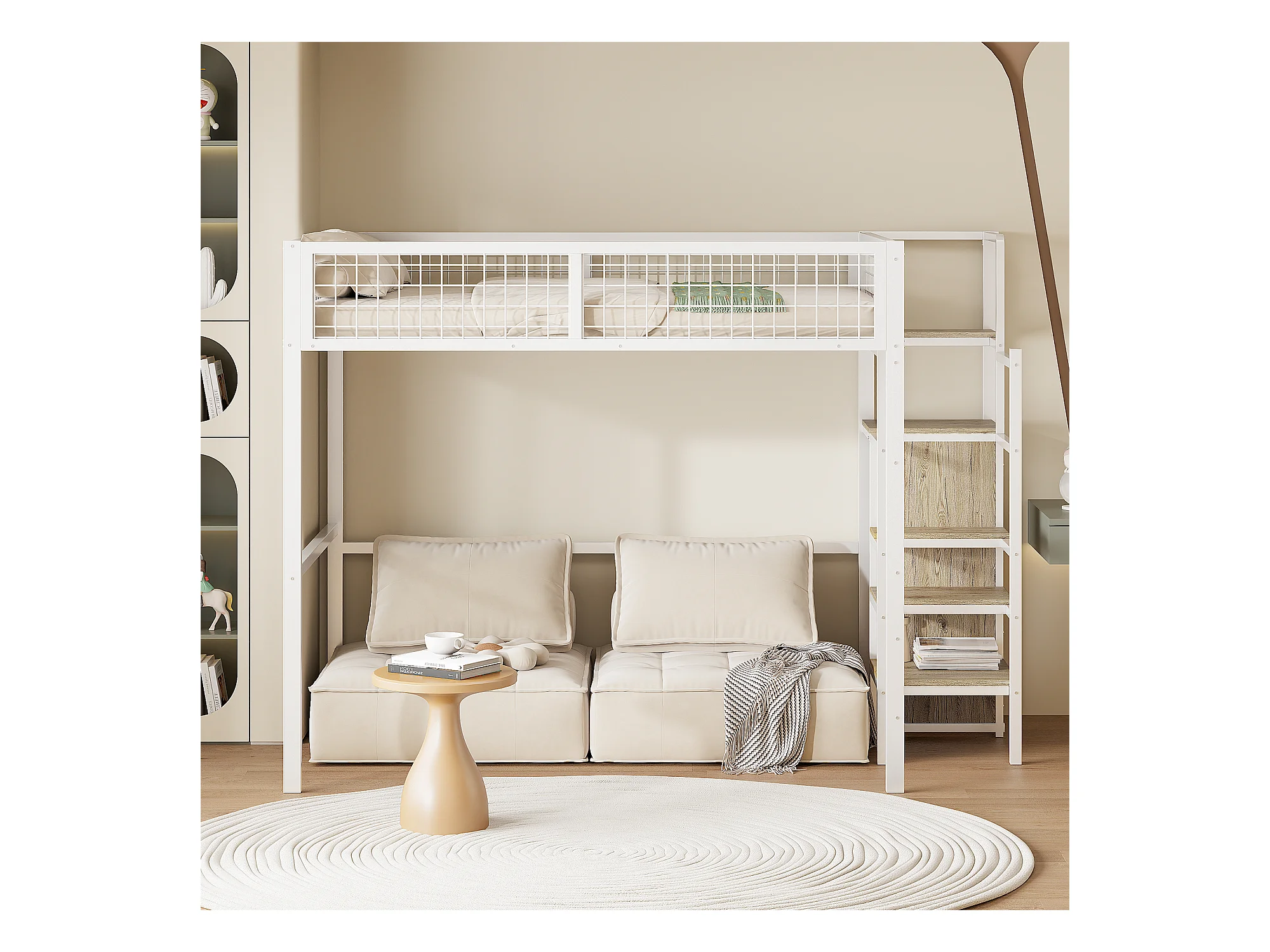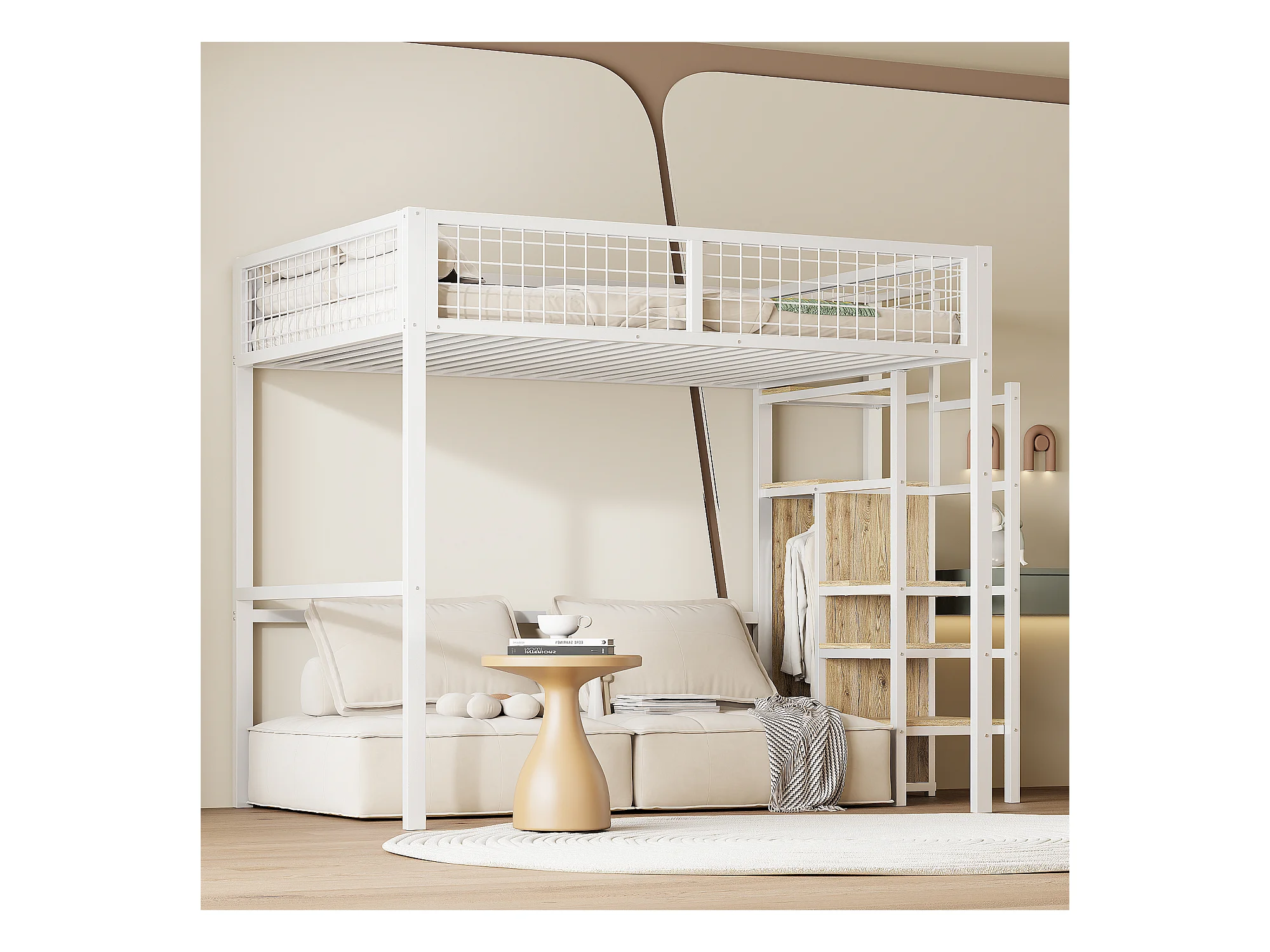 Lit mezzanine 140 x 200 cm avec armoir et échelle - Métal et MDF - pour enfant - Blanc