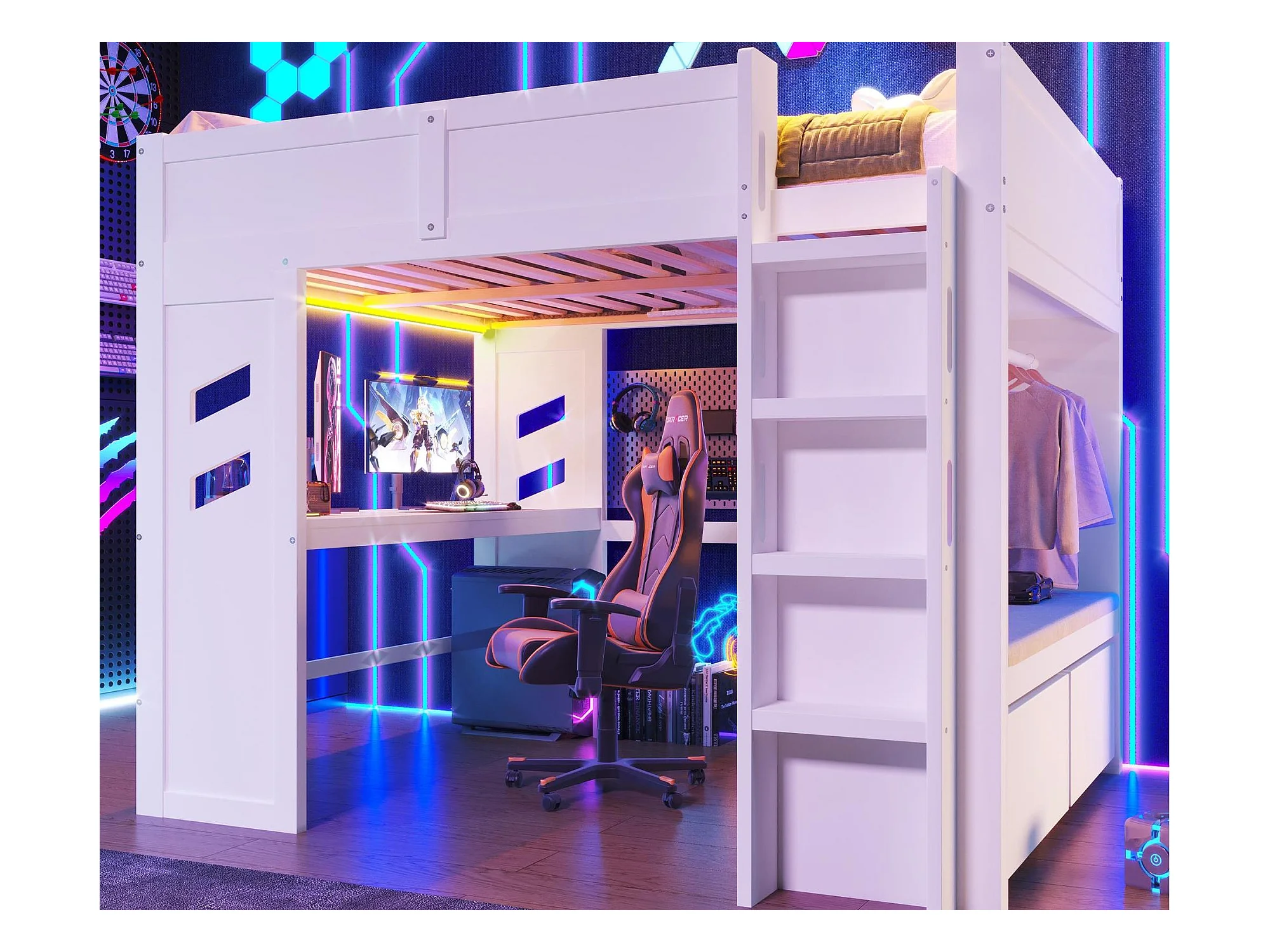 Lit mezzanine 140x200 cm - avec bureau - avec éclairage LED - avec 1 port USB - avec échelle + tiroir + étendoir - Blanc