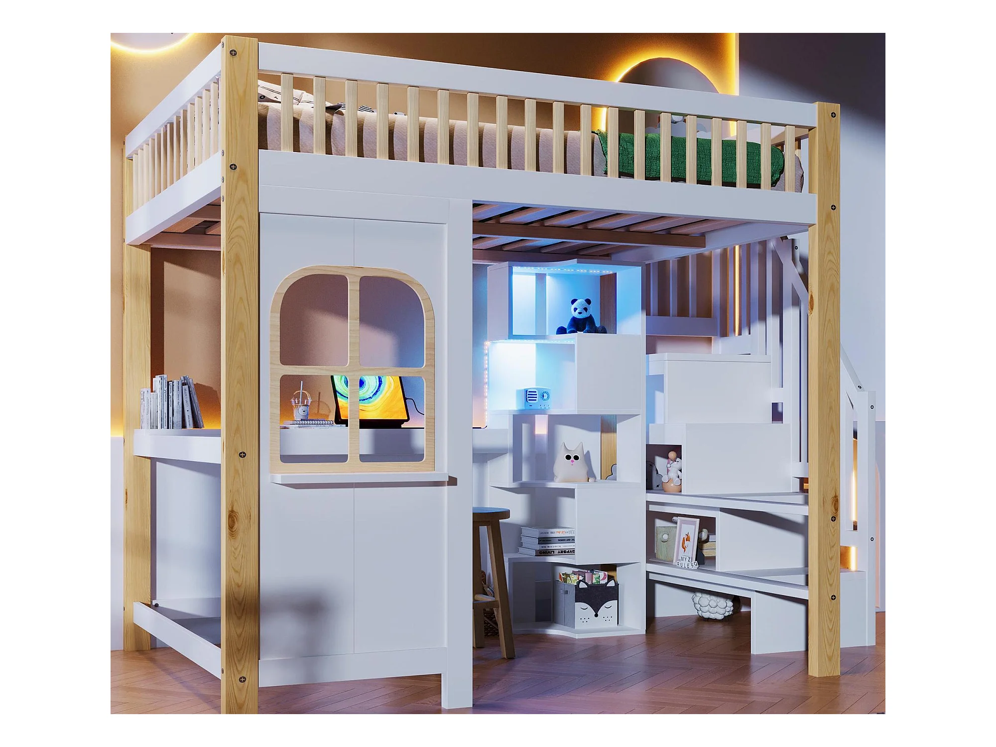 Lit mezzanine 140x200 cm - avec éclairage LED - avec échelle de rangement - avec bureau + prise - coloris blanc + naturel (matelas non inclus)
